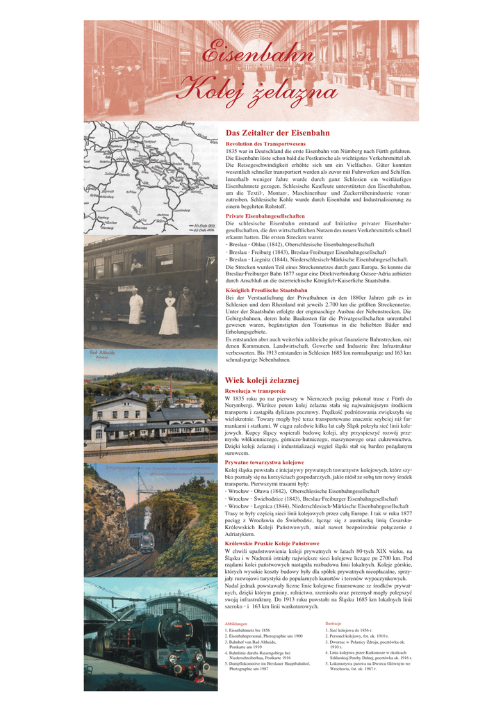 Eisenbahn Kolej ¿elazna Das Zeitalter der Eisenbahn Revolution des Transportwesens 1835 war in Deutschland die erste Eisenbahn von Nürnberg nach Fürth gefahren. Die Eisenbahn löste schon bald die Postkutsche als wichtigstes Verkehrsmittel ab. Die Reisegeschwindigkeit erhöhte sich um ein Vielfaches. Güter konnten wesentlich schneller transportiert werden als zuvor mit Fuhrwerken und Schiffen. Innerhalb weniger Jahre wurde durch ganz Schlesien ein weitläufiges Eisenbahnnetz gezogen. Schlesische Kaufleute unterstützten den Eisenbahnbau, um die Textil-, Montan-, Maschinenbau- und Zuckerrübenindustrie voranzutreiben. Schlesische Kohle wurde durch Eisenbahn und Industrialisierung zu einem begehrten Rohstoff. Private Eisenbahngesellschaften Die schlesische Eisenbahn entstand auf Initiative privater Eisenbahngesellschaften, die den wirtschaftlichen Nutzen des neuen Verkehrsmittels schnell erkannt hatten. Die ersten Strecken waren: - Breslau - Ohlau (1842), Oberschlesische Eisenbahngesellschaft - Breslau - Freiburg (1843), Breslau-Freiburger Eisenbahngesellschaft - Breslau - Liegnitz (1844), Niederschlesisch-Märkische Eisenbahngesellschaft. Die Strecken wurden Teil eines Streckennetzes durch ganz Europa. So konnte die Breslau-Freiburger Bahn 1877 sogar eine Direktverbindung Ostsee-Adria anbieten durch Anschluß an die österreichische Königlich-Kaiserliche Staatsbahn. Königlich Preußische Staatsbahn Bei der Verstaatlichung der Privatbahnen in den 1880er Jahren gab es in Schlesien und dem Rheinland mit jeweils 2.700 km die größten Streckennetze. Unter der Staatsbahn erfolgte der engmaschige Ausbau der Nebenstrecken. Die Gebirgsbahnen, deren hohe Baukosten für die Privatgesellschaften unrentabel gewesen waren, begünstigten den Tourismus in die beliebten Bäder und Erholungsgebiete. Es entstanden aber auch weiterhin zahlreiche privat finanzierte Bahnstrecken, mit denen Kommunen, Landwirtschaft, Gewerbe und Industrie ihre Infrastruktur verbesserten. Bis 1913 entstanden in Schlesien 1685 km normalspurige und 163 km schmalspurige Nebenbahnen. Wiek koleji ¿elaznej Rewolucja w transporcie W 1835 roku po raz pierwszy w Niemczech poci¹g pokona³ trase z Fürth do Norymbergi. Wkrótce potem kolej ¿elazna sta³a siê najwa¿niejszym œrodkiem transportu i zast¹pi³a dyli¿ans pocztowy. Prêdkoœæ podró¿owania zwiêkszy³a siê wielokrotnie. Towary mog³y byæ teraz transportowane znacznie szybciej ni¿ furmankami i statkami. W ci¹gu zaledwie kilku lat ca³y Œl¹sk pokry³a sieæ linii kolejowych. Kupcy œl¹scy wspierali budowê koleji, aby przyspieszyæ rozwój przemys³u w³ókienniczego, górniczo-hutniczego, maszynowego oraz cukrownictwa. Dziêki koleji ¿elaznej i industrializacji wêgiel œl¹ski sta³ siê bardzo po¿¹danym surowcem. Prywatne towarzystwa kolejowe Kolej œl¹ska powsta³a z inicjatywy prywatnych towarzystw kolejowych, które szybko pozna³y siê na korzyœciach gospodarczych, jakie niós³ ze sob¹ ten nowy œrodek transportu. Pierwszymi trasami by³y: - Wroc³aw - O³awa (1842), Oberschlesische Eisenbahngesellschaft - Wroc³aw - Œwiebodzice (1843), Breslau-Freiburger Eisenbahngesellschaft - Wroc³aw - Legnica (1844), Niederschlesisch-Märkische Eisenbahngesellschaft Trasy te by³y czêœci¹ sieci linii kolejowych przez ca³¹ Europe. I tak w roku 1877 poci¹g z Wroc³awia do Œwiebodzic, ³¹cz¹c siê z austriack¹ lini¹ CesarskoKrólewskich Koleji Pañstwowych, mia³ nawet bezpoœrednie po³¹czenie z Adriatykiem. Królewskie Pruskie Koleje Pañstwowe W chwili upañstwowienia koleji prywatnych w latach 80-tych XIX wieku, na Œl¹sku i w Nadrenii istnia³y najwiêksze sieci kolejowe licz¹ce po 2700 km. Pod rz¹dami kolei pañstwowych nast¹pi³a rozbudowa linii lokalnych. Koleje górskie, których wysokie koszty budowy by³y dla spó³ek prywatnych nieop³acalne, sprzyja³y rozwojowi turystyki do popularnych kurortów i terenów wypoczynkowych. Nadal jednak powstawa³y liczne linie kolejowe finansowane ze œrodków prywatnych, dziêki którym gminy, rolnictwo, rzemios³o oraz przemys³ mog³y polepszyæ swoj¹ infrastrukturê. Do 1913 roku powsta³o na Œl¹sku 1685 km lokalnych linii szeroko - i 163 km linii waskotorowych. Abbildungen 1. Eisenbahnnetz bis 1856 2. Eisenbahnpersonal, Photographie um 1900 3. Bahnhof von Bad Altheide, Postkarte um 1910 4. Bahnlinie durchs Riesengebirge bei Niederschreiberhau, Postkarte 1916 5. Dampflokomotive im Breslauer Hauptbahnhof, Photographie um 1987 Ilustracje 1. Sieæ kolejowa do 1856 r. 2. Personel kolejowy, fot. ok. 1910 r. 3. Dworzec w Polanicy Zdroju, pocztówka ok. 1910 r. 4. Linia kolejowa przez Karkonosze w okolicach Szklarskiej Poreby Dolnej, pocztówka ok. 1916 r. 5. Lokomotywa parowa na Dworcu Glównym we Wroc³awiu, fot. ok. 1987 r.