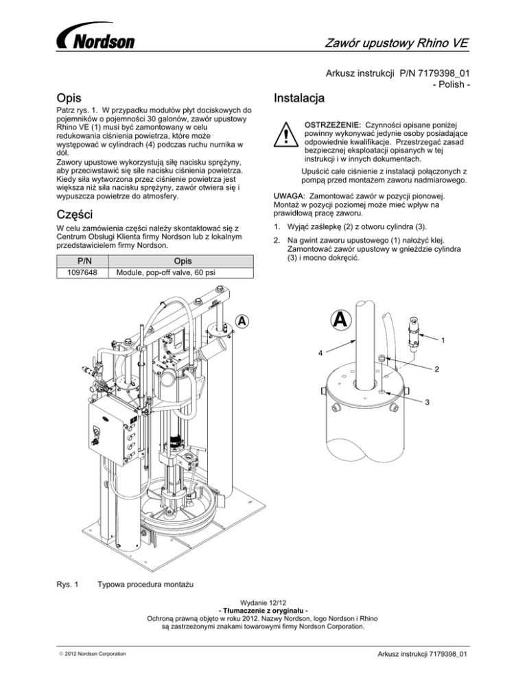 Zawór upustowy Rhino VE Arkusz instrukcji P/N 7179398_01 - Polish - Opis Instalacja Patrz rys. 1. W przypadku modułów płyt dociskowych do pojemników o pojemności 30 galonów, zawór upustowy Rhino VE (1) musi być zamontowany w celu redukowania ciśnienia powietrza, które może występować w cylindrach (4) podczas ruchu nurnika w dół. Zawory upustowe wykorzystują siłę nacisku sprężyny, aby przeciwstawić się sile nacisku ciśnienia powietrza. Kiedy siła wytworzona przez ciśnienie powietrza jest większa niż siła nacisku sprężyny, zawór otwiera się i wypuszcza powietrze do atmosfery. Części W celu zamówienia części należy skontaktować się z Centrum Obsługi Klienta firmy Nordson lub z lokalnym przedstawicielem firmy Nordson. P/N 1097648 Opis OSTRZEŻENIE: Czynności opisane poniżej powinny wykonywać jedynie osoby posiadające odpowiednie kwalifikacje. Przestrzegać zasad bezpiecznej eksploatacji opisanych w tej instrukcji i w innych dokumentach. Upuścić całe ciśnienie z instalacji połączonych z pompą przed montażem zaworu nadmiarowego. UWAGA: Zamontować zawór w pozycji pionowej. Montaż w pozycji poziomej może mieć wpływ na prawidłową pracę zaworu. 1. Wyjąć zaślepkę (2) z otworu cylindra (3). 2. Na gwint zaworu upustowego (1) nałożyć klej. Zamontować zawór upustowy w gnieździe cylindra (3) i mocno dokręcić. Module, pop‐off valve, 60 psi A A 1 4 2 3 Rys. 1 Typowa procedura montażu Wydanie 12/12 - Tłumaczenie z oryginału Ochroną prawną objęto w roku 2012. Nazwy Nordson, logo Nordson i Rhino są zastrzeżonymi znakami towarowymi firmy Nordson Corporation. E 2012 Nordson Corporation Arkusz instrukcji 7179398_01
