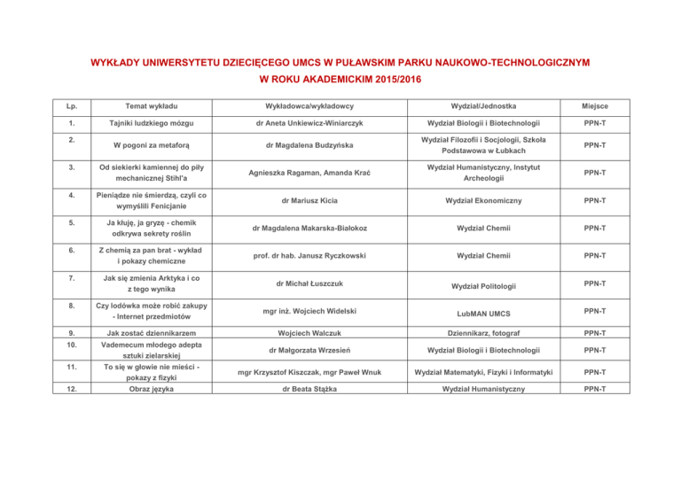 WYKŁADY UNIWERSYTETU DZIECIĘCEGO UMCS W PUŁAWSKIM PARKU NAUKOWO-TECHNOLOGICZNYM W ROKU AKADEMICKIM 2015/2016 Lp. Temat wykładu Wykładowca/wykładowcy Wydział/Jednostka Miejsce 1. Tajniki ludzkiego mózgu dr Aneta Unkiewicz-Winiarczyk Wydział Biologii i Biotechnologii PPN-T W pogoni za metaforą dr Magdalena Budzyńska 2. 3. Od siekierki kamiennej do piły mechanicznej Stihl'a 4. Pieniądze nie śmierdzą, czyli co wymyślili Fenicjanie 5. Ja kłuję, ja gryzę - chemik Podstawowa w Łubkach Wydział Humanistyczny, Instytut Archeologii PPN-T PPN-T dr Mariusz Kicia Wydział Ekonomiczny PPN-T dr Magdalena Makarska-Białokoz Wydział Chemii PPN-T prof. dr hab. Janusz Ryczkowski Wydział Chemii PPN-T dr Michał Łuszczuk Wydział Politologii PPN-T Czy lodówka może robić zakupy - Internet przedmiotów mgr inż. Wojciech Widelski LubMAN UMCS PPN-T odkrywa sekrety roślin 6. Z chemią za pan brat - wykład i pokazy chemiczne 7. Jak się zmienia Arktyka i co z tego wynika 8. Agnieszka Ragaman, Amanda Krać Wydział Filozofii i Socjologii, Szkoła 9. Jak zostać dziennikarzem Wojciech Walczuk Dziennikarz, fotograf PPN-T 10. Vademecum młodego adepta sztuki zielarskiej dr Małgorzata Wrzesień Wydział Biologii i Biotechnologii PPN-T 11. To się w głowie nie mieści pokazy z fizyki mgr Krzysztof Kiszczak, mgr Paweł Wnuk Wydział Matematyki, Fizyki i Informatyki PPN-T 12. Obraz języka dr Beata Stążka Wydział Humanistyczny PPN-T