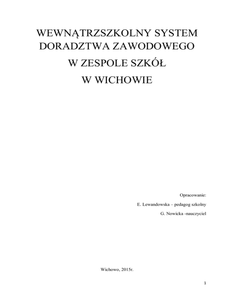 WEWNĄTRZSZKOLNY SYSTEM DORADZTWA ZAWODOWEGO W ZESPOLE SZKÓŁ W WICHOWIE Opracowanie: E. Lewandowska – pedagog szkolny G. Nowicka -nauczyciel Wichowo, 2015r. 1 Spis treści Wstęp …………………………………………………………………………………… … 3 I Podstawowe przepisy prawa polskiego i unijnego dotyczące doradztwa zawodowego … 4 II Podstawowe pojęcia…………………………………………………………………….... 5 III Funkcjonowanie wewnątrzszkolnego systemu doradztwa zawodowego w gimnazjum …. 6 IV Harmonogram działań w ramach WSDZ………………………………………………… 11 2 Wstęp Funkcjonowanie w nowoczesnym społeczeństwie wymaga aktywnych zachowań i umiejętności podejmowania trafnych decyzji. Rzeczywistość ekonomiczno – społeczno - polityczna wymusza nowe oczekiwania pracodawców wobec pracowników i wymaga ustawicznego uzupełniania wiedzy. Pożądanymi zachowaniami w różnych zawodach są: inicjatywa, zaangażowanie, elastyczność, samodzielność, a także mobilność i niezależność. Jednym z zadań gimnazjum jest przygotowanie młodzieży do aktywnego wchodzenia w życie gospodarcze, do świadomego stanowienia o sobie, wytyczania własnej drogi rozwoju poprzez aktywne wzmacnianie swoich mocnych stron, zainteresowań i uzdolnień. Tak więc niezbędne jest wyposażenie uczniów w umiejętność podejmowania odważnych, samodzielnych decyzji, uczenia się przez całe życie, radzenia sobie w sytuacjach kryzysowych oraz w wiedzę na temat systemu kształcenia, ofert szkół ponadgimnazjalnych, świata zawodów, a także struktury rynku pracy. Tym wyzwaniom próbuje sprostać Wewnątrzszkolny System Doradztwa Zawodowego, który stwarza uczniowi realną możliwość zdobycia wiedzy i umiejętności niezbędnych do odnalezienia swojego miejsca na drodze kariery zawodowej – poznania siebie i własnych predyspozycji zawodowych, zasad rządzących rynkiem pracy, uzyskania informacji o lokalnym rynku pracy i zaplanowania własnej kariery zawodowej. 3 I. PODSTAWOWE PRZEPISY PRAWA POLSKIEGO I UNIJNEGO DOTYCZĄCE DORADZTWA ZAWODOWEGO – regulujące kwestie udzielania pomocy w wyborze zawodu, kierunku kształcenia oraz wprowadzające doradztwo zawodowe do szkół: Memorandum kształcenia ustawicznego, uchwalone przez Komisję Europejską w 2000r. jako jedno z 6-ciu głównych założeń wymienia zalecenie profesjonalnej pomocy doradczej dla uczniów w zakresie planowania kariery zawodowej. Zdecydowana większość państw Unii Europejskiej już od dawna stosuje to zalecenie w praktyce. Rezolucja Rady Unii Europejskiej z 18 maja 2004r. – 9286/04 – dokument wydany przez Unię Europejską dotyczący poradnictwa zawodowego „wszyscy obywatele europy powinni mieć dostęp do usług związanych z poradnictwem, informacją zawodową i planowaniem kariery na każdym etapie swojego życia”. Strategia Rozwoju Kształcenia Ustawicznego do roku 2010 przyjęta przez Radę Ministrów 8 lipca 2003r. jako jeden z priorytetów uznaje tworzenie zasobów informacyjnych w zakresie kształcenia ustawicznego i rozwoju zasobów doradczych. Ustawa z dnia 7 września 1991r. o systemie oświaty (tekst jednolity: Dz. U z 1996r., Nr 67, poz. 329 ze zmianami) zobowiązuje placówki oświatowe do „przygotowania uczniów do wyboru zawodu i kierunku kształcenia”. Również ramowe statuty szkół ponadpodstawowych nakładają na dyrektorów i rady pedagogiczne „obowiązek organizacji wewnątrzszkolnego systemu poradnictwa zawodowego oraz zajęć związanych z wyborem kierunku kształcenia i zawodu”. Rozporządzenie Ministra Edukacji Narodowej i Sportu z dnia 7 stycznia 2003r. w sprawie zasad udzielania i organizacji pomocy psychologiczno-pedagogicznej w publicznych przedszkolach, szkołach i placówkach (Dz. U, Nr 11, poz. 114). Rozporządzenie MEN i S z dnia 13 czerwca 2003r., w sprawie rodzajów, organizacji oraz sposobu działania publicznych placówek kształcenia ustawicznego i publicznych placówek kształcenia praktycznego, w tym publicznych ośrodków dokształcania i doskonalenia zawodowego (Dz. U z 2003r., Nr 132, poz. 1225). Rozporządzenie MEN z dnia 23 grudnia 2008r., w sprawie podstawy programowej wychowania przedszkolnego oraz kształcenia ogólnego w poszczególnych typach szkół (Dz. U Nr 4, poz. 17). Rozporządzenie MEN i S z dnia 7 lutego 2012r., w sprawie ramowych statutów placówek publicznych (Dz. 4 II. PODSTAWOWE POJĘCIA Poradnictwo zawodowe Długofalowe i wieloetapowe działania wychowawcze, towarzyszące jednostce trakcie jej rozwoju zawodowego. obejmuje ono udzielanie pomocy uczniom i dorosłym w planowaniu, tworzeniu i rozwoju kariery zawodowej, przynoszącej jednostce satysfakcję i zawodowy sukces. ( Ogólne zasady funkcjonowania poradnictwa zawodowego w systemie urzędów pracy - 1996). Orientacja zawodowa Działania wychowawcze szkoły, rodziców i innych osób, grup i instytucji mające na celu przygotowanie młodzieży do planowania kariery zawodowej, której ważnym elementem jest podejmowanie kolejnych decyzji wyboru zawodu i szkoły. Orientacja zawodowa w gimnazjum wdrażana jest na podstawie programów nauczania wszystkich przedmiotów, będących naturalnym źródłem wiedzy o zawodach.(U. M. Fiała „ Nowe trendy w orientacji i doradztwie zawodowym w gimnazjum” Poznań 2009r.) Doradztwo zawodowe Świadczenie pomocy w dokonywaniu kolejnych decyzji wyboru szkoły, zawodu lub pracy w formie indywidualnej porady zawodowej. ( U. M. Fiała, Nowe trendy w orientacji i doradztwie zawodowym w gimnazjum” Poznań 2009r.). Jest więc procesem pomagania ludziom w poznawaniu własnej osobowości i rozumieniu siebie samego w ramach opracowania m.in. indywidualnego planu działania. Orientacja zawodowa i doradztwo zawodowe wchodzą w zakres edukacji szkolnej, której celem jest prawidłowe przygotowanie młodzieży do podjęcia decyzji wyboru zawodu i odpowiedniej szkoły. Doradc