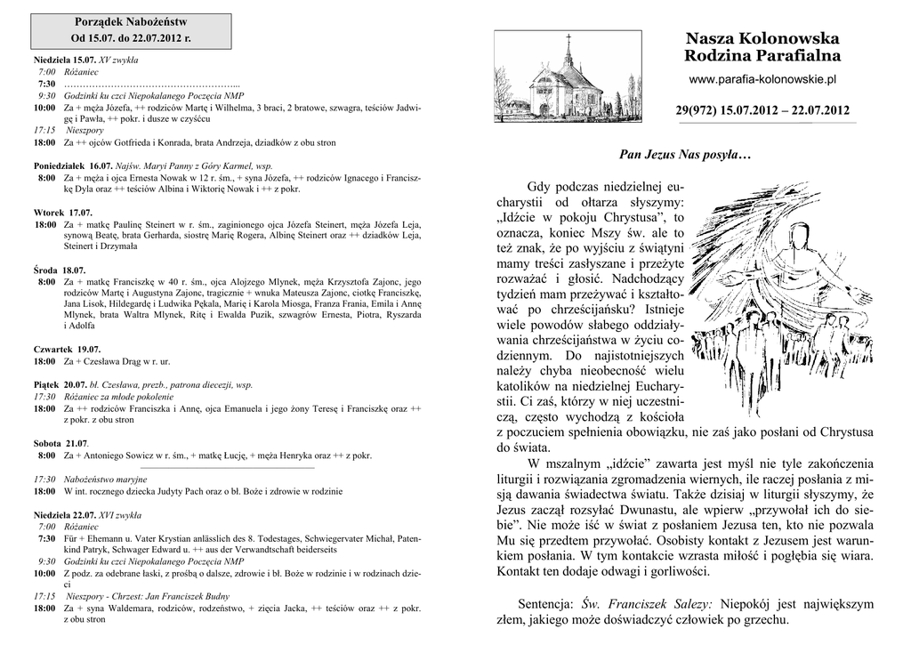 Porządek Nabożeństw Od 15.07. do 22.07.2012 r. Niedziela 15.07. XV zwykła 7:00 Różaniec 7:30 ………………………………………………... 9:30 Godzinki ku czci Niepokalanego Poczęcia NMP 10:00 Za + męża Józefa, ++ rodziców Martę i Wilhelma, 3 braci, 2 bratowe, szwagra, teściów Jadwigę i Pawła, ++ pokr. i dusze w czyśćcu 17:15 Nieszpory 18:00 Za ++ ojców Gotfrieda i Konrada, brata Andrzeja, dziadków z obu stron Poniedziałek 16.07. Najśw. Maryi Panny z Góry Karmel, wsp. 8:00 Za + męża i ojca Ernesta Nowak w 12 r. śm., + syna Józefa, ++ rodziców Ignacego i Franciszkę Dyla oraz ++ teściów Albina i Wiktorię Nowak i ++ z pokr. Wtorek 17.07. 18:00 Za + matkę Paulinę Steinert w r. śm., zaginionego ojca Józefa Steinert, męża Józefa Leja, synową Beatę, brata Gerharda, siostrę Marię Rogera, Albinę Steinert oraz ++ dziadków Leja, Steinert i Drzymała Środa 18.07. 8:00 Za + matkę Franciszkę w 40 r. śm., ojca Alojzego Mlynek, męża Krzysztofa Zajonc, jego rodziców Martę i Augustyna Zajonc, tragicznie + wnuka Mateusza Zajonc, ciotkę Franciszkę, Jana Lisok, Hildegardę i Ludwika Pękala, Marię i Karola Miosga, Franza Frania, Emila i Annę Mlynek, brata Waltra Mlynek, Ritę i Ewalda Puzik, szwagrów Ernesta, Piotra, Ryszarda i Adolfa Czwartek 19.07. 18:00 Za + Czesława Drąg w r. ur. Piątek 20.07. bł. Czesława, prezb., patrona diecezji, wsp. 17:30 Różaniec za młode pokolenie 18:00 Za ++ rodziców Franciszka i Annę, ojca Emanuela i jego żony Teresę i Franciszkę oraz ++ z pokr. z obu stron Sobota 21.07. 8:00 Za + Antoniego Sowicz w r. śm., + matkę Łucję, + męża Henryka oraz ++ z pokr. ————————————–—————— 17:30 Nabożeństwo maryjne 18:00 W int. rocznego dziecka Judyty Pach oraz o bł. Boże i zdrowie w rodzinie Niedziela 22.07. XVI zwykła 7:00 Różaniec 7:30 Für + Ehemann u. Vater Krystian anlässlich des 8. Todestages, Schwiegervater Michał, Patenkind Patryk, Schwager Edward u. ++ aus der Verwandtschaft beiderseits 9:30 Godzinki ku czci Niepokalanego Poczęcia NMP 10:00 Z podz. za odebrane łaski, z prośbą o dalsze, zdrowie i bł. Boże w rodzinie i w rodzinach dzieci 17:15 Nieszpory - Chrzest: Jan Franciszek Budny 18:00 Za + syna Waldemara, rodziców, rodzeństwo, + zięcia Jacka, ++ teściów oraz ++ z pokr. z obu stron Nasza Kolonowska Rodzina Parafialna www.parafia-kolonowskie.pl 29(972) 15.07.2012 – 22.07.2012 Pan Jezus Nas posyła… Gdy podczas niedzielnej eucharystii od ołtarza słyszymy: „Idźcie w pokoju Chrystusa”, to oznacza, koniec Mszy św. ale to też znak, że po wyjściu z świątyni mamy treści zasłyszane i przeżyte rozważać i głosić. Nadchodzący tydzień mam przeżywać i kształtować po chrześcijańsku? Istnieje wiele powodów słabego oddziaływania chrześcijaństwa w życiu codziennym. Do najistotniejszych należy chyba nieobecność wielu katolików na niedzielnej Eucharystii. Ci zaś, którzy w niej uczestniczą, często wychodzą z kościoła z poczuciem spełnienia obowiązku, nie zaś jako posłani od Chrystusa do świata. W mszalnym „idźcie” zawarta jest myśl nie tyle zakończenia liturgii i rozwiązania zgromadzenia wiernych, ile raczej posłania z misją dawania świadectwa światu. Także dzisiaj w liturgii słyszymy, że Jezus zaczął rozsyłać Dwunastu, ale wpierw „przywołał ich do siebie”. Nie może iść w świat z posłaniem Jezusa ten, kto nie pozwala Mu się przedtem przywołać. Osobisty kontakt z Jezusem jest warunkiem posłania. W tym kontakcie wzrasta miłość i pogłębia się wiara. Kontakt ten dodaje odwagi i gorliwości. Sentencja: Św. Franciszek Salezy: Niepokój jest największym złem, jakiego może doświadczyć człowiek po grzechu. 29/2012 Najświętsza Maryja Panna z góry Karmel Szkaplerz karmelitański – 16 Lipca W XII w. do Europy przybyli, prześladowani przez Turków, duchowi synowie Eliasza, prowadzący życie kontemplacyjne na Karmelu. Szczególnie szybko zakon rozwijał się w Anglii, do czego przyczynił się m.in. wielki czciciel Maryi, św. Szymon Stock, szósty przełożony generalny zakonu karmelitów. Wielokrotnie błagał on Maryję o ratunek dla zakonu. W czasie jednej z modlitw w Cambridge, w nocy z 15 na 16 lipca 1251 r., ujrzał Bożą Rodzicielkę w otoczeniu Aniołów. Podała mu Ona brązową szatę, wypowiadając jednocześnie słowa: Przyjmij, synu, szkaplerz twego zakonu, jako znak mego braterstwa, przywilej dla ciebie i wszystkich karmelitów. Kto w nim umrze, nie zazna ognia piekielnego. Oto znak zbawienia, ratunek w niebezpieczeństwach, przymierze pokoju i wiecznego zobowiązania. Szymon Stock z radością przyjął ten dar i nakazał rozpowszechnienie go w całej rodzinie zakonnej, a z czasem również w świecie. W XIV wieku Maryja objawiła się papieżowi Janowi XXII, polecając mu w opiekę „Jej zakon” karmelitański. Obiecała wówczas obfite łaski i zbawienie osobom należącym do zakonu i wiernie wypełniającym śluby. Obiecała również wszystkim, którzy będą nosić szkaplerz, że wybawi ich z czyśćca w pierwszą sobotę po ich śmierci. Cały szereg papieży wypowiedziało się z pochwałami o tej formie czci Najświętszej Maryi i uposażyło to nabożeństwo licznymi odpustami. Wydali oni około 40 encyklik i innych pism urzędowych w tej sprawie. Do spopularyzowania szkaplerza karmelitańskiego przyczyniło się przekonanie, że należących do bractwa szkaplerza Maryja wybawi z czyśćca. Tę wiarę po części potwierdzili papieże swoim najwyższym autorytetem namiestników Chrystusa. Takie orzeczenie wydał jako pierwszy Paweł V 29 czerwca 1609 r., Benedykt XIV je powtórzył (+ 1758). Podobnie wypowiedział się papież Pius XII. We Włoszech jest kilkaset kościołów Matki Bożej z Góry Karmel, w Polsce blisko setka. Wiele obrazów i figur pod tym wezwaniem zasłynęło cudami, tak iż są miejscami pątniczymi. Niektóre z nich 