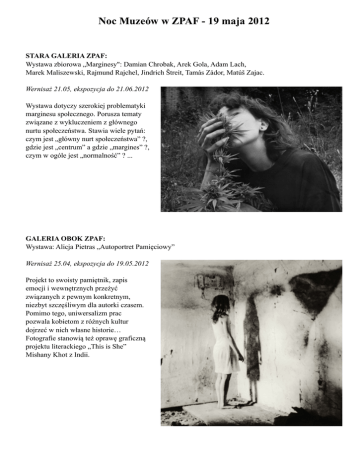 Noc Muzeów w ZPAF - 19 maja 2012 STARA GALERIA ZPAF: Wystawa zbiorowa „Marginesy": Damian Chrobak, Arek Gola, Adam Lach, Marek Maliszewski, Rajmund Rajchel, Jindrich Štreit, Tamás Zádor, Matúš Zajac. Wernisaż 21.05, ekspozycja do 21.06.2012 Wystawa dotyczy szerokiej problematyki marginesu społecznego. Porusza tematy związane z wykluczeniem z głównego nurtu społeczeństwa. Stawia wiele pytań: czym jest „główny nurt społeczeństwa” ?, gdzie jest „centrum” a gdzie „margines” ?, czym w ogóle jest „normalność” ? ... GALERIA OBOK ZPAF: Wystawa: Alicja Pietras „Autoportret Pamięciowy” Wernisaż 25.04, ekspozycja do 19.05.2012 Projekt to swoisty pamiętnik, zapis emocji i wewnętrznych przeżyć związanych z pewnym konkretnym, niezbyt szczęśliwym dla autorki czasem. Pomimo tego, uniwersalizm prac pozwala kobietom z różnych kultur dojrzeć w nich własne historie… Fotografie stanowią też oprawę graficzną projektu literackiego „This is She” Mishany Khot z Indii. WYDARZENIA TOWARZYSZĄCE Nocy Muzeów w ZPAF - 19 maja 2012 w godzinach 19 - 24: „Magia światła w fotografii” - już etymologia nazwy podkreśla fakt, że światło jest podstawowym tworzywem powstającego obrazu. Wielu fotografów ceniących walory dokumentalne zdaje się po prostu na zastane oświetlenie, rejestruje rzeczywistość wprawdzie w specyficznej formie, ale nie odbiegając zbyt daleko od naszych wzrokowych doświadczeń… Tymczasem wielu fotografów posługuje się w zupełnie odmienny sposób światłem w swych fotografiach. Eksperymentuje, szuka możliwości wykorzystania lub aranżowania innego oświetlenia do tworzenia własnej, subiektywnej, czasem magicznej, fotograficznej rzeczywistości… Próbkę takich działań chcemy przedstawić w tę niepowtarzalną noc w galeriach ZPAF. 1* Prezentacje i spotkania z autorami: 19-20 Piotr Filutowski: „Magiczne opowieści”. "Magiczne opowieści" Petera Raw'a (to pseudonim artystyczny autora), który patrzy na świat poprzez różowe okulary a fotografia cyfrowa mu to ułatwia. Jest to zestaw cykli i pojedynczych zdjęć z ostatnich 5 lat jego fascynacji sztuką, jaką jest fotografia. Wędrówki Niebieskiego Trabanta, kolorowy Mały Książę, czy zabawne Funfarafa to niektóre z barwnych opowieści ... 20-21 Adam Łach Lunaris: „Luna-grafia”. Fotografie wykonane przy świetle księżyca urzekają niezwykłym klimatem. Pełnia księżyca. Puste pole, łąka, polana z dala od miasta. W rozjaśnianych zimnym blaskiem ciemnościach snują się niewyraźne postaci. Efekt zdjęć wykonywanych podczas pełni księżyca w przestrzeniach pozbawionych innych źródeł światła jest w dużej mierze nieprzewidywalny ale to właśnie stanowi o magii, konieczności oparcia się na intuicji „malującego w kadrze” autora... 21-22 Wojtek Walkiewicz: „Wiosenna bujność traw” i „Płynna granica”. Fotografie wykonane na barwnym negatywie, naświetlanym wielokrotnie przez filtry selektywne R,G,B. Autor znajdując po swojemu piękno, które zachwyca i inspiruje, tworzy obrazy w swojej skali, wykorzystując ruch i rytm, kontrast, głębię ostrości, rozszczepienie światła. Jego fotografie są zapisem ulotnego zjawiska przyrodniczego a jednak zobaczonego i pokazanego inaczej, odrobinę magicznie… 22-23 Prot Jarnuszkiewicz: „Nieobecność” ... Poczułem, że kilka wykonanych zdjęć bez ludzi ma dla mnie większy potencjał i siłę mówienia o CZŁOWIEKU niż zrealizowane portrety ... W realizacji znalazło swoje odbicie przekonanie o wartości drogi ku prostocie, ku pełnemu zaufaniu widzowi. O czerpaniu siły nie z samego nadawania wartości estetycznych przedstawieniu, ale przede wszystkim z zastygłej w czasie tajemnicy narracyjnej. To właśnie do poszukiwania TAJEMNICY zapraszam ... 23-24 Tomasz Budzyński: „Pod-czerwienią”. Zdjęcia w podczerwieni są jednym ze sposobów poszukiwania innego wymiaru w fotografii tego wszystkiego, czego gołym okiem nie widać, co wzrokowo nie jest dostępne obserwacji w naszej codzienności, a co istnieje i stanowi element rzeczywistości. Specyfika odmiennego światła sprawia, że zdjęcia znanych nam miejsc ukazują inną, jakby ukrytą ich naturę - obrazy „świata nieoczywistego”. 2* Prezentacja multimedialna „W świetle niezastanym” złożona z prac słuchaczy i absolwentów warszawskiego Studium Fotografii ZPAF. Projekcja non-stop od godziny 20 w bramie pomiędzy związkowymi galeriami na Placu Zamkowym. 3* Prezentacja prac autorów uczestniczących w konsultacjach organizowanych w ramach Programów Edukacyjnych OW ZPAF Non-stop na ekranie TV w hallu wejściowym 16 marca 2012 : Janusz Lirski [ [email protected]]