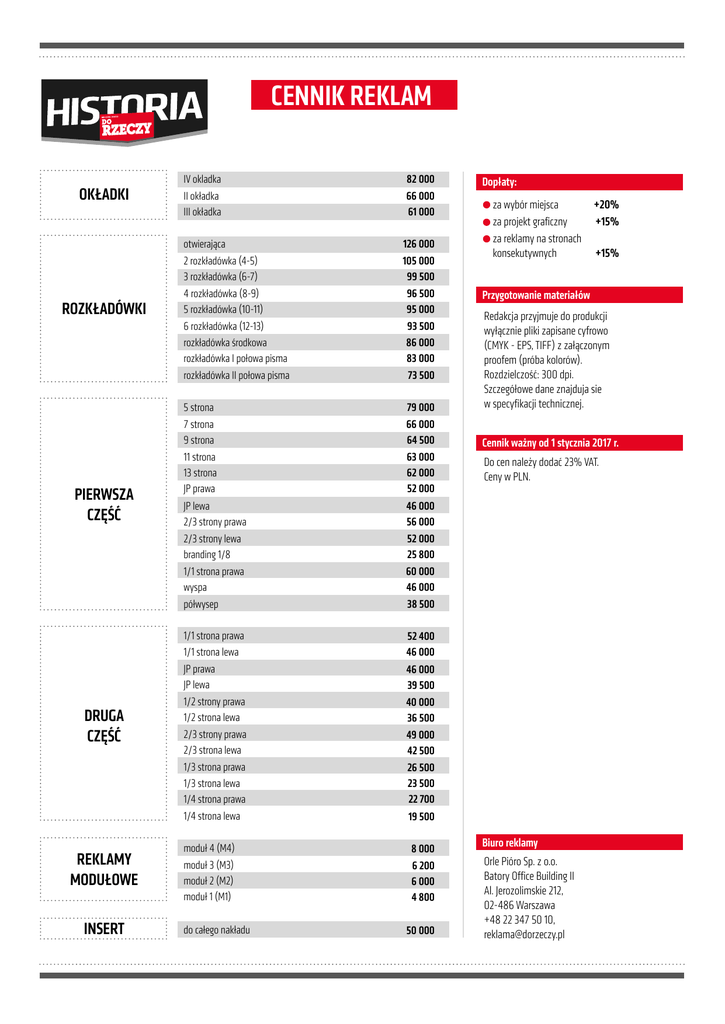 cennik reklam okładki IV okladka II okładka III okładka 82 000 66 000 61 000 otwierająca 2 rozkładówka (4-5) 3 rozkładówka (6-7) 4 rozkładówka (8-9) 5 rozkładówka (10-11) 6 rozkładówka (12-13) rozkładówka środkowa rozkładówka I połowa pisma rozkładówka II połowa pisma 126 000 105 000 99 500 96 500 95 000 93 500 86 000 83 000 73 500 Pierwsza część 5 strona 7 strona 9 strona 11 strona 13 strona JP prawa JP lewa 2/3 strony prawa 2/3 strony lewa branding 1/8 1/1 strona prawa wyspa półwysep 79 000 66 000 64 500 63 000 62 000 52 000 46 000 56 000 52 000 25 800 60 000 46 000 38 500 druga część 1/1 strona prawa 1/1 strona lewa JP prawa JP lewa 1/2 strony prawa 1/2 strona lewa 2/3 strony prawa 2/3 strona lewa 1/3 strona prawa 1/3 strona lewa 1/4 strona prawa 1/4 strona lewa 52 400 46 000 46 000 39 500 40 000 36 500 49 000 42 500 26 500 23 500 22 700 19 500 rozkładówki reklamy modułowe insert moduł 4 (M4) moduł 3 (M3) moduł 2 (M2) moduł 1 (M1) do całego nakładu 8 000 6 200 6 000 4 800 50 000 Dopłaty: za wybór miejsca za projekt graficzny za reklamy na stronach konsekutywnych +20% +15% +15% Przygotowanie materiałów Redakcja przyjmuje do produkcji wyłącznie pliki zapisane cyfrowo (CMYK - EPS, TIFF) z załączonym proofem (próba kolorów). Rozdzielczość: 300 dpi. Szczegółowe dane znajduja sie w specyfikacji technicznej. Cennik ważny od 1 stycznia 2017 r. Do cen należy dodać 23% VAT. Ceny w PLN. Biuro reklamy Orle Pióro Sp. z o.o. Batory Office Building II Al. Jerozolimskie 212, 02-486 Warszawa +48 22 347 50 10, [email protected]