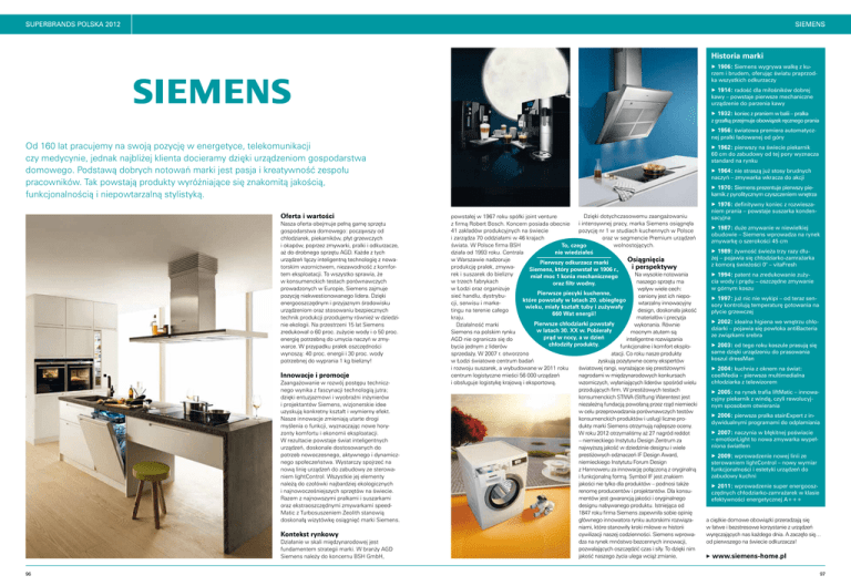 SUPERBRANDS POLSKA 2012 siemens Historia marki 1906: Siemens wygrywa walkę z kurzem i brudem, oferując światu praprzodka wszystkich odkurzaczy 1914: radość dla miłośników dobrej kawy – powstaje pierwsze mechaniczne urządzenie do parzenia kawy 1932: koniec z praniem w balii – pralka z grzałką przejmuje obowiązek ręcznego prania 1956: światowa premiera automatycznej pralki ładowanej od góry Od 160 lat pracujemy na swoją pozycję w energetyce, telekomunikacji czy medycynie, jednak najbliżej klienta docieramy dzięki urządzeniom gospodarstwa domowego. Podstawą dobrych notowań marki jest pasja i kreatywność zespołu pracowników. Tak powstają produkty wyróżniające się znakomitą jakością, funkcjonalnością i niepowtarzalną stylistyką. Oferta i wartości Nasza oferta obejmuje pełną gamę sprzętu gospodarstwa domowego: począwszy od chłodziarek, piekarników, płyt grzewczych i okapów, poprzez zmywarki, pralki i odkurzacze, aż do drobnego sprzętu AGD. Każde z tych urządzeń łączy inteligentną technologię z nowatorskim wzornictwem, niezawodność z komfortem eksploatacji. To wszystko sprawia, że w konsumenckich testach porównawczych prowadzonych w Europie, Siemens zajmuje pozycję niekwestionowanego lidera. Dzięki energooszczędnym i przyjaznym środowisku urządzeniom oraz stosowaniu bezpiecznych technik produkcji przodujemy również w dziedzinie ekologii. Na przestrzeni 15 lat Siemens zredukował o 60 proc. zużycie wody i o 50 proc. energię potrzebną do umycia naczyń w zmywarce. W przypadku pralek oszczędności wynoszą: 40 proc. energii i 30 proc. wody potrzebnej do wyprania 1 kg bielizny! Innowacje i promocje Zaangażowanie w rozwój postępu technicznego wynika z fascynacji technologią jutra; dzięki entuzjazmowi i wyobraźni inżynierów i projektantów Siemens, wizjonerskie idee uzyskują konkretny kształt i wymierny efekt. Nasze innowacje zmieniają utarte drogi myślenia o funkcji, wyznaczając nowe horyzonty komfortu i ekonomii eksploatacji. W rezultacie powstaje świat inteligentnych urządzeń, doskonale dostosowanych do potrzeb nowoczesnego, aktywnego i dynamicznego społeczeństwa. Wystarczy spojrzeć na nową linię urządzeń do zabudowy ze sterowaniem lightControl. Wszystkie jej elementy należą do czołówki najbardziej ekologicznych i najnowocześniejszych sprzętów na świecie. Razem z najnowszymi pralkami i suszarkami oraz ekstraoszczędnymi zmywarkami speedMatic z Turbosuszeniem Zeolith stanowią doskonałą wizytówkę osiągnięć marki Siemens. Kontekst rynkowy Działanie w skali międzynarodowej jest fundamentem strategii marki. W branży AGD Siemens należy do koncernu BSH GmbH, 96 1962: pierwszy na świecie piekarnik 60 cm do zabudowy od tej pory wyznacza standard na rynku 1964: nie straszą już stosy brudnych naczyń – zmywarka wkracza do akcji 1970: Siemens prezentuje pierwszy piekarnik z pyrolitycznym czyszczeniem wnętrza Dzięki dotychczasowemu zaangażowaniu powstałej w 1967 roku spółki joint venture i intensywnej pracy, marka Siemens osiągnęła z firmą Robert Bosch. Koncern posiada obecnie pozycję nr 1 w studiach kuchennych w Polsce 41 zakładów produkcyjnych na świecie oraz w segmencie Premium urządzeń i zarządza 70 oddziałami w 46 krajach wolnostojących. świata. W Polsce firma BSH To, czego nie wiedziałeś działa od 1993 roku. Centrala w Warszawie nadzoruje Osiągnięcia Pierwszy odkurzacz marki produkcję pralek, zmywai perspektywy Siemens, który powstał w 1906 r., rek i suszarek do bielizny Na wysokie notowania miał moc 1 konia mechanicznego w trzech fabrykach naszego sprzętu ma oraz filtr wodny. w Łodzi oraz organizuje wpływ wiele cech: Pierwsze piecyki kuchenne, sieć handlu, dystrybuceniony jest ich niepoktóre powstały w latach 20. ubiegłego cji, serwisu i markewtarzalny innowacyjny wieku, miały kształt tuby i zużywały tingu na terenie całego design, doskonała jakość 660 Wat energii! kraju. materiałów i precyzja Pierwsze chłodziarki powstały Działalność marki wykonania. Równie w latach 30. XX w. Pobierały Siemens na polskim rynku mocnym atutem są prąd w nocy, a w dzień AGD nie ogranicza się do inteligentne rozwiązania chłodziły produkty. bycia jednym z liderów funkcjonalne i komfort eksplosprzedaży. W 2007 r. otworzono atacji. Co roku nasze produkty w Łodzi światowe centrum badań zyskują pozytywne oceny ekspertów i rozwoju suszarek, a wybudowane w 2011 roku światowej rangi, wyrażające się prestiżowymi centrum logistyczne mieści 56 000 urządzeń nagrodami w międzynarodowych konkursach i obsługuje logistykę krajową i eksportową. wzorniczych, wyłaniających liderów spośród wielu przodujących firm. W prestiżowych testach konsumenckich STIWA (Stiftung Warentest jest niezależną fundacją powołaną przez rząd niemiecki w celu przeprowadzania porównawczych testów konsumenckich produktów i usług) liczne produkty marki Siemens otrzymują najlepsze oceny. W roku 2012 otrzymaliśmy aż 27 nagród reddot – niemieckiego Instytutu Design Zentrum za najwyższą jakość w dziedzinie designu i wiele prestiżowych odznaczeń IF Design Award, niemieckiego Instytutu Forum Design z Hannoweru za innowację połączoną z oryginalną i funkcjonalną formą. Symbol IF jest znakiem jakości nie tylko dla produktów – podnosi także renomę producentów i projektantów. Dla konsumentów jest gwarancją jakości i oryginalnego designu nabywanego produktu. Istniejąca od 1847 roku firma Siemens zapewniła sobie opinię głównego innowatora rynku autorskimi rozwiązaniami, które stanowiły kroki milowe w historii cywilizacji naszej codzienności. Siemens wprowadza na rynek mnóstwo bezcennych innowacji, pozwalających oszczędzić czas i siły. To dzięki nim jakość naszego życia ulega wciąż zmianie, 1976: definitywny koniec z rozwieszaniem prania – powstaje suszarka kondensacyjna 1987: duże zmywanie w niewielkiej obudowie