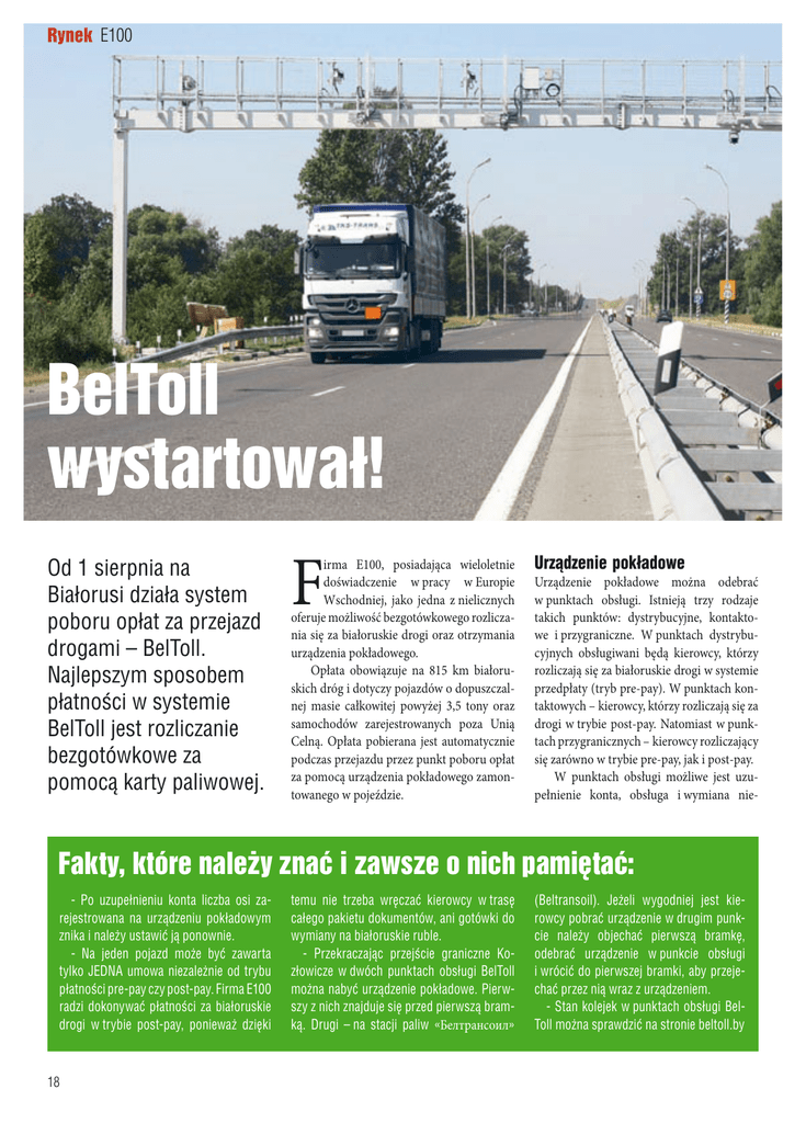 Rynek E100 BelToll wystartował! Od 1 sierpnia na Białorusi działa system poboru opłat za przejazd drogami – BelToll. Najlepszym sposobem płatności w systemie BelToll jest rozliczanie bezgotówkowe za pomocą karty paliwowej. F irma E100, posiadająca wieloletnie doświadczenie w pracy w Europie Wschodniej, jako jedna z nielicznych oferuje możliwość bezgotówkowego rozliczania się za białoruskie drogi oraz otrzymania urządzenia pokładowego. Opłata obowiązuje na 815 km białoruskich dróg i dotyczy pojazdów o dopuszczalnej masie całkowitej powyżej 3,5 tony oraz samochodów zarejestrowanych poza Unią Celną. Opłata pobierana jest automatycznie podczas przejazdu przez punkt poboru opłat za pomocą urządzenia pokładowego zamontowanego w pojeździe. Urządzenie pokładowe Urządzenie pokładowe można odebrać w punktach obsługi. Istnieją trzy rodzaje takich punktów: dystrybucyjne, kontaktowe i przygraniczne. W punktach dystrybucyjnych obsługiwani będą kierowcy, którzy rozliczają się za białoruskie drogi w systemie przedpłaty (tryb pre-pay). W punktach kontaktowych – kierowcy, którzy rozliczają się za drogi w trybie post-pay. Natomiast w punktach przygranicznych – kierowcy rozliczający się zarówno w trybie pre-pay, jak i post-pay. W punktach obsługi możliwe jest uzupełnienie konta, obsługa i wymiana nie- Fakty, które należy znać i zawsze o nich pamiętać: - Po uzupełnieniu konta liczba osi zarejestrowana na urządzeniu pokładowym znika i należy ustawić ją ponownie. - Na jeden pojazd może być zawarta tylko JEDNA umowa niezależnie od trybu płatności pre-pay czy post-pay. Firma E100 radzi dokonywać płatności za białoruskie drogi w trybie post-pay, ponieważ dzięki 18 temu nie trzeba wręczać kierowcy w trasę całego pakietu dokumentów, ani gotówki do wymiany na białoruskie ruble. - Przekraczając przejście graniczne Kozłowicze w dwóch punktach obsługi BelToll można nabyć urządzenie pokładowe. Pierwszy z nich znajduje się przed pierwszą bramką. Drugi – na stacji paliw «Белтрансоил» (Beltransoil). Jeżeli wygodniej jest kierowcy pobrać urządzenie w drugim punkcie należy objechać pierwszą bramkę, odebrać urządzenie w punkcie obsługi i wrócić do pierwszej bramki, aby przejechać przez nią wraz z urządzeniem. - Stan kolejek w punktach obsługi BelToll można sprawdzić na stronie beltoll.by sprawnych urządzeń pokładowych, zdanie urządzenia wraz z otrzymaniem zwrotu kaucji. Firmy transportowe spoza Białorusi nie będą mogły odebrać urządzenia pokładowego pocztą. Każde urządzenie przypisane jest do konkretnego pojazdu i nie może być użyte w innym samochodzie. Kontrola płatności Kontrola nad dokonywaniem płatności za drogi będzie sprawowana przez pracowników stacjonarnych i mobilnych punktów Inspekcji Drogowej. Użytkownicy dróg niestosujący się do wymogów będą karani mandatem. Mobilni pracownicy inspekcji mogą zatrzymać pojazd do kontroli, a w przypadku stwierdzenia naruszenia – zatrzymać i (lub) przymusowo odholować pojazd na parking strzeżony. Przewidywane są dwa rodzaje naruszeń – całkowity i częściowy brak płatności. Częściowy brak płatności oznacza przypadki, gdy kierowca pojazdu ustawił na urządzeniu błędną liczbę osi. Jest to istotne, gdyż wyso- W celu rejestracji na opłaty drogowe na Białorusi z E100 prosimy zadzwonić pod numery +48 22 441 98 18 czy +48 881 202 110 lub wypełnić wniosek na stronie www.e100.eu kość opłaty za przejazd waha się od 0,04 do 0,12 euro za 1 km w zależności od dopuszczalnej masy całkowitej pojazdu i liczby osi. Całkowity brak płatności oznacza brak urządzenia pokładowego, nieczynne urządzenie, gdy upłynął termin ważności urządzenia. Post-pay czy pre-pay? Płatność za przejazd płatnymi drogami w systemie elektronicznego poboru opłat dokonywana jest na podstawie umowy w trybie pre-pay lub post-pay. Pre-pay Przy wyborze tego trybu płatności użytkownik musi kontrolować stan konta urządzenia pokładowego i za każdym razem, gdy sygnalizuje ono niski stan środków, uzupełniać go w punktach obsługi zlokalizowanych wzdłuż płatnych dróg. Post-pay W przypadku zawarcia umowy w trybie post-pay użytkownik zyskuje wiele korzyści: *Jedna umowa na cały park samochodowy. *Brak konieczności zatrzymywania się w punktach obsługi w celu uzupełnienia konta urządzenia pokładowego. *Umowę na korzystanie z płatnych dróg w trybie post-pay zawiera się przez emitentów kart paliwowych, w szczególności E100. E100 19