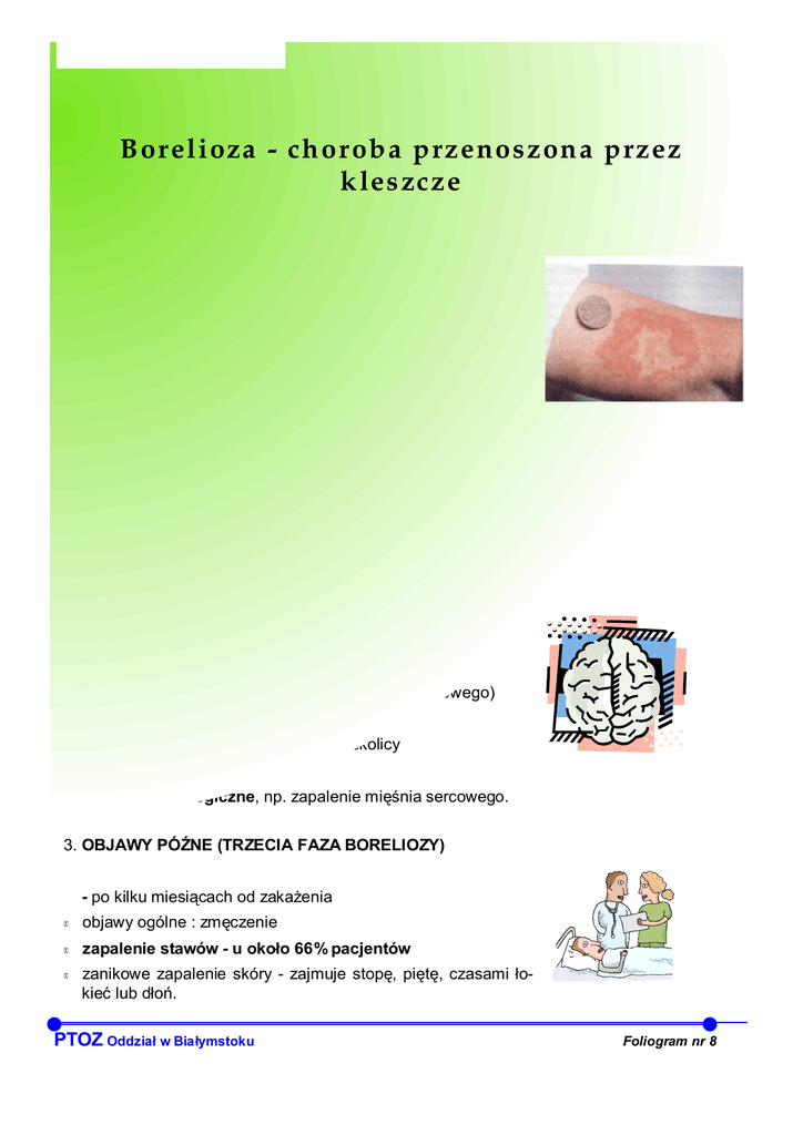 B orel ioza - ch orob a p rz enosz on a p rz ez k les zcz e Objawy kliniczne boreliozy Uwaga ! U każdego choroba może przebiegać inaczej. U niektórych chorych występować może tylko część z niżej wymienionych objawów. 1. OBJAWY WCZESNE • rumień wędrujący — rozszerzająca się wysypka wokół miejsca ukąszenia, zaczerwieniona, z przejaśnieniem w środku, rumień pojawia się od 3 do 32 dnia od ukąszenia, nie występuje u około 15% pacjentów. • Objawy niespecyficzne (grypopodobne) : ogólne złe samopoczucie, gorączka i dreszcze, bóle głowy, powiększenie węzłów chłonnych. 2. OBJAWY WTÓRNE (DRUGA FAZA BORELIOZY) - pojawiają się w 2 - 3 tygodniu, a nawet 2 - 3 miesiącu od ukąszenia kleszcza • objawy neurologiczne - zapalenie opon mózgowo - rdzeniowych - zapalenie mózgu - zapalenie nerwów (np. twarzowego czy przeponowego) - pląsawica - zapalenie włókien nerwowych, np. okolicy krzyżowo - lędźwiowej • objawy kardiologiczne, np. zapalenie mięśnia sercowego. 3. OBJAWY PÓŹNE (TRZECIA FAZA BORELIOZY) - po kilku miesiącach od zakażenia • objawy ogólne : zmęczenie • zapalenie stawów - u około 66% pacjentów • zanikowe zapalenie skóry - zajmuje stopę, piętę, czasami łokieć lub dłoń. PTOZ Oddział w Białymstoku Foliogram nr 8