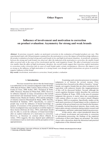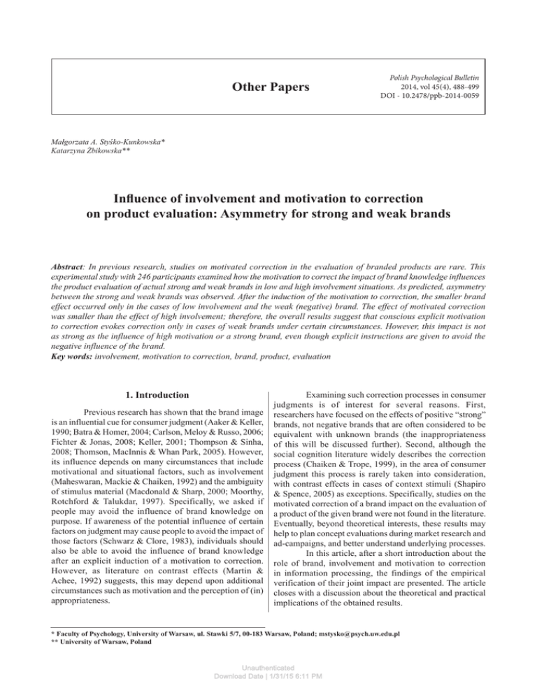 Other Papers Polish Psychological Bulletin 2014, vol 45(4), 488-499 DOI - 10.2478/ppb-2014-0059 Małgorzata A. Styśko-Kunkowska* Katarzyna Żbikowska** Influence of involvement and motivation to correction on product evaluation: Asymmetry for strong and weak brands Abstract: In previous research, studies on motivated correction in the evaluation of branded products are rare. This experimental study with 246 participants examined how the motivation to correct the impact of brand knowledge influences the product evaluation of actual strong and weak brands in low and high involvement situations. As predicted, asymmetry between the strong and weak brands was observed. After the induction of the motivation to correction, the smaller brand effect occurred only in the cases of low involvement and the weak (negative) brand. The effect of motivated correction was smaller than the effect of high involvement; therefore, the overall results suggest that conscious explicit motivation to correction evokes correction only in cases of weak brands under certain circumstances. However, this impact is not as strong as the influence of high motivation or a strong brand, even though explicit instructions are given to avoid the negative influence of the brand. Key words: involvement, motivation to correction, brand, product, evaluation 1. Introduction Previous research has shown that the brand image is an influential cue for consumer judgment (Aaker & Keller, 1990; Batra & Homer, 2004; Carlson, Meloy & Russo, 2006; Fichter & Jonas, 2008; Keller, 2001; Thompson & Sinha, 2008; Thomson, MacInnis & Whan Park, 2005). However, its influence depends on many circumstances that include motivational and situational factors, such as involvement (Maheswaran, Mackie & Chaiken, 1992) and the ambiguity of stimulus material (Macdonald & Sharp, 2000; Moorthy, Rotchford & Talukdar, 1997). Specifically, we asked if people may avoid the influence of brand knowledge on purpose. If awareness of the potential influence of certain factors on judgment may cause people to avoid the impact of those factors (Schwarz & Clore, 1983), individuals should also be able to avoid the influence of brand knowledge after an explicit induction of a motivation to correction. However, as literature on contrast effects (Martin & Achee, 1992) suggests, this may depend upon additional circumstances such as motivation and the perception of (in) appropriateness. Examining such correction processes in consumer judgments is of interest for several reasons. First, researchers have focused on the effects of positive “strong” brands, not negative brands that are often considered to be equivalent with unknown brands (the inappropriateness of this will be discussed further). Second, although the social cognition literature widely describes the correction process (Chaiken & Trope, 1999), in the area of consumer judgment this process is rarely taken into consideration, with contrast effects in cases of context stimuli (Shapiro & Spence, 2005) as exceptions. Specifically, studies on the motivated correction of a brand impact on the evaluation of a product of the given brand were not found in the literature. Eventually, beyond theoretical interests, these results may help to plan concept evaluations during market research and ad-campaigns, and better understand underlying processes. In this article, after a short introduction about the role of brand, involvement and motivation to correction in information processing, the findings of the empirical verification of their joint impact are presented. The article closes with a discussion about the theoretical and practical implications of the obtained results. * Faculty of Psychology, University of Warsaw, ul. Stawki 5/7, 00-183 Warsaw, Poland; [email protected] ** University of Warsaw, Poland Unauthenticated Download Date | 1/31/15 6:11 PM Influence of involvement and motivation to correction on product ... 1.1. Brand Effect The brand notion includes many conceptualizations (Allen, Fournier & Miller, 2008). In this study, we treat the brand as a psychological construct: a knowledge structure existing in consumers’ minds that is a complex construct and consists of both associations and expectations related to the brand representation (Aaker, 1996, 1997; Keller, 2001, 2003, 2008; Tietje & Brunel, 2005). According to Keller’s customer-based brand equity model (CBBE, Keller, 2001, 2003, 2008) the brand knowledge structure contains notions that are related to different levels of abstraction and links of varying strength, including brand awareness (familiarity, knowledge about the product category), beliefs about its functional and emotional attributes and benefits, and judgments, feelings, emotions, sensory images, personal experiences, and personal attachment. By spreading the activation of nodes, the activation of the brand knowledge leads to the so-called “brand effect.” This means that the consumers’ judgments and behaviors are based on the activated contents and evaluations. Carlson et al. (2006) argued that in a situation of choice between two similar products with different brand names, consumers will differentiate between them based on their brand knowledge, not on the products’ actual attributes. Consistent with the heuristic-systematic model, Maheswaran et al. (1992) hypothesized and found that the brand effect occurs because brand knowledge operates as a heuristic cue. In general, relying on heuristics is considered to be an essential element of human functioning due to its adaptive role (Todd & Gigerenzer, 2003). In some circumstances, such as a medium level of knowledge, heuristics facilitate relatively fast and (mostly) accurate decisions (Kardes, 2006) because they are often correct, being based on an individual’s own experiences (Slovic, Finucane, Peters & MacGregor, 2002). Brand as a heuristic cue also enables the protection of the ego by reducing the risk of uncertainty, difficulty in choo