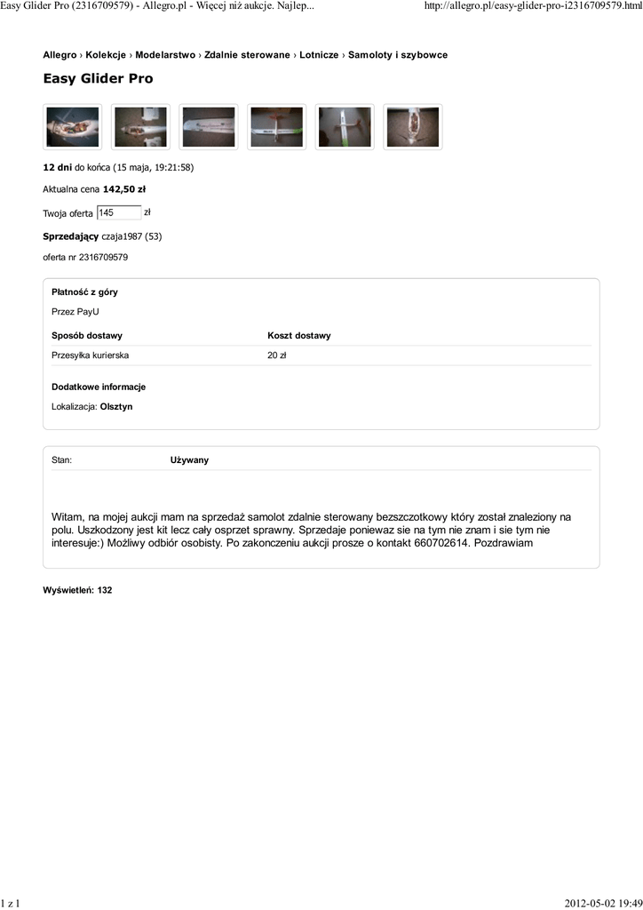 Easy Glider Pro (2316709579) - Allegro.pl - Więcej niż aukcje. Najlep... 1z1 http://allegro.pl/easy-glider-pro-i2316709579.html Allegro › Kolekcje › Modelarstwo › Zdalnie sterowane › Lotnicze › Samoloty i szybowce Easy Glider Pro 12 dni do końca (15 maja, 19:21:58) Aktualna cena 142,50 zł Twoja oferta zł Sprzedający czaja1987 (53) oferta nr 2316709579 Płatność z góry Przez PayU Sposób dostawy Koszt dostawy Przesyłka kurierska 20 zł Dodatkowe informacje Lokalizacja: Olsztyn Stan: Używany Witam, na mojej aukcji mam na sprzedaż samolot zdalnie sterowany bezszczotkowy który został znaleziony na polu. Uszkodzony jest kit lecz cały osprzet sprawny. Sprzedaje poniewaz sie na tym nie znam i sie tym nie interesuje:) Możliwy odbiór osobisty. Po zakonczeniu aukcji prosze o kontakt 660702614. Pozdrawiam Wyświetleń: 132 2012-05-02 19:49