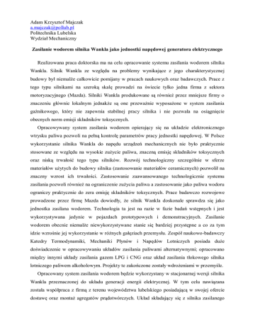 Adam Krzysztof Majczak [email protected] Politechnika Lubelska Wydział Mechaniczny Zasilanie wodorem silnika Wankla jako jednostki napędowej generatora elektrycznego Realizowana praca doktorska ma na celu opracowanie systemu zasilania wodorem silnika Wankla. Silnik Wankla ze względu na problemy wynikające z jego charakterystycznej budowy był niemalże całkowicie pomijany w pracach naukowych oraz badawczych. Prace z tego typu silnikami na szeroką skalę prowadzi na świecie tylko jedna firma z sektora motoryzacyjnego (Mazda). Silniki Wankla produkowane są również przez mniejsze firmy o znaczeniu głównie lokalnym jednakże są one przeważnie wyposażone w system zasilania gaźnikowego, który nie zapewnia stabilnej pracy silnika i nie pozwala na osiągnięcie obecnych norm emisji składników toksycznych. Opracowywany system zasilania wodorem opierający się na układzie elektronicznego wtrysku paliwa pozwoli na pełną kontrolę parametrów pracy jednostki napędowej. W Polsce wykorzystanie silnika Wankla do napędu urządzeń mechanicznych nie było praktycznie stosowane ze względu na wysokie zużycie paliwa, znaczną emisję składników toksycznych oraz niską trwałość tego typu silników. Rozwój technologiczny szczególnie w sferze materiałów użytych do budowy silnika (zastosowanie materiałów ceramicznych) pozwolił na znaczny wzrost ich trwałości. Zastosowanie zaawansowanego technologicznie systemu zasilania pozwoli również na ograniczenie zużycia paliwa a zastosowanie jako paliwa wodoru ograniczy praktycznie do zera emisję składników toksycznych. Prace badawczo rozwojowe prowadzone przez firmę Mazda dowiodły, że silnik Wankla doskonale sprawdza się jako jednostka zasilana wodorem. Technologia ta jest na razie w fazie badań wstępnych i jest wykorzystywana jedynie w pojazdach prototypowych i demonstracyjnych. Zasilanie wodorem obecnie niemalże niewykorzystywane stanie się bardziej przystępne a co za tym idzie wzrośnie jej wykorzystanie w różnych gałęziach przemysłu. Zespół naukowo-badawczy Katedry Termodynamiki, Mechaniki Płynów i Napędów Lotniczych posiada duże doświadczenie w opracowywaniu układów zasilania paliwami alternatywnymi; opracowano między innymi układy zasilania gazem LPG i CNG oraz układ zasilania tłokowego silnika lotniczego paliwem alkoholowym. Projekty te zakończone zostały wdrożeniami w przemyśle. Opracowany system zasilania wodorem będzie wykorzystany w stacjonarnej wersji silnika Wankla przeznaczonej do układu generacji energii elektrycznej. W tym celu nawiązana została współpraca z firmą z terenu województwa lubelskiego posiadającą w swojej ofercie dostawę oraz montaż agregatów prądotwórczych. Układ składający się z silnika zasilanego wodorem oraz zespołu generowania energii będzie przeznaczony głownie do przydomowych układów generacyjnych jednakże może być także wykorzystany jako źródło awaryjnego zasilania na przykład w placówkach służby zdrowia, bankach, centrach danych, czy obiektach telekomunikacyjnych. Generatory energii wykorzystywane są również w przemyśle wydobywczym do napędu różnego rodzaju pomp, w miejscach nieposiadających podłączenia do sieci elektrycznej lub placach budowy gdzie takie podłączenie nie zostało jeszcze wykonane. Konstrukcja silnika Wankla pozwala na tworzenie modułowych zestawów, dzięki czemu możliwe jest konfigurowanie układów o mocy dostosowanej do wymagań poszczególnych odbiorców. Układy generowania energii oparte na jednostce napędowej zasilanej wodorem pozwolą na znaczne obniżenie emisji składników toksycznych w porównaniu do układów generacji energii opartych na silnikach spalinowych wykorzystujących paliwa konwencjonalne. Opracowanie systemu zasilania wodorem przeznaczonego do silnika stacjonarnego będzie stanowiło doskonałą podstawę do opracowania systemu przeznaczonego do wykorzystania w pojazdach drogowych. Opracowany układ zasilania wodorem stacjonarnego silnika Wankla doskonale wpisuje się w strategię ograniczania emisji składników toksycznych do atmosfery a także zwiększania udziału paliw alternatywnych na rynku. Spaleniu wodoru nie towarzyszy powstawanie toksycznych związków takich jak tlenki węgla czy węglowodory. Jedynym produktem spalania wodoru jest woda oraz niewielkie ilości tlenków azotu. Zwiększenie zapotrzebowania na wodór będący wynikiem rozpowszechnienia opracowanego układu zasilania będzie miało pozytywny wpływ na rozwój technologii jego pozyskiwania w wyniku tego zwiększy się opłacalność produkcji np. biomasy co przyczyni się do rozwoju nowych technologii w zakresie jej produkcji oraz pozyskiwania wodoru na drodze gazyfikacji. Opracowanie zaawansowanego technologicznie systemu zasilania wodorem wpłynie również korzystnie na rozwój zasobów ludzkich województwa lubelskiego gdyż niezbędne będzie przeszkolenie odpowiednio dużej kadry niezbędnej do wyprodukowania oraz późniejszego montażu i serwisowania układów generacyjnych. Zastosowanie wodoru do napędu układów generacji energii ułatwi osiągnięcie celów postawionych przez Komisję Europejską (3x20). Plan ten zakłada zmniejszenie emisji gazów cieplarnianych o 20%, wzrost znaczenia odnawialnych źródeł energii - o 20%, oraz ograniczenie energochłonności o 20%. Realizacja tego pakietu ma wspomóc procesy zapobiegające globalnemu ociepleniu a także poprawić efektywność energetyczną w krajach Unii. Opracowanie unikalnego w skali europejskiej systemu zasilania wodorem silnika Wankla pozwoli na poprawę wizerunku regionu w UE oraz zwiększy promocję lubelskich towarów na rynkach Europy, co wpisuje się w misję i cele strategiczne Strategii Rozwoju Województwa Lubelskiego.