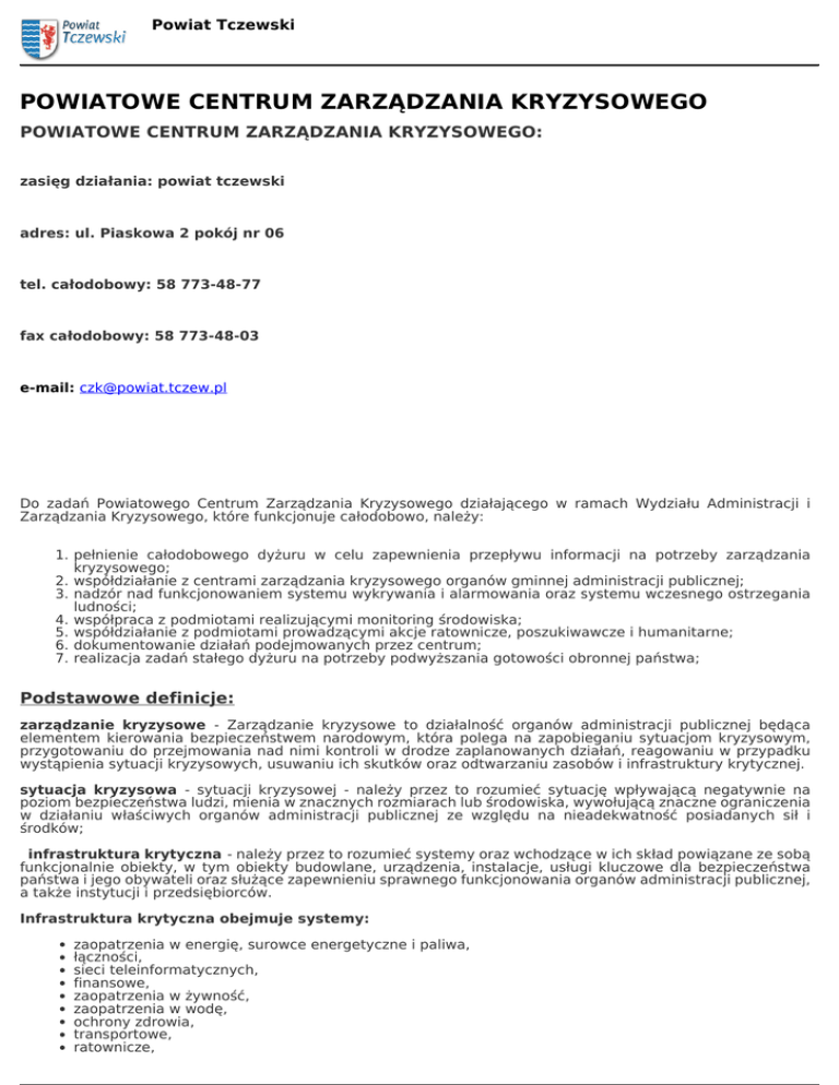 Powiat Tczewski POWIATOWE CENTRUM ZARZĄDZANIA KRYZYSOWEGO POWIATOWE CENTRUM ZARZĄDZANIA KRYZYSOWEGO: zasięg działania: powiat tczewski adres: ul. Piaskowa 2 pokój nr 06 tel. całodobowy: 58 773-48-77 fax całodobowy: 58 773-48-03 e-mail: [email protected] Do zadań Powiatowego Centrum Zarządzania Kryzysowego działającego w ramach Wydziału Administracji i Zarządzania Kryzysowego, które funkcjonuje całodobowo, należy: 1. pełnienie całodobowego dyżuru w celu zapewnienia przepływu informacji na potrzeby zarządzania kryzysowego; 2. współdziałanie z centrami zarządzania kryzysowego organów gminnej administracji publicznej; 3. nadzór nad funkcjonowaniem systemu wykrywania i alarmowania oraz systemu wczesnego ostrzegania ludności; 4. współpraca z podmiotami realizującymi monitoring środowiska; 5. współdziałanie z podmiotami prowadzącymi akcje ratownicze, poszukiwawcze i humanitarne; 6. dokumentowanie działań podejmowanych przez centrum; 7. realizacja zadań stałego dyżuru na potrzeby podwyższania gotowości obronnej państwa; Podstawowe definicje: zarządzanie kryzysowe - Zarządzanie kryzysowe to działalność organów administracji publicznej będąca elementem kierowania bezpieczeństwem narodowym, która polega na zapobieganiu sytuacjom kryzysowym, przygotowaniu do przejmowania nad nimi kontroli w drodze zaplanowanych działań, reagowaniu w przypadku wystąpienia sytuacji kryzysowych, usuwaniu ich skutków oraz odtwarzaniu zasobów i infrastruktury krytycznej. sytuacja kryzysowa - sytuacji kryzysowej - należy przez to rozumieć sytuację wpływającą negatywnie na poziom bezpieczeństwa ludzi, mienia w znacznych rozmiarach lub środowiska, wywołującą znaczne ograniczenia w działaniu właściwych organów administracji publicznej ze względu na nieadekwatność posiadanych sił i środków; infrastruktura krytyczna - należy przez to rozumieć systemy oraz wchodzące w ich skład powiązane ze sobą funkcjonalnie obiekty, w tym obiekty budowlane, urządzenia, instalacje, usługi kluczowe dla bezpieczeństwa państwa i jego obywateli oraz służące zapewnieniu sprawnego funkcjonowania organów administracji publicznej, a także instytucji i przedsiębiorców. Infrastruktura krytyczna obejmuje systemy: zaopatrzenia w energię, surowce energetyczne i paliwa, łączności, sieci teleinformatycznych, finansowe, zaopatrzenia w żywność, zaopatrzenia w wodę, ochrony zdrowia, transportowe, ratownicze, Powiat Tczewski zapewniające ciągłość działania administracji publicznej, produkcji, składowania, przechowywania i stosowania substancji chemicznych i promieniotwórczych, w tym rurociągi substancji niebezpiecznych. Powered by TCPDF (www.tcpdf.org)