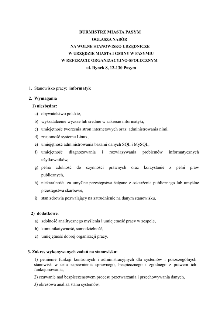 BURMISTRZ MIASTA PASYM OGŁASZA NABÓR NA WOLNE STANOWISKO URZĘDNICZE W URZĘDZIE MIASTA I GMINY W PASYMIU W REFERACIE ORGANIZACYJNO-SPOŁECZNYM ul. Rynek 8, 12-130 Pasym 1. Stanowisko pracy: informatyk 2. Wymagania 1) niezbędne: a) obywatelstwo polskie, b) wykształcenie wyższe lub średnie w zakresie informatyki, c) umiejętność tworzenia stron internetowych oraz administrowania nimi, d) znajomość systemu Linux, e) umiejętność administrowania bazami danych SQL i MySQL, f) umiejętność diagnozowania i rozwiązywania problemów informatycznych użytkowników, g) pełna zdolność do czynności prawnych oraz korzystanie z pełni praw publicznych, h) niekaralność za umyślne przestępstwa ścigane z oskarżenia publicznego lub umyślne przestępstwa skarbowe, i) stan zdrowia pozwalający na zatrudnienie na danym stanowisku, 2) dodatkowe: a) zdolność analitycznego myślenia i umiejętność pracy w zespole, b) komunikatywność, samodzielność, c) umiejętność dobrej organizacji pracy. 3. Zakres wykonywanych zadań na stanowisku: 1) pełnienie funkcji kontrolnych i administracyjnych dla systemów i poszczególnych stanowisk w celu zapewnienia sprawnego, bezpiecznego i zgodnego z prawem ich funkcjonowania, 2) czuwanie nad bezpieczeństwem procesu przetwarzania i przechowywania danych, 3) okresowa analiza stanu systemów, 4) zgłaszania wniosków dotyczących modernizacji systemów, 5) przeprowadzanie kontroli znajomości i stosowania zasad przy pracy na poszczególnych stanowiskach, 6) rejestracja, kompletowanie i przechowywanie dokumentów dotyczących zainstalowanych programów i sprzętu, 7)przygotowywanie projektów wewnętrznych zarządzeń, instrukcji dotyczących prawidłowego i bezpiecznego użytkowania systemów, w tym prawidłowej archiwizacji danych zainstalowanych programów i sprzętu, 8)likwidowanie zauważonych utrudnień i nieprawidłowości dotyczących sprzętu i oprogramowania, 9) konserwacja i naprawa sprzętu komputerowego oraz urządzeń biurowych, w tym opieka nad kserokopiarką, 10) współdziałanie z dostawcami programów i przekazywanie informacji do ich użytkowników, 11) prowadzenie i aktualizowanie strony internetowej Gminy Pasym oraz Biuletynu Informacji Publicznej UMiG w Pasymiu, 12) bieżąca aktualizacja programu komputerowego do obsługi prawnej, 13) rejestracja i prowadzenie ewidencji telefonów komórkowych urzędu, 14) bieżąca konserwacja analogowej sieci telefonicznej w urzędzie. 4. Informacja o warunkach pracy na danym stanowisku: 1) miejsce pracy: praca w biurze, budynek i pomieszczenie pracy niedostosowane dla osób poruszających się na wózku inwalidzkim; praca na pełny etat, w godz. od 7³° do 15³° w dni robocze od poniedziałku do piątku, z wyjątkiem czwartku w godz. od 9°° do 17°°. 2) stanowisko pracy: usytuowanie stanowiska pracy na piętrze budynku Urzędu, praca wykonywana przy monitorze ekranowym powyżej 4 godzin dziennie. 5. W miesiącu sierpniu 2015r. wskaźnik zatrudnienia osób niepełnosprawnych w jednostce, w rozumieniu przepisów o rehabilitacji zawodowej i społecznej oraz zatrudnianiu osób niepełnosprawnych, nie przekroczył 6% ¹. 6. Wymagane dokumenty: a) list motywacyjny, życiorys (CV)²; b) kwestionariusz osobowy dla osoby ubiegającej się o zatrudnienie, c) kopie dokumentów potwierdzających wykształcenie, d) inne dodatkowe dokumenty o posiadanych kwalifikacjach, e) kopie świadectw pracy, f) oświadczenie kandydata o korzystaniu z pełni praw publicznych oraz zdolności do czynności prawnych; g) oświadczenie kandydata, że nie był prawomocnie skazany za przestępstwo umyślne lub przestępstwo skarbowe umyślne ³; h) oświadczenie kandydata o posiadaniu obywatelstwa polskiego; i) oświadczenie kandydata o braku przeciwwskazań zdrowotnych do pracy na danym stanowisku urzędniczym. 7. Informacje dodatkowe: Kandydaci spełniający wymogi formalne zostaną poinformowani telefonicznie o terminie rozmowy kwalifikacyjnej. Brak odpowiedzi ze strony Urzędu Miasta i Gminy w Pasymiu na zgłoszoną ofertę, a także nie zgłoszenie się kandydata na rozmowę kwalifikacyjną w wyznaczonym terminie jest równoznaczne z odrzuceniem oferty. Informacja o wynikach naboru będzie ogłoszona w Biuletynie Informacji Publicznej oraz na tablicy ogłoszeń Urzędu Miasta i Gminy w Pasymiu. 8. Termin składania dokumentów: wymagane dokumenty aplikacyjne należy składać osobiście w siedzibie Urzędu, pokój nr 5 lub pocztą na adres Urzędu Miasta i Gminy w Pasymiu ul. Rynek 8, 12-130 Pasym z dopiskiem:"Dotyczy naboru na stanowisko informatyka" w terminie do dnia 5 października 2015r. Aplikacje, które wpłyną do Urzędu po terminie nie będą rozpatrywane. Burmistrz Miasta /-/ Cezary Łachmański _____________________________ 1. Kandydat, który zamierza skorzystać z uprawnienia, o którym mowa w art. 13a ust. 2 ustawy z dnia 21 listopada 2008 roku o pracownikach samorządowych jest obowiązany do złożenia wraz z dokumentami kopii dokumentu potwierdzającego niepełnosprawność. 2. List motywacyjny, szczegółowe CV ( z uwzględnieniem dokładnego przebiegu kariery zawodowej), powinny być opatrzone klauzulą: „Wyrażam zgodę na przetwarzanie moich danych osobowych zawartych w ofercie pracy dla potrzeb niezbędnych do realizacji procesu rekrutacji zgodnie z ustawą z dnia 29.08.1997 o ochronie danych osobowych (Dz. U. z 2002 r. Nr 101, poz. 926 z późn. zm.) oraz ustawą z dnia. 21.11.2008r. o pracownikach samorządowych (t.j. Dz. U. z 2014r, poz. 1202)”. oraz własnoręcznie podpisane. 3. Osoba wybrana do zatrudnienia będzie zobowiązana do przedstawienia oryginału aktualnego „Zapytania o udzielenie informacji o osobie” z Krajowego Rejestru Karnego.