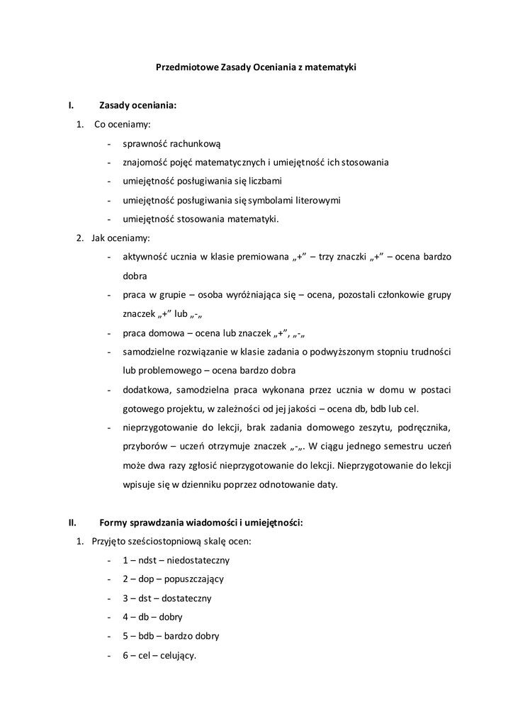 Przedmiotowe Zasady Oceniania z matematyki I. Zasady oceniania