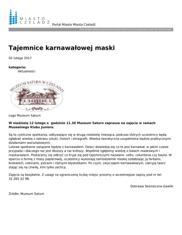 Portal Miasta Miasta Czeladź http://www.czeladz.pl/aktualnosci/index/Tajemnice-karnawalowej-maski/idn:482/printpdf Tajemnice karnawałowej maski 02 lutego 2017 kategoria: Aktualności Logo Muzeum Saturn W niedzielę 12 lutego o godzinie 11.30 Muzeum Saturn zaprasza na zajęcia w ramach Muzealnego Klubu Juniora. Są to cykliczne spotkania, odbywające się w drugą niedzielę miesiąca, podczas których uczestnicy będą zgłębiać wiedzę z zakresu sztuki, historii i etnografii. Wiedza teoretyczna uzupełniona będzie praktycznymi działaniami warsztatowymi. Lutowe spotkanie związane będzie z karnawałem. Dzieci dowiedzą się co to jest karnawał, w jakim czasie przypada i dlaczego raz jest dłuższy a raz krótszy. Wspólnie zgłębimy wiedzę o balach maskowych i maskaradach. Postaramy się odkryć co kryje się pod tajemniczymi nazwami: volto, columbina czy bauta. W oparciu o formę z masy papierowej, uczestnicy wykonają samodzielnie maskę ozdabiając ją farbami, brokatem, cekinami, piórami i różnymi błyskotkami. Po czym, zwyczajem karnawałowym, zakryją twarz stając się na chwilę, kim tylko zechcą. Zajęcia są bezpłatne. Z uwagi na ograniczoną liczbę miejsc prosimy o wcześniejsze zapisy pod nr tel. 32 265 42 98. Dobrawa Skonieczna-Gawlik Źródło: Muzeum Saturn