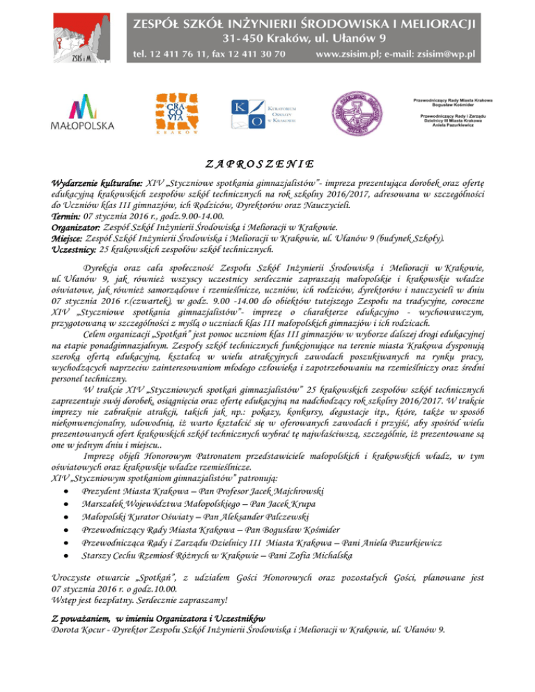 ZAPROSZENIE Wydarzenie kulturalne: XIV „Styczniowe spotkania gimnazjalistów”- impreza prezentująca dorobek oraz ofertę edukacyjną krakowskich zespołów szkół technicznych na rok szkolny 2016/2017, adresowana w szczególności do Uczniów klas III gimnazjów, ich Rodziców, Dyrektorów oraz Nauczycieli. Termin: 07 stycznia 2016 r., godz.9.00-14.00. Organizator: Zespół Szkół Inżynierii Środowiska i Melioracji w Krakowie. Miejsce: Zespół Szkół Inżynierii Środowiska i Melioracji w Krakowie, ul. Ułanów 9 (budynek Szkoły). Uczestnicy: 25 krakowskich zespołów szkół technicznych. Dyrekcja oraz cała społeczność Zespołu Szkół Inżynierii Środowiska i Melioracji w Krakowie, ul. Ułanów 9, jak również wszyscy uczestnicy serdecznie zapraszają małopolskie i krakowskie władze oświatowe, jak również samorządowe i rzemieślnicze, uczniów, ich rodziców, dyrektorów i nauczycieli w dniu 07 stycznia 2016 r.(czwartek), w godz. 9.00 -14.00 do obiektów tutejszego Zespołu na tradycyjne, coroczne XIV „Styczniowe spotkania gimnazjalistów”- imprezę o charakterze edukacyjno - wychowawczym, przygotowaną w szczególności z myślą o uczniach klas III małopolskich gimnazjów i ich rodzicach. Celem organizacji „Spotkań” jest pomoc uczniom klas III gimnazjów w wyborze dalszej drogi edukacyjnej na etapie ponadgimnazjalnym. Zespoły szkół technicznych funkcjonujące na terenie miasta Krakowa dysponują szeroką ofertą edukacyjną, kształcą w wielu atrakcyjnych zawodach poszukiwanych na rynku pracy, wychodzących naprzeciw zainteresowaniom młodego człowieka i zapotrzebowaniu na rzemieślniczy oraz średni personel techniczny. W trakcie XIV „Styczniowych spotkań gimnazjalistów” 25 krakowskich zespołów szkół technicznych zaprezentuje swój dorobek, osiągnięcia oraz ofertę edukacyjną na nadchodzący rok szkolny 2016/2017. W trakcie imprezy nie zabraknie atrakcji, takich jak np.: pokazy, konkursy, degustacje itp., które, także w sposób niekonwencjonalny, udowodnią, iż warto kształcić się w oferowanych zawodach i przyjść, aby spośród wielu prezentowanych ofert krakowskich szkół technicznych wybrać tę najwłaściwszą, szczególnie, iż prezentowane są one w jednym dniu i miejscu.. Imprezę objęli Honorowym Patronatem przedstawiciele małopolskich i krakowskich władz, w tym oświatowych oraz krakowskie władze rzemieślnicze. XIV „Styczniowym spotkaniom gimnazjalistów” patronują: Prezydent Miasta Krakowa – Pan Profesor Jacek Majchrowski Marszałek Województwa Małopolskiego – Pan Jacek Krupa Małopolski Kurator Oświaty – Pan Aleksander Palczewski Przewodniczący Rady Miasta Krakowa – Pan Bogusław Kośmider Przewodnicząca Rady i Zarządu Dzielnicy III Miasta Krakowa – Pani Aniela Pazurkiewicz Starszy Cechu Rzemiosł Różnych w Krakowie – Pani Zofia Michalska Uroczyste otwarcie „Spotkań”, z udziałem Gości Honorowych oraz pozostałych Gości, planowane jest 07 stycznia 2016 r. o godz.10.00. Wstęp jest bezpłatny. Serdecznie zapraszamy! Z poważaniem, w imieniu Organizatora i Uczestników Dorota Kocur - Dyrektor Zespołu Szkół Inżynierii Środowiska i Melioracji w Krakowie, ul. Ułanów 9.