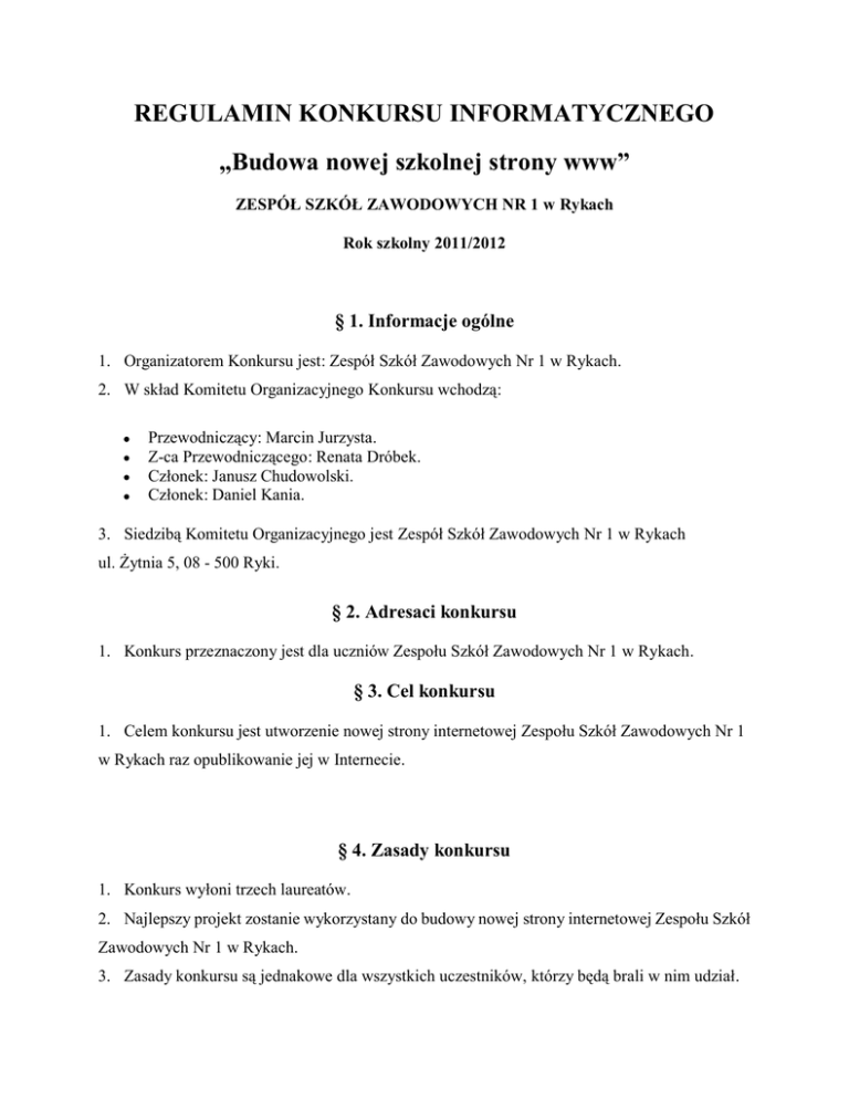 REGULAMIN KONKURSU INFORMATYCZNEGO „Budowa nowej szkolnej strony www” ZESPÓŁ SZKÓŁ ZAWODOWYCH NR 1 w Rykach Rok szkolny 2011/2012 § 1. Informacje ogólne 1. Organizatorem Konkursu jest: Zespół Szkół Zawodowych Nr 1 w Rykach. 2. W skład Komitetu Organizacyjnego Konkursu wchodzą: Przewodniczący: Marcin Jurzysta. Z-ca Przewodniczącego: Renata Dróbek. Członek: Janusz Chudowolski. Członek: Daniel Kania. 3. Siedzibą Komitetu Organizacyjnego jest Zespół Szkół Zawodowych Nr 1 w Rykach ul. Żytnia 5, 08 - 500 Ryki. § 2. Adresaci konkursu 1. Konkurs przeznaczony jest dla uczniów Zespołu Szkół Zawodowych Nr 1 w Rykach. § 3. Cel konkursu 1. Celem konkursu jest utworzenie nowej strony internetowej Zespołu Szkół Zawodowych Nr 1 w Rykach raz opublikowanie jej w Internecie. § 4. Zasady konkursu 1. Konkurs wyłoni trzech laureatów. 2. Najlepszy projekt zostanie wykorzystany do budowy nowej strony internetowej Zespołu Szkół Zawodowych Nr 1 w Rykach. 3. Zasady konkursu są jednakowe dla wszystkich uczestników, którzy będą brali w nim udział. 4. Strona internetowa szkoły powinna zostać wykonana z wykorzystaniem następujących narzędzi programistycznych: HTML, PHP Fushion, Joomla, Flash Player lub innych nie wymienionych, a które mają również możliwość wykorzystania bazy danych MySQL. 5. Strona internetowa powinna być tak wykonana, aby można było w łatwy sposób przenieść dane ze „starej” strony na nową oraz w łatwy sposób nią zarządzać. 6. Z chwilą utworzenia strony internetowej oraz zgłoszenia jej w konkursie wszelkie prawa autorskie zostają przeniesione na rzecz Zespołu Szkół Zawodowych Nr 1 w Rykach. 7. Wykonana strona internetowa powinna zostać dostarczona do komisji na nośniku danych typu DVD-R, który powinien zostać opisany według przedstawionego schematu: Zespół Szkół Zawodowych Nr 1 w Rykach, tytuł: „mechanikryki.pl”, imię i nazwisko ucznia oraz klasa. Na płycie powinien również znaleźć się folder o nazwie „strona WWW” zawierający kod strony internetowej następnie w folderze dokumentacja powinien znaleźć się plik zapisany w formacie RTF, który zawierałby szczegółowe informację w formie opisowej jak została wykonana strona internetowa przez autora pracy. 8. Laureaci konkursu zostaną ogłoszeni publicznie na apelu szkolnym oraz stronie internetowej szkoły. § 5. Zgłoszenie uczestnictwa 1. Uczniowie indywidualnie, powinni zgłosić swoje uczestnictwo do prowadzącego konkurs Pana Marcina Jurzysty do 25.11.2011 r. 2. Dane osobowe uczestników konkursu są wykorzystywane zgodnie z ustawą z dnia 29 sierpnia 1997r., o ochronie danych osobowych. Dane osobowe zbierane i przetwarzane będą do celów związanych z prowadzonym konkursem. Administratorem danych jest Zespół Szkół Zawodowych Nr 1 w Rykach ul. Żytnia 5, 08 - 500 Ryki. Każdy z uczestników ma prawo wglądu do swoich danych oraz do ich poprawiania. 3. Biorąc udział w konkursie, uczestnik lub jego rodzic/opiekun prawny wyrażają zgodę na przestrzeganie niniejszego regulaminu. § 6. Terminy i Przebieg konkursu 18 listopada 2011 r. – ogłoszenie konkursu informatycznego. 25 listopada 2011 r. – termin zgłoszenia uczestników do konkursu informatycznego. 18 styczeń 2011 r. – termin na oddanie gotowej pracy wykonanej przez autora. 25 styczeń 2012 r. – termin ogłoszenia wyników. § 7. Nagrody Nagrody dla laureatów konkursu za zajęcie pierwszego, drugiego oraz trzeciego miejsca będą w formie rzeczowej. Dodatkowo, każdemu z uczestników konkursu, zostanie wpisana pochwała do dziennika lekcyjnego. Zapraszamy wszystkich zainteresowanych do udziału w konkursie. Komitet organizacyjny.