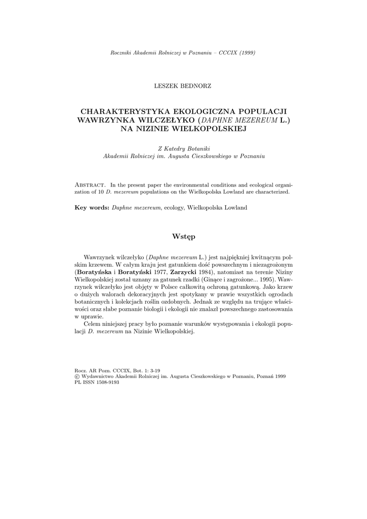 Roczniki Akademii Rolniczej w Poznaniu – CCCIX (1999) LESZEK BEDNORZ CHARAKTERYSTYKA EKOLOGICZNA POPULACJI WAWRZYNKA WILCZEŁYKO (DAPHNE MEZEREUM L.) NA NIZINIE WIELKOPOLSKIEJ Z Katedry Botaniki Akademii Rolniczej im. Augusta Cieszkowskiego w Poznaniu Abstract. In the present paper the environmental conditions and ecological organization of 10 D. mezereum populations on the Wielkopolska Lowland are characterized. Key words: Daphne mezereum, ecology, Wielkopolska Lowland Wstęp Wawrzynek wilczełyko (Daphne mezereum L.) jest najpiękniej kwitnącym polskim krzewem. W całym kraju jest gatunkiem dość powszechnym i niezagrożonym (Boratyńska i Boratyński 1977, Zarzycki 1984), natomiast na terenie Niziny Wielkopolskiej został uznany za gatunek rzadki (Ginące i zagrożone... 1995). Wawrzynek wilczełyko jest objęty w Polsce całkowitą ochroną gatunkową. Jako krzew o dużych walorach dekoracyjnych jest spotykany w prawie wszystkich ogrodach botanicznych i kolekcjach roślin ozdobnych. Jednak ze względu na trujące właściwości oraz słabe poznanie biologii i ekologii nie znalazł powszechnego zastosowania w uprawie. Celem niniejszej pracy było poznanie warunków występowania i ekologii populacji D. mezereum na Nizinie Wielkopolskiej. Rocz. AR Pozn. CCCIX, Bot. 1: 3-19 c Wydawnictwo Akademii Rolniczej im. Augusta Cieszkowskiego w Poznaniu, Poznań 1999 PL ISSN 1508-9193 4 L. Bednorz Materiał i metody Do badań wybrano 10 populacji rozmieszczonych na Nizinie Wielkopolskiej: 1. Dziewicza Góra I, 2. Dziewicza Góra II, 3. Bieczyny, 4. Bagatelka, 5. Bieniszew I, 6. Bieniszew II, 7. Miejski Bór, 8. Smoszew, 9. Wydymacz, 10. Kręcki Łęg. Identyfikację zbiorowisk roślinnych z udziałem D. mezereum przeprowadzono na podstawie zdjęć fitosocjologicznych, a ocenę stosunków fitocenotycznych w zbiorowiskach z udziałem wawrzynka przeprowadzono na powierzchniach próbnych 1 m2 . Na każdej powierzchni obserwacyjnej wykonano profil glebowy w celu określenia typu i podtypu gleb oraz ich właściwości fizycznych. Dodatkowo z każdej powierzchni próbnej pobrano po 3 próbki gleby do analiz chemicznych w bezpośrednim sąsiedztwie systemu korzeniowego badanych krzewów, z głębokości odpowiadającej ryzosferze D. mezereum. Wykonano następujące analizy: Skład granulometryczny gleb oznaczono metodą Cassagrande’a w modyfikacji Pruszyńskiego. Kwasowość czynną (w H2 O) i wymienną (w 1 n KCl) określono potencjometrycznie, a procentową zawartość węglanu wapnia metodą Scheiblera. Węgiel organiczny oznaczono metodą Tiurina (> 6% metodą Altena), azot ogólny metodą Kjeldhala, rozpuszczalne formy P, K, Mg i Ca według Kirsanowa, Fe metodą Tamma, Al metodą Sokołowa (Warzenin 1960, Adamczyk 1972, Nowosielski 1974). Zasobność gleb w rozpuszczalny potas, fosfor i magnez oceniono według wskaźników zasobności (Nowosielski 1974, Wstępne wytyczne nawożenia lasu 1976). Przeprowadzono również analizę chemiczną liści wawrzynka, oznaczając w nich zawartość makro- i mikroelementów oraz popiołu. Próbki liści zebrane z poszczególnych powierzchni były próbkami zbiorczymi składającymi się z liści pochodzących z różnych okazów. Liście suszono w temp. 105◦ C, następnie spalono w piecu muflowym w temp. 450◦ C. Popiół rozpuszczono w 10-procentowym HCl i roztwór posłużył do oznaczenia składników mineralnych. Azot oznaczono metodą Kjeldahla, fosfor – kolorymetrycznie. Zawartość K, Ca i Na oznaczono metodą fotopłomieniową, magnez i mikroelementy oznaczono metodą absorbcji atomowej. Analizą biometryczną objęto po 10 krzewów wybranych losowo z każdej z 10 populacji. W sumie z jednej powierzchni próbnej pozyskano 100 kwiatów, liści i owoców oraz 50 pędów z 10 krzewów (na niektórych powierzchniach nie udało się zebrać kompletu owoców). Łączna ilość zebranego ze 100 krzewów materiału do badań nad zmiennością morfologiczną D. mezereum wyniosła 1000 liści i kwiatów, 883 owoce oraz 500 pędów. Analizę biometryczną roślin przeprowadzono na podstawie następujących cech: 1) długość liścia, 2) szerokość liścia, 3) kształt liścia (1:2), 4) położenie najszerszej części w procentach długości liścia, 5) liczba liści na pędach jednorocznych, 6) długość pędów jednorocznych, 7) stosunek liczby liści do długości pędów (5:6), 8) średnica kwiatu, 9) długość rurki okwiatu, 10) liczba kwiatów na pędach, 11) sto- Charakterystyka ekologiczna populacji wawrzynka... 5 sunek liczby kwiatów do długości pędów, 12) długość owocu, 13) szerokość owocu, 14) kształt owocu (12:13). Dla określenia zmienności wyników zastosowano metodę analizy wariancji (Oktaba 1976), a istotność zróżnicowania wyników określono testem F Snedecora przy poziomie prawdopodobieństwa 0,05. Obliczono również najmniejszą istotną różnicę NIR. Podobieństwo mikrosiedlisk i populacji D. mezereum jako obiektów wielocechowych określono metodą Warda, której graficznym obrazem jest dendrogram (Ward 1963, Karoński i Caliński 1973). Wyniki Charakterystyka fitosocjologiczna zbiorowisk leśnych z udziałem Daphne mezereum Analiza zdjęć fitosocjologicznych z 10 powierzchni obserwacyjnych pozwoliła na wyróżnienie następujących zbiorowisk roślinnych z udziałem D. mezereum: Kl. Querco-Fagetea Br.-Bl. et Vlieger 1937 Rz. Fagetalia silvaticae Pawł. 1928 Zw. Alno-Padion Knapp 1942 em. Medw.-Korn. ap. Mat. et Bor. 1957 Zesp. Circaeo-Alnetum Oberd. 1953 – Wydymacz (9), Kręcki Łęg (10) Zw. Carpinion betuli Oberd. 1957 Zesp. Galio silvatici-Carpinetum Oberd. 1957 – Dziewicza Góra I (1), Bieczyny (3), Bieniszew I (5) Zbiorowisko z Pinus sylvestris – Miejski Bór (7) Zbiorowisko z Picea abies i Betula pubescens – Bieniszew II (6) Zbiorowisko przejściowe między Galio silvatici-Carpinetum Oberd. 1957 a Circaeo-Alnetum Oberd. 1953 – Bagatelka (4) Kl. Alnetea glutinosae Br.-Bl. et Tüxen 1943 Rz. Al