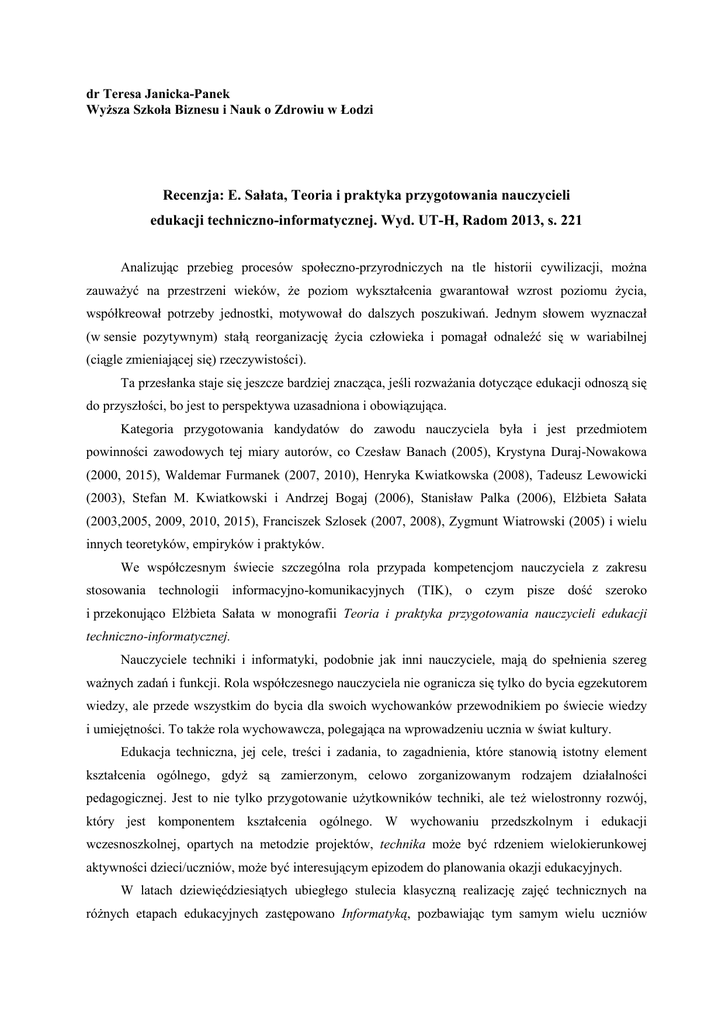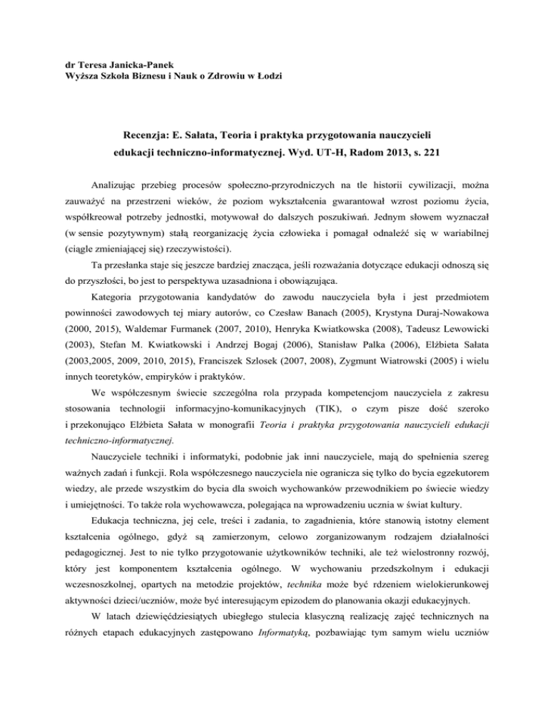 dr Teresa Janicka-Panek Wyższa Szkoła Biznesu i Nauk o Zdrowiu w Łodzi Recenzja: E. Sałata, Teoria i praktyka przygotowania nauczycieli edukacji techniczno-informatycznej. Wyd. UT-H, Radom 2013, s. 221 Analizując przebieg procesów społeczno-przyrodniczych na tle historii cywilizacji, można zauważyć na przestrzeni wieków, że poziom wykształcenia gwarantował wzrost poziomu życia, współkreował potrzeby jednostki, motywował do dalszych poszukiwań. Jednym słowem wyznaczał (w sensie pozytywnym) stałą reorganizację życia człowieka i pomagał odnaleźć się w wariabilnej (ciągle zmieniającej się) rzeczywistości). Ta przesłanka staje się jeszcze bardziej znacząca, jeśli rozważania dotyczące edukacji odnoszą się do przyszłości, bo jest to perspektywa uzasadniona i obowiązująca. Kategoria przygotowania kandydatów do zawodu nauczyciela była i jest przedmiotem powinności zawodowych tej miary autorów, co Czesław Banach (2005), Krystyna Duraj-Nowakowa (2000, 2015), Waldemar Furmanek (2007, 2010), Henryka Kwiatkowska (2008), Tadeusz Lewowicki (2003), Stefan M. Kwiatkowski i Andrzej Bogaj (2006), Stanisław Palka (2006), Elżbieta Sałata (2003,2005, 2009, 2010, 2015), Franciszek Szlosek (2007, 2008), Zygmunt Wiatrowski (2005) i wielu innych teoretyków, empiryków i praktyków. We współczesnym świecie szczególna rola przypada kompetencjom nauczyciela z zakresu stosowania technologii informacyjno-komunikacyjnych (TIK), o czym pisze dość szeroko i przekonująco Elżbieta Sałata w monografii Teoria i praktyka przygotowania nauczycieli edukacji techniczno-informatycznej. Nauczyciele techniki i informatyki, podobnie jak inni nauczyciele, mają do spełnienia szereg ważnych zadań i funkcji. Rola współczesnego nauczyciela nie ogranicza się tylko do bycia egzekutorem wiedzy, ale przede wszystkim do bycia dla swoich wychowanków przewodnikiem po świecie wiedzy i umiejętności. To także rola wychowawcza, polegająca na wprowadzeniu ucznia w świat kultury. Edukacja techniczna, jej cele, treści i zadania, to zagadnienia, które stanowią istotny element kształcenia ogólnego, gdyż są zamierzonym, celowo zorganizowanym rodzajem działalności pedagogicznej. Jest to nie tylko przygotowanie użytkowników techniki, ale też wielostronny rozwój, który jest komponentem kształcenia ogólnego. W wychowaniu przedszkolnym i edukacji wczesnoszkolnej, opartych na metodzie projektów, technika może być rdzeniem wielokierunkowej aktywności dzieci/uczniów, może być interesującym epizodem do planowania okazji edukacyjnych. W latach dziewięćdziesiątych ubiegłego stulecia klasyczną realizację zajęć technicznych na różnych etapach edukacyjnych zastępowano Informatyką, pozbawiając tym samym wielu uczniów rozwijania zainteresowań konstrukcyjnych i technicznych. Gdy wreszcie ,,technika wróciła” do szkół, okazało się, że w wielu placówkach nie jest możliwe odtworzenie warunków kształcenia technicznego (politechnicznego); mam na myśli pracownie, umownie zwane praktyczno-technicznymi. Ponadto brakuje nauczycieli z kwalifikacjami uzyskanymi w trybie kształcenia akademickiego. Jednocześnie pojawiła się kategoria dwuzawodowości: nauczyciel Informatyki/Techniki. Nasuwa się więc pytanie: Co jest przyczyną tego, że obowiązujące w latach 1999-2015 podstawy programowe cechuje minimalizm, marginalizacja zadań technicznych, przybliżenie do plastyki, odejście od manualizmu, o wartości którego pisał Tadeusz Wacław Nowacki (zob. Tworząca ręka, 2008). Recenzowana publikacja składa się z sześciu rozdziałów. Pierwsze cztery mają charakter teoretyczny. Rozważania na temat kształcenia nauczycieli edukacji techniczno-informatycznej nie sposób prowadzić bez odniesienia do przemian, jakie zachodzą w świcie w edukacji. Inspiracją dla reformy oświaty, w tym również instytucji kształcących nauczycieli, są międzynarodowe raporty. W pracy zostały opisane główne kierunki rozwoju edukacji w krajach Unii Europejskiej, a także współczesne orientacje, koncepcje i modele edukacji nauczycielskiej w Polsce. System edukacji powinien być otwarty na zmiany zachodzące w świecie, nieustannie się rozwijać, ulepszać i doskonalić. Do podstawowych zadań należy również poprawa systemu kształcenia, doskonalenia oraz zatrudniania nauczycieli. Ciągle stoimy przed zmianą programów nauczania w szkolnictwie wyższym. Rośnie autonomia i odpowiedzialność uczelni za tworzone i prowadzone programy studiów. Temu zagadnieniu został poświęcony jeden z podrozdziałów opracowania. Kolejny rozdział dotyka bardzo istotnej problematyki, a mianowicie przygotowania nauczycieli techniki i informatyki. We współczesnej szkole szczególna rola przypada właśnie tym nauczycielom. Muszą być przygotowani do wprowadzenia dzieci i młodzieży w świat techniki oraz informatyki. Na przygotowanie nauczycieli edukacji techniczno-informatycznej składa się kształcenia technicznoinformatyczne, pedagogiczno-psychologiczne i praktyczne. Analiza wyników badań własnych stanowi znaczącą część recenzowanego opracowania. Zamieszczono w nim wyniki oraz dyskusję uzyskanych rezultatów badań własnych. Prezentacji wyników dokonano w następujących zakresach: motywacja wyboru studiów przez kandydatów, przygotowanie pedagogiczno-psychologiczne, a także techniczne i informatyczne studentów. Ponadto określono na podstawie obserwacji zajęć szkolnych, analizy dokumentów i opinii studentów umiejętności pedagogiczno-psychologiczne, studiujących edukację techniczną i informatyczną. W tej części opracowania określono również przygotowanie studentów do zawodu nauczyciela podczas praktyk zawodowych. Głównym motywem studentów, podejmujących studia, są zainteresowania przedmiotami kierunkowymi. Nauczyciel przedmiotów technicznych i informatycznych jest przede wszystkim nauczycielem w ogóle, a następnie specjalistą o