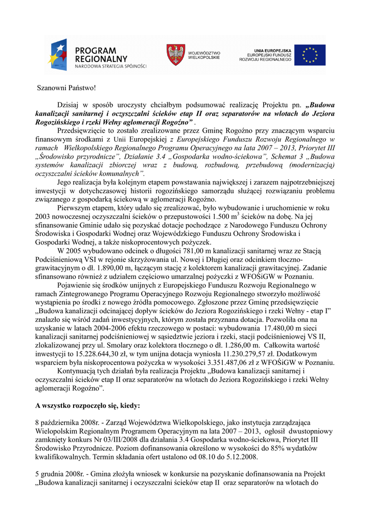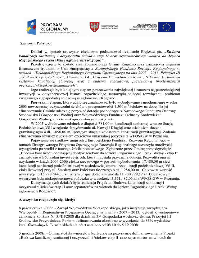 Szanowni Państwo! Dzisiaj w sposób uroczysty chciałbym podsumować realizację Projektu pn. „Budowa kanalizacji sanitarnej i oczyszczalni ścieków etap II oraz separatorów na wlotach do Jeziora Rogozińskiego i rzeki Wełny aglomeracji Rogoźno” . Przedsięwzięcie to zostało zrealizowane przez Gminę Rogoźno przy znaczącym wsparciu finansowym środkami z Unii Europejskiej z Europejskiego Funduszu Rozwoju Regionalnego w ramach Wielkopolskiego Regionalnego Programu Operacyjnego na lata 2007 – 2013, Priorytet III „Środowisko przyrodnicze”, Działanie 3.4 „Gospodarka wodno-ściekowa”, Schemat 3 „Budowa systemów kanalizacji zbiorczej wraz z budową, rozbudową, przebudową (modernizacją) oczyszczalni ścieków komunalnych”. Jego realizacja była kolejnym etapem powstawania największej i zarazem najpotrzebniejszej inwestycji w dotychczasowej historii rogozińskiego samorządu słuŜącej rozwiązaniu problemu związanego z gospodarką ściekową w aglomeracji Rogoźno. Pierwszym etapem, który udało się zrealizować, było wybudowanie i uruchomienie w roku 2003 nowoczesnej oczyszczalni ścieków o przepustowości 1.500 m3 ścieków na dobę. Na jej sfinansowanie Gminie udało się pozyskać dotacje pochodzące z Narodowego Funduszu Ochrony Środowiska i Gospodarki Wodnej oraz Wojewódzkiego Funduszu Ochrony Środowiska i Gospodarki Wodnej, a takŜe niskoprocentowych poŜyczek. W 2005 wybudowano odcinek o długości 781,00 m kanalizacji sanitarnej wraz ze Stacją Podciśnieniową VSI w rejonie skrzyŜowania ul. Nowej i Długiej oraz odcinkiem tłocznograwitacyjnym o dł. 1.890,00 m, łączącym stację z kolektorem kanalizacji grawitacyjnej. Zadanie sfinansowano równieŜ z udziałem częściowo umarzalnej poŜyczki z WFOŚiGW w Poznaniu. Pojawienie się środków unijnych z Europejskiego Funduszu Rozwoju Regionalnego w ramach Zintegrowanego Programu Operacyjnego Rozwoju Regionalnego stworzyło moŜliwość wystąpienia po środki z nowego źródła pomocowego. Zgłoszone przez Gminę przedsięwzięcie „Budowa kanalizacji odcinającej dopływ ścieków do Jeziora Rogozińskiego i rzeki Wełny - etap I” znalazło się wśród zadań inwestycyjnych, którym została przyznana dotacja. Pozwoliła ona na uzyskanie w latach 2004-2006 efektu rzeczowego w postaci: wybudowania 17.480,00 m sieci kanalizacji sanitarnej podciśnieniowej w sąsiedztwie jeziora i rzeki, stacji podciśnieniowej VS II, zlokalizowanej przy ul. Smolary oraz kolektora tłocznego o dł. 1.286,00 m. Całkowita wartość inwestycji to 15.228.644,30 zł, w tym unijna dotacja wyniosła 11.230.279,57 zł. Dodatkowym wsparciem była niskoprocentowa poŜyczka w wysokości 3.351.487,06 zł z WFOŚiGW w Poznaniu. Kontynuacją tych działań była realizacja Projektu „Budowa kanalizacji sanitarnej i oczyszczalni ścieków etap II oraz separatorów na wlotach do Jeziora Rogozińskiego i rzeki Wełny aglomeracji Rogoźno”. A wszystko rozpoczęło się, kiedy: 8 października 2008r. - Zarząd Województwa Wielkopolskiego, jako instytucja zarządzająca Wielopolskim Regionalnym Programem Operacyjnym na lata 2007 – 2013, ogłosił dwustopniowy zamknięty konkurs Nr 03/III/2008 dla działania 3.4 Gospodarka wodno-ściekowa, Priorytet III Środowisko Przyrodnicze. Poziom dofinansowania określono w wysokości do 85% wydatków kwalifikowalnych. Termin składania ofert ustalono od 08.10 do 5.12.2008. 5 grudnia 2008r. - Gmina złoŜyła wniosek w konkursie na pozyskanie dofinansowania na Projekt „Budowa kanalizacji sanitarnej i oczyszczalni ścieków etap II oraz separatorów na wlotach do Jeziora Rogozińskiego i rzeki Wełny aglomeracji Rogoźno”. Po pozytywnej ocenie formalnej i strategicznej nasz wniosek znalazł się na liście rankingowej inwestycji przewidzianych do dofinansowania, o czym zostaliśmy powiadomieni 23 czerwca 2009r. przez Wojewódzki Fundusz Ochrony Środowiska i Gospodarki Wodnej w Poznaniu. Jednocześnie poinformowano nas o konieczności złoŜenia wniosku o dofinansowanie wraz z wymaganymi załącznikami w terminie maksymalnie 10 miesięcy, czyli najpóźniej do 26 marca 2010 r. Rozpoczęła się walka z czasem. Po negocjacjach „z wolnej ręki” została podpisana umowa z Przedsiębiorstwem ProjektowoUsługowym „POZPROJEKT” z Poznania na sporządzenie aktualizacji dokumentacji projektowej na budowę kanalizacji sanitarnej. Wartość brutto usługi to 355.894,94 zł, a po negocjacjach z ogłoszeniem została podpisana umowa z Biurem Projektów Budownictwa Komunalnego z Wrocławia na opracowanie dokumentacji na rozbudowę oczyszczalni ścieków. Wartość usługi brutto to 355.439,68 zł. 26 marca 2010r. - W siedzibie WFOŚiGW w Poznaniu został złoŜony ostateczny wniosek o dofinansowanie naszego Projektu w ramach WRPO na lata 2007-2013, którego całkowity koszt został wyszacowany na kwotę brutto 39.452.102,39 zł. Uzyskana pozytywna ocena formalna i merytoryczna naszego wniosku spowodowała, Ŝe Uchwałą Nr 4212/2010 Zarządu Województwa Wielkopolskiego z dnia 22.07.2010 r. w sprawie: wyboru wniosku o dofinansowanie Gminy Rogoźno w ramach konkursu Nr 03/III/2008 realizowanego dla Działania 3.4 „Gospodarka wodno-ściekowa” w ramach Priorytetu III „Środowisko Przyrodnicze” Wielkopolskiego Regionalnego Programu Operacyjnego na lata 20072013, wniosek został zatwierdzony do dofinansowania. 13 września 2010r. - W siedzibie WFOŚiGW w Poznaniu podpisano umowę nr UDARPWP.03.04.03-30-006/10-00 o dofinansowanie Projektu „Budowa kanalizacji sanitarnej i oczyszczalni ścieków etap II oraz separatorów na wlotach do Jeziora Rogozińskiego i rzeki Wełny aglomeracji Rogoźno”. W imieniu władz Funduszu umowę podpisali prezes Zarządu Przemysław Gonera i z-ca prezesa Jerzy Puch, a z ramienia Gminy podpisy złoŜyli burmistrz Bogusław Janus i skarbnik Gminy Maria Kachlicka. Całkowita wartość Projektu to 39.452.102,39 zł, zaś kwota dofinansowania w formie 