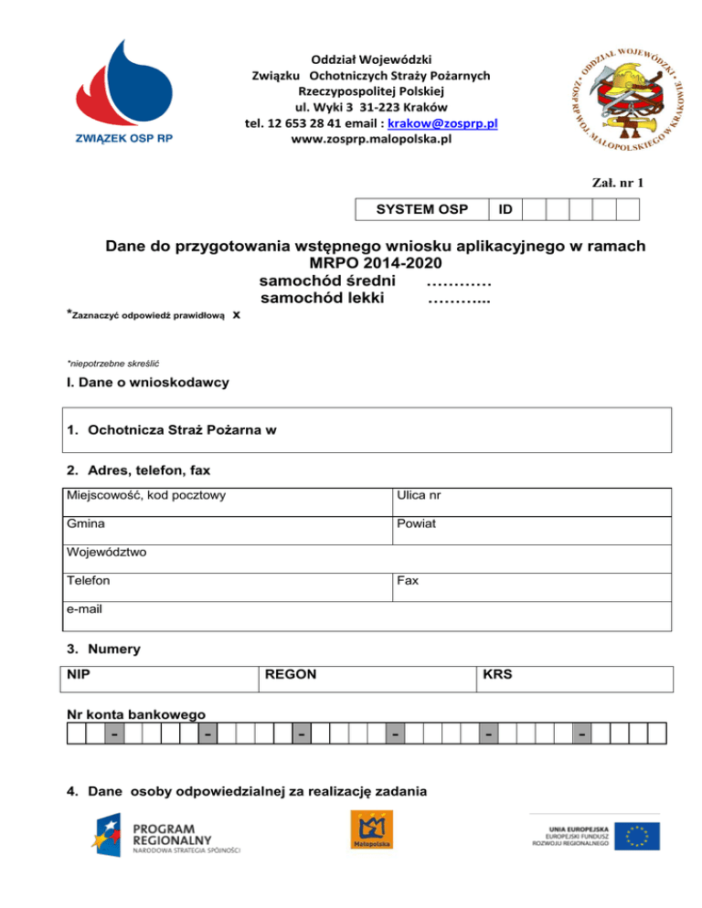 Oddział Wojewódzki Związku Ochotniczych Straży Pożarnych Rzeczypospolitej Polskiej ul. Wyki 3 31-223 Kraków tel. 12 653 28 41 email : [email protected] www.zosprp.malopolska.pl Zał. nr 1 SYSTEM OSP ID Dane do przygotowania wstępnego wniosku aplikacyjnego w ramach MRPO 2014-2020 samochód średni ………… samochód lekki ………... *Zaznaczyć odpowiedź prawidłową x *niepotrzebne skreślić I. Dane o wnioskodawcy 1. Ochotnicza Straż Pożarna w 2. Adres, telefon, fax Miejscowość, kod pocztowy Ulica nr Gmina Powiat Województwo Telefon Fax e-mail 3. Numery NIP REGON KRS Nr konta bankowego - - - - 4. Dane osoby odpowiedzialnej za realizację zadania - - Oddział Wojewódzki Związku Ochotniczych Straży Pożarnych Rzeczypospolitej Polskiej ul. Wyki 3 31-223 Kraków tel. 12 653 28 41 email : [email protected] www.zosprp.malopolska.pl Imię i Nazwisko tel. faks email II. Nazwa przedsięwzięcia III. OSP Należy do KSRG * TAK ……………… NIE ………………. *Zaznaczyć odpowiedź prawidłową x III. Statystyka Liczba Wyjazdów /potwierdzona przez właściwego Komendanta Miejskiego / Powiatowego PSP Rok 2010 2011 2012 2013 Liczba wyjazdów Oddział Wojewódzki Związku Ochotniczych Straży Pożarnych Rzeczypospolitej Polskiej ul. Wyki 3 31-223 Kraków tel. 12 653 28 41 email : [email protected] www.zosprp.malopolska.pl 2014 Razem ............................................................... (miejscowość, ............................................................................. data) (pieczątki i podpisy) Ilość strażaków posiadających aktualne szkolenia /potwierdzona przez właściwego Komendanta Miejskiego / Powiatowego PSP Rodzaj szkolenia Kurs podstawowy OSP Kurs KPP Ilość przeszkolonych Kurs z zakresu ratownictwa technicznego Kurs dla dowódców Kurs Naczelnika OSP Razem ............................................................... (miejscowość, data) ............................................................................. (pieczątki i podpisy) Oddział Wojewódzki Związku Ochotniczych Straży Pożarnych Rzeczypospolitej Polskiej ul. Wyki 3 31-223 Kraków tel. 12 653 28 41 email : [email protected] www.zosprp.malopolska.pl Odległość OSP od max do 5 km /potwierdzona przez właściwego Komendanta Miejskiego / Powiatowego PSP Rodzaj drogi Wpisać TAK/NIE Droga Krajowa Droga Wojewódzka ............................................................... (miejscowość, ............................................................................. data) (pieczątki i podpisy) VI. Opinie o wnioskującej OSP Opinia właściwego terytorialnie Oddziału Gminnego ZOSP RP ............................................................... (miejscowość, ............................................................................. data) IV Opinie Opinia właściwego samorządu terytorialnego / potwierdza Prezydent, Burmistrz , Wójt / (pieczątki i podpisy) Oddział Wojewódzki Związku Ochotniczych Straży Pożarnych Rzeczypospolitej Polskiej ul. Wyki 3 31-223 Kraków tel. 12 653 28 41 email : [email protected] www.zosprp.malopolska.pl ............................................................... (miejscowość, data) ............................................................................. (pieczątki i podpisy) Oddział Wojewódzki Związku Ochotniczych Straży Pożarnych Rzeczypospolitej Polskiej ul. Wyki 3 31-223 Kraków tel. 12 653 28 41 email : [email protected] www.zosprp.malopolska.pl Oświadczenie Ochotnicza Straż Pożarna w ……………………………………………… oświadcza, iż wyraża akces udziału w projekcie jako partner w ramach Osi priorytetowej 5 . Ochronna Środowiska .Działanie 5.1 Adaptacja do zmiany klimatu. Poddziałanie 5.1.2 Wsparcie służb ratunkowych W ramach realizacji zadania OSP planuje pozyskać środki z : OSP kwota Urząd Gminy kwota Pożyczki kwota Inne środki ( wymienić ) …………………….…. ………………..…….... ……………………….. ……………………….. Razem ……………………………… Podpis i pieczątki osób upoważnionych zgodnie z KRS Prezes OSP …………………………………………… Skarbnik OSP ……………………………………………..