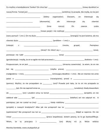 ComyśliszokandydaturzeTomka?Onchcebyć________________________________(nowydyrektor)w naszejfirmie.Tomekjest________________________________(ambitny),toprawda.Alemyślę,żeniejest ________________________________ _________________________ (dobry organizator). Owszem, ale interesuje (ekonomia), ________________________________ (inne rzeczy). on interesuje się On się również zawsze szuka ________________________________(nowepasje)inierealizuje________________________________ (starypomysł–l.mn.).Onmadużo________________________________(energia)itojestświetne,alema równieżdużo________________________________(problem–l.mn)z___________________________ (relacje) z ________________________________ (reszta, grupa). Pamiętasz ________________________________ (Ania)? On kłócił się z ______________________________ (ona), ponieważ nie lubił ________________________________ (ona) ________________________________ (gestykulacja).Imyślę,żeonwogólenielubipracowaćz____________________________(kobieta–l.mn). Przypuszczam,żeonjest________________________________(strasznyszowinista).Jawiem,żeonnie boi się ________________________________ (ciężka praca), _______________________________ (nadgodzina–l.mn),__________________________(stresującydeadline–l.mn).Aleonrównieżnieumie pytać o ________________________________ (rozwiązanie), prosić o ________________________ (pomoc). Myślisz, że nie przepadam za _________ (on)? Prawda jest taka, że to on nie przepada za _________(ja).Onniezaprosiłmniena________________________________(urodziny).Kiedydzwoniłem do ____________ (on) i pisałem smsy na temat ________________________________ (projekt), on nie odebrał ode ____________ (ja) ________________________________ (telefon) ani nie odpisał mi. A pamiętasz, jak nie czekał na (my) ___________, kiedy robiliśmy ________________________________ (projekt) o nowych kredytach? Albo jak nie przeprosił nas za ________________________________ (spóźnienie)? Nie przeprosił nas też za ________________________________ (błąd) w raporcie. On nie cierpi ________________________________ (praca zespołowa). Jestem pewny, że to go dyskwalifikuje. Wiem, że ty pracujesz z ________________ MonikaSiembida,www.studypolish.pl (on) dłużej niż ja. Może widzisz ________________________________ (plus l.mn.) __________________________ (ten awans). Ale ja myślę, że on spotyka się z ________________ (ty) na ______________(kawa), żeby mieć twój głos w konkursie na ____________________________ _____________________________ (program (dyrektor). ekonomiczny Wiem, – l. że on zna dużo mn), ale zna mało ________________________________ (język –l.mn) i nie uczy się ________________ (język chiński), a przecież nasz firma jest z ________________________________ (Chiny). Może jestem trochę ________________________________(niemiły)dla_______________(on).Alenapewnoniezagłosujęna ________________________________ (on). ________________________________ (on). ________________________________ (awans)? Wiem, że Może Pamiętasz, Kasia ja mieszka z szansę na mam jak szef wysłał mnie do ______________________________ (Japonia) w kwietniu albo do _____________________________ (Stany Zjednoczone) w zeszłym roku? Podróżowałem też służbowo do ________________________________ (kraj bałkański – l.mn). No i ostatnio pojechałem do ________________________________ (Francja) i ________________________________ (Niemcy). No i uczę się ________________________________ ________________________________ (najlepszy (trzy kandydat) języki). w tym Myślę, że konkursie. jestem Mam dużo ________________________________ (koleżanka) i ________________________________ (kolega) w pracy. Mam mało ________________________________ (konflikt – l.mn) z ________________________________ (nasza grupa). Nigdy nie plotkuję i jestem zawsze ________________________________ ________________________________(ja)? MonikaSiembida,www.studypolish.pl (punktualny). Zagłosujesz na MIANOWNIK NARZĘDNIK BIERNIK DOPEŁNIACZ 1. Jestem(ambitny,ładna,fajne)– 2. Jestem (ambitna aktorka, fajny kolega, dobry fizyk, miłe dziecko, dobre studentki) – Interesujęsię(imprezy,fizyka,językturecki,sport,podróżowanie,sztuka)– 3. Szukam(pasja,dziewczyna,chłopak,pomysł,obiad,dżem,pomidor)- MonikaSiembida,www.studypolish.pl 4. Realizuję(pomysł,spektakl,zadanie,wycieczka)– 5. Mamdużo(jabłko,banan,truskawka,malina,pomysł,praca,zadanie)– 6. Nielubię(brata,siostra,mojedziecko,dżemtruskawkowy,czarnydługopis,tenbudynek)– 7. Pamiętam(fizyka,matematyka,tosłowo,językturecki)– 8. Kłócićsięz(rodzice,koledzy,siostra,dziewczyna,chłopak)– 9. Baćsię(małedziecko,sztucznypająk,małyproblem–l.mn,deszcz)- 10. Pytaćo(mama,tata,brat,dżem,lekcja,numertelefonu,dziecko)- 11. Prosićo(czas,numertelefonu,herbata,kawa,obiad,brat)– 12. Przepadaćza(mama,tata,brat,dziewczyna,chłopak,tendeser,wycieczkiwgóry)– 13. Dzwonićdo(mama,tata,brat,dziewczyna,chłopak,szef)– 14. Telefonod(mama,tata,brat,dziewczyna,chłopak,szef)– 15. Czekaćna(mama,tata,brat,dziewczyna,chłopak,szef,obiad,kawa,herbata)– 16. Robić(zadanie,obiad,herbata)– 17. Przeprosićza(kłamstwo–l.mn,brat,siostra–l.mn,dziewczyna,chłopak,dziecko,obiad)– 18. Uczyćsię(fizyka,językturecki,językpolski,nowesłowo–l.mn)– 19. Jechaćdo(Chorwacja,Ukraina,Rosja,Włochy,Szwajcaria,Litwa,Łotwa)– 20. Byćz(Chorwacja,Ukraina,Rosja,Włochy,Szwajcaria,Litwa,Łotwa)– MonikaSiembida,www.studypolish.pl MonikaSiembida,www.studypolish.pl