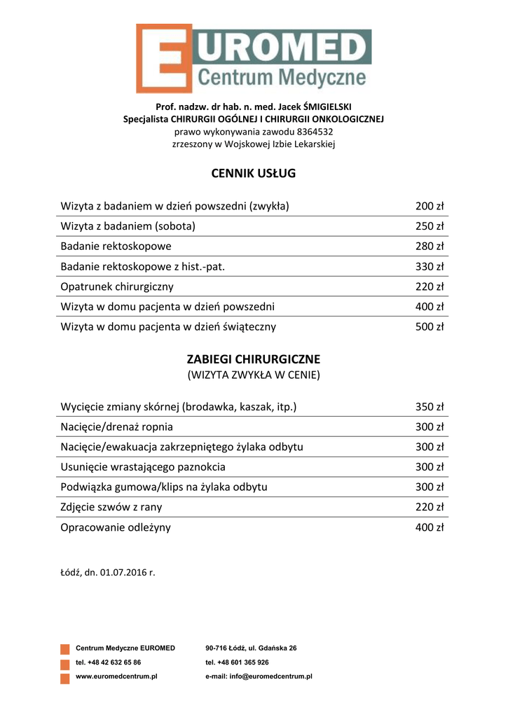 Prof. nadzw. dr hab. n. med. Jacek ŚMIGIELSKI Specjalista CHIRURGII OGÓLNEJ I CHIRURGII ONKOLOGICZNEJ prawo wykonywania zawodu 8364532 zrzeszony w Wojskowej Izbie Lekarskiej CENNIK USŁUG Wizyta z badaniem w dzień powszedni (zwykła) 200 zł Wizyta z badaniem (sobota) 250 zł Badanie rektoskopowe 280 zł Badanie rektoskopowe z hist.-pat. 330 zł Opatrunek chirurgiczny 220 zł Wizyta w domu pacjenta w dzień powszedni 400 zł Wizyta w domu pacjenta w dzień świąteczny 500 zł ZABIEGI CHIRURGICZNE (WIZYTA ZWYKŁA W CENIE) Wycięcie zmiany skórnej (brodawka, kaszak, itp.) 350 zł Nacięcie/drenaż ropnia 300 zł Nacięcie/ewakuacja zakrzepniętego żylaka odbytu 300 zł Usunięcie wrastającego paznokcia 300 zł Podwiązka gumowa/klips na żylaka odbytu 300 zł Zdjęcie szwów z rany 220 zł Opracowanie odleżyny 400 zł Łódź, dn. 01.07.2016 r. Centrum Medyczne EUROMED 90-716 Łódź, ul. Gdańska 26 tel. +48 42 632 65 86 tel. +48 601 365 926 www.euromedcentrum.pl e-mail: [email protected]