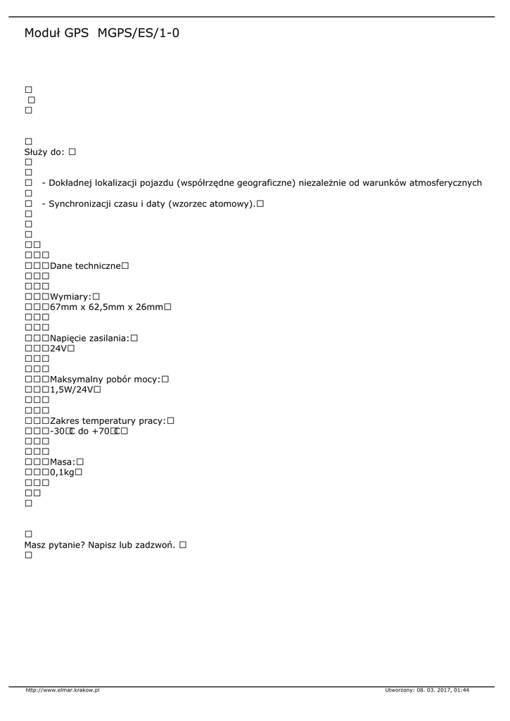Moduł GPS MGPS/ES/1-0 Służy do: - Dokładnej lokalizacji pojazdu (współrzędne geograficzne) niezależnie od warunków atmosferycznych - Synchronizacji czasu i daty (wzorzec atomowy). Dane techniczne Wymiary: 67mm x 62,5mm x 26mm Napięcie zasilania: 24V Maksymalny pobór mocy: 1,5W/24V Zakres temperatury pracy: -30ºC do +70ºC Masa: 0,1kg Masz pytanie? Napisz lub zadzwoń. http://www.elmar.krakow.pl Utworzony: 08. 03. 2017, 01:44