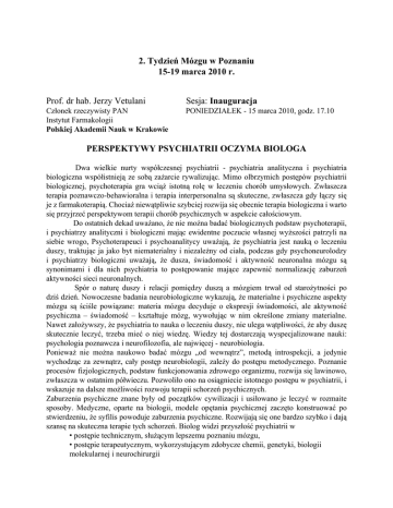 2. Tydzień Mózgu w Poznaniu 15-19 marca 2010 r. Prof. dr hab. Jerzy Vetulani Sesja: Inauguracja Członek rzeczywisty PAN Instytut Farmakologii Polskiej Akademii Nauk w Krakowie PONIEDZIAŁEK - 15 marca 2010, godz. 17.10 PERSPEKTYWY PSYCHIATRII OCZYMA BIOLOGA Dwa wielkie nurty współczesnej psychiatrii - psychiatria analityczna i psychiatria biologiczna współistnieją ze sobą zażarcie rywalizując. Mimo olbrzymich postępów psychiatrii biologicznej, psychoterapia gra wciąż istotną rolę w leczeniu chorób umysłowych. Zwłaszcza terapia poznawczo-behawioralna i terapia interpersonalna są skuteczne, zwłaszcza gdy łączy się je z farmakoterapią. Chociaż niewątpliwie szybciej rozwija się obecnie terapia biologiczna i warto się przyjrzeć perspektywom terapii chorób psychicznych w aspekcie całościowym. Do ostatnich dekad uważano, że nie można badać biologicznych podstaw psychoterapii, i psychiatrzy analityczni i biologiczni mając ewidentne poczucie własnej wyższości patrzyli na siebie wrogo, Psychoterapeuci i psychoanalitycy uważają, że psychiatria jest nauką o leczeniu duszy, traktując ja jako byt niematerialny i niezależny od ciała, podczas gdy psychoneurolodzy i psychiatrzy biologiczni uważają, że dusza, świadomość i aktywność neuronalna mózgu są synonimami i dla nich psychiatria to postępowanie mające zapewnić normalizację zaburzeń aktywności sieci neuronalnych. Spór o naturę duszy i relacji pomiędzy duszą a mózgiem trwał od starożytności po dziś dzień. Nowoczesne badania neurobiologiczne wykazują, że materialne i psychiczne aspekty mózgu są ściśle powiązane: materia mózgu decyduje o ekspresji świadomości, ale aktywność psychiczna – świadomość – kształtuje mózg, wywołując w nim określone zmiany materialne. Nawet założywszy, że psychiatria to nauka o leczeniu duszy, nie ulega wątpliwości, że aby duszę skutecznie leczyć, trzeba mieć o niej wiedzę. Wiedzy tej dostarczają wyspecjalizowane nauki: psychologia poznawcza i neurofilozofia, ale najwięcej - neurobiologia. Ponieważ nie można naukowo badać mózgu „od wewnątrz”, metodą introspekcji, a jedynie wychodząc za zewnątrz, cały postęp neurobiologii, zależy do postępu metodycznego. Poznanie procesów fizjologicznych, podstaw funkcjonowania zdrowego organizmu, rozwija się lawinowo, zwłaszcza w ostatnim półwieczu. Pozwoliło ono na osiągniecie istotnego postępu w psychiatrii, i wskazuje na dalsze możliwości rozwoju terapii schorzeń psychicznych. Zaburzenia psychiczne znane były od początków cywilizacji i usiłowano je leczyć w rozmaite sposoby. Medyczne, oparte na biologii, modele opętania psychicznej zaczęto konstruować po stwierdzeniu, że syfilis powoduje zaburzenia psychiczne. Rozwijają się one bardzo szybko i dają szansę na skuteczna terapie tych schorzeń. Biolog widzi przyszłość psychiatrii w • postępie technicznym, służącym lepszemu poznaniu mózgu, • postępie terapeutycznym, wykorzystującym zdobycze chemii, genetyki, biologii molekularnej i neurochirurgii • ulepszaniu metod psychoterapeutycznych • symbiozie podejścia biologicznego z podejściem psychologicznym Postęp techniczny dotyczy głównie metod badania mózgu, i obejmuje techniki takie, jak EEG i ERP, neuroobrazowanie, neurochemię, neurobiologię molekularną, genetykę i epigenetykę, oraz proteomikę. Postęp terapeutyczny to wprowadzenie neurochirurgii i technik głębokiej stymulacji mózgu, stały rozwój farmakologii, zwłaszcza wprowadzanie leków działających ponad neuroprzekaźnictwem, zwiększających neuroplastyczność i normujących rytmy dobowe, a wreszcie opracowania algorytmów pozwalających na symbiozę farmakoterapii i psychoterapii. Jednym z omówionych zagadnień będzie problem połączenia mózgu z komputerem przez interfejs celem sterowania komputera aktywnością kory mózgowej i jego implikacje.