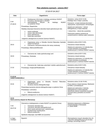 Plan szkolenia czynnych – wiosna 2017 27.03-07.04.2017 Data Forma zajęć Zagadnienia 2 dni 27-28.03 Podstawowe informacje o katalogu centralnym NUKAT Procedury obowiązujące w NUKAT Wprowadzanie danych do katalogu NUKAT (w systemie Virtua) Prowadzący: Rogoźnicka Wykłady dotyczące tworzenia rekordów haseł ujednoliconych dla: Szkolenie online (9.00-14.00). Każdego dnia 2 sesje z przerwą Ćwiczenia w bazie testowej (formularz , zapisywanie, wyszukiwanie, terminologia) Zadanie do wykonania: 1 rekord bibliograficzny w bazie testowej 1 rekord khw – rekord dla uczestnika nazwy osobowej nazwy ciała zbiorowego tytułu ujednolicony hasła typu autor/tytuł Wykonanie zadania uprawnia do uczestniczenia w dalszej części szkolenia (nagrania udostępnione na stronie Centrum NUKAT) 29.03 Organizacja pracy w Ośrodku Kontroli Rekordów Kartoteki Haseł Formalnych Ćwiczenia z tworzenia rekordu dla nazwy osobowej Ćwiczenia w bazie testowej. Zadanie do wykonania: 2-3 rekordy khw w bazie testowej na podstawie dostarczonych z Centrum NUKAT skanów Prowadzący: Malinowski/Mirowski 30.03 Szkolenie online (9.00-13.00). Ćwiczenia dot. hasła ujednoliconego serii Szkolenie online (9.00-13.00). Ćwiczenia w bazie testowej. Prowadzący: Wardzała Zadanie do wykonania: 2-3 rekordy khw w bazie testowej na podstawie dostarczonych z Centrum NUKAT skanów 31.03 Ćwiczenia dot. hasła typu autor/tytuł i tytułów ujednoliconych Szkolenie online (9.00-13.00). Ćwiczenia w bazie testowej. Prowadzący: Książczak/Rodakowska Zadanie do wykonania: 2-3 rekordy khw w bazie testowej na podstawie dostarczonych z Centrum NUKAT skanów 01-02.04 SOBOTA/NIEDZIELA 03.04 Organizacja pracy w Ośrodku Bibliograficznych Struktura rekordu bibliograficznego Kontroli Rekordów Prezentacja tworzenia rekordu bibliograficznego w systemie Virtua Prowadzący: Leonowicz Rekord analityczny (nagranie udostępnione na stronie Centrum NUKAT) Szkolenie online (12.00-15.00). Praca własna w bazie testowej. Możliwość kontaktu z prowadzącym Zadanie do wykonania: 2 rekordy bibliograficzne w bazie testowej dokumenty własne uczestnika (uczestnik przesyła skany potrzebne do kontroli opisu) 04.04 Dzień przerwy (dojazd do Warszawy) Ćwiczenia w katalogowaniu w bazie NUKAT (w systemie Virtua) 3 dni 05-07.04 Tworzenie rekordów khw Tworzenie rekordów bibliograficznych Druki zwarte jednotomowe i wielotomowe Wydawnictwa współwydane Rekord analityczny Szkolenie stacjonarne w Bibliotece Uniwersyteckiej w Warszawie ul. Dobra 56/66 Spotkanie dotyczące jhp KABA (na życzenie) w ciągu miesiąca Egzamin Wprowadzenie nowych rekordów khw (3) i rekordów bibliograficznych (5) do bazy katalogu centralnego NUKAT