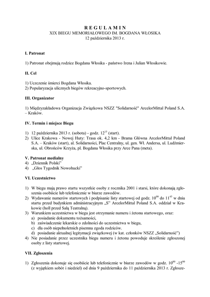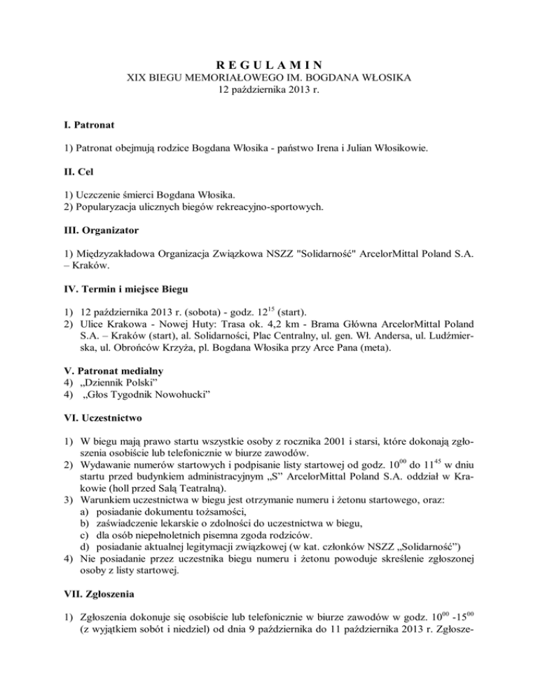 REGULAMIN XIX BIEGU MEMORIAŁOWEGO IM. BOGDANA WŁOSIKA 12 października 2013 r. I. Patronat 1) Patronat obejmują rodzice Bogdana Włosika - państwo Irena i Julian Włosikowie. II. Cel 1) Uczczenie śmierci Bogdana Włosika. 2) Popularyzacja ulicznych biegów rekreacyjno-sportowych. III. Organizator 1) Międzyzakładowa Organizacja Związkowa NSZZ "Solidarność" ArcelorMittal Poland S.A. – Kraków. IV. Termin i miejsce Biegu 1) 12 października 2013 r. (sobota) - godz. 1215 (start). 2) Ulice Krakowa - Nowej Huty: Trasa ok. 4,2 km - Brama Główna ArcelorMittal Poland S.A. – Kraków (start), al. Solidarności, Plac Centralny, ul. gen. Wł. Andersa, ul. Ludźmierska, ul. Obrońców Krzyża, pl. Bogdana Włosika przy Arce Pana (meta). V. Patronat medialny 4) „Dziennik Polski” 4) „Głos Tygodnik Nowohucki” VI. Uczestnictwo 1) W biegu mają prawo startu wszystkie osoby z rocznika 2001 i starsi, które dokonają zgłoszenia osobiście lub telefonicznie w biurze zawodów. 2) Wydawanie numerów startowych i podpisanie listy startowej od godz. 1000 do 1145 w dniu startu przed budynkiem administracyjnym „S” ArcelorMittal Poland S.A. oddział w Krakowie (holl przed Salą Teatralną). 3) Warunkiem uczestnictwa w biegu jest otrzymanie numeru i żetonu startowego, oraz: a) posiadanie dokumentu tożsamości, b) zaświadczenie lekarskie o zdolności do uczestnictwa w biegu, c) dla osób niepełnoletnich pisemna zgoda rodziców. d) posiadanie aktualnej legitymacji związkowej (w kat. członków NSZZ „Solidarność”) 4) Nie posiadanie przez uczestnika biegu numeru i żetonu powoduje skreślenie zgłoszonej osoby z listy startowej. VII. Zgłoszenia 1) Zgłoszenia dokonuje się osobiście lub telefonicznie w biurze zawodów w godz. 1000 -1500 (z wyjątkiem sobót i niedziel) od dnia 9 października do 11 października 2013 r. Zgłosze- nia grupowe szkół, uczelni, klubów sportowych w postaci imiennych wykazów z podanym rokiem urodzenia uczestnika biegu muszą zawierać także potwierdzenie od lekarza o zdolności do biegu osób wymienionych na wykazie oraz pieczątkę dyrekcji szkoły, uczelni lub klubu. 2) Zgłoszenia indywidualne osób zamieszkałych poza gminą Kraków mogą być dokonywane w dniu zawodów do godz. 1100. 3) Siedzibą biura zawodów jest biuro Komisji Robotniczej Hutników NSZZ "Solidarność", budynek "S", klatka A, pok. 103, ArcelorMittal Poland S.A., Kraków ul. Ujastek 1, tel. 12-290-18-19 lub 12-290-37-62, fax: 12-290-37-68 lub 12-290-37-72. VIII. Zasady zachowania się uczestników Biegu istotne dla bezpieczeństwa ruchu drogowego 1) Uczestnicy ruszają do biegu z linii startu po sygnale podanym przez Organizatora. 2) Zawodnicy biegną wyłącznie trasą (ulicami) wyznaczoną przez Organizatora. 3) Wszyscy uczestnicy bezwzględnie podporządkowują się decyzjom Służb Porządkowych Organizatora i Policji Państwowej. IX. Klasyfikacja 1) Kobiety (K) ♦ kat. I - rocznik 2001 - 2000 ♦ kat. II - rocznik 1999 - 97 ♦ kat. III – rocznik 1996 i starsze ♦ kat. IV - zawodniczki zrzeszone od rocznika 1995 ♦ kat. V - członkinie NSZZ "Solidarność" 2) Mężczyźni (M) ♦ kat. I - rocznik 2001 - 2000 ♦ kat. II - rocznik 1999 - 97 ♦ kat. III - rocznik 1996 - 94 ♦ kat. IV - rocznik 1993 -78 ♦ kat. V - rocznik 1977 - 58 ♦ kat. VI - rocznik 1957 i starsi ♦ kat. VII - zawodnicy zrzeszeni od rocznika 1995 i starsi 3) Mężczyźni - członkowie NSZZ "Solidarność" (MS) ♦ kat. I - rocznik 1995 - 83 ♦ kat. II - rocznik 1982 -66 ♦ kat. III - rocznik 65 i starsi ♦ kat. IV – członkowie NSZZ „S” ArcelorMittal Poland S.A. 4) Organizatorzy przewidują cenne nagrody w poszczególnych kategoriach. X. Zakończenie Memoriału 1) Złożenie kwiatów przed pomnikiem B. Włosika, 2) Uroczyste zakończenie biegu na placyku przed Kościołem Arka Pana, ogłoszenie wyników i rozdanie nagród. 3) Ogłoszenie wyników i rozdanie nagród nastąpi ok. 45 min. po zakończeniu biegu przez ostatniego uczestnika. XI. Postanowienia końcowe 1) 2) 3) 4) Uczestników obowiązuje niniejszy regulamin. Wszyscy uczestnicy biegu są ubezpieczeni od następstw nieszczęśliwych wypadków. Uczestników obowiązuje strój sportowy. Podczas biegu i na mecie uczestnicy muszą posiadać żeton i przypięty numer startowy. Uchybienia w tym zakresie powodują nie sklasyfikowanie uczestnika biegu. 5) Uczestnicy, którzy pokonają dystans niezgodnie z wytyczoną trasą nie zostaną sklasyfikowani. 6) Protesty pisemne przyjmuje komisja sędziowska na mecie biegu, do 20 min po zakończonym biegu. 7) Koszty uczestnictwa w biegu ponoszą startujący zawodnicy. 8) Organizator nie bierze odpowiedzialności za bezpieczeństwo osób trenujących na trasie biegu oraz osób bez numerów startowych i żetonów startowych. 9) Ze względu na ilość zgłoszeń organizator może dokonać zmian regulaminowych dotyczących pkt. IX niniejszego Regulaminu. 10) Każdy uczestnik biegu otrzyma okolicznościową pamiątkę. 11) Dla uczestników biegu organizator zapewnia posiłek. 12) Bieg odbędzie się bez względu na pogodę. 13) Klasyfikację grupową (szkół) określają zasady dla tej kategorii ujęte w pkt. XII niniejszego Regulaminu. 14) Cała klasyfikacja biegu zostanie ogłoszona na stronie internetowej: www.solidarnosc.krhhts.pl 15) Inne ustalenia zostaną ogłoszone przed startem. 16) Interpretacja niniejszego regulaminu należy do Sędziego Głównego. XII. Zasady punktacji grupowej dla szkół. 1) Klasyfikacja obejmuje kategorie K-I, K-II, K-III, M-I. M-II, M-III (roczniki 1995 – 2001). 2) Klasyfikacją objęte są szkoły, do których uczęszczają uczniowie biorący udział w biegu memoriałowym. 3) Szkoła ujęta zostaje w klasyfikacji grupowej jeżeli : a) w podanych wyżej kategoriach lub w jednej z nich przynajmniej10-ciu jej zawodników zostanie sklasyfikowanych, b) punktacja : ♦ za każdego sklasyfikowanego uczestnika – 1 pkt. ♦ za zajęcie miejsca w danej kategorii o