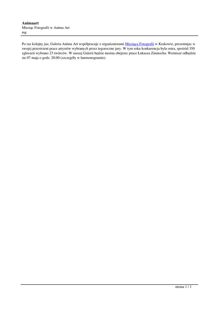 Animaart Miesiąc Fotografii w Anima Art mg Po raz kolejny juz, Galeria Anima Art współpracuje z organizatorami Miesiąca Fotografii w Krakowie, prezentujac w swojej przestrzeni prace artystów wybranych przez tegoroczne jury. W tym roku konkurencja była ostra, spośród 350 zgłoszeń wybrano 23 twórców. W naszej Galerii będzie można obejrzec prace Łukasza Zimnocha. Wernisaż odbędzie sie 07 maja o godz. 20.00 (szczegóły w harmonogramie). strona 1 / 1
