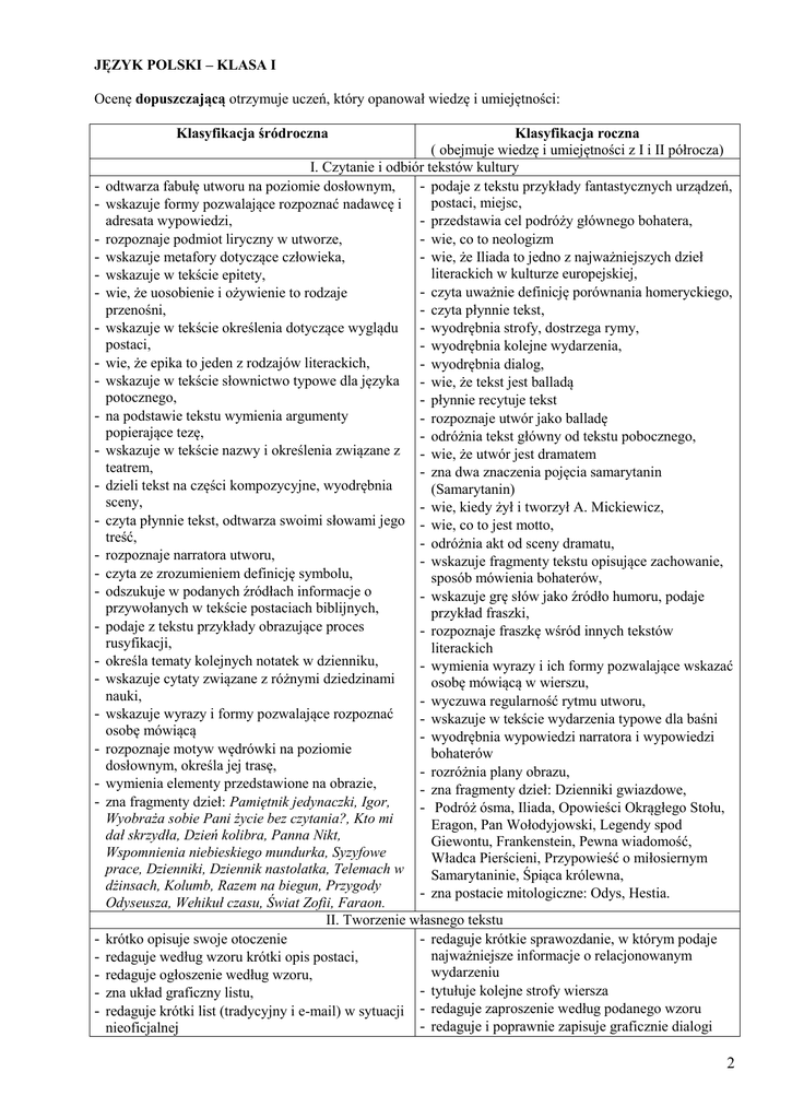 JĘZYK POLSKI – KLASA I Ocenę dopuszczającą otrzymuje uczeń, który opanował wiedzę i umiejętności: Klasyfikacja śródroczna - - Klasyfikacja roczna ( obejmuje wiedzę i umiejętności z I i II półrocza) I. Czytanie i odbiór tekstów kultury odtwarza fabułę utworu na poziomie dosłownym, - podaje z tekstu przykłady fantastycznych urządzeń, postaci, miejsc, wskazuje formy pozwalające rozpoznać nadawcę i adresata wypowiedzi, - przedstawia cel podróży głównego bohatera, rozpoznaje podmiot liryczny w utworze, - wie, co to neologizm wskazuje metafory dotyczące człowieka, - wie, że Iliada to jedno z najważniejszych dzieł literackich w kulturze europejskiej, wskazuje w tekście epitety, czyta uważnie definicję porównania homeryckiego, wie, że uosobienie i ożywienie to rodzaje przenośni, - czyta płynnie tekst, wskazuje w tekście określenia dotyczące wyglądu - wyodrębnia strofy, dostrzega rymy, postaci, - wyodrębnia kolejne wydarzenia, wie, że epika to jeden z rodzajów literackich, - wyodrębnia dialog, wskazuje w tekście słownictwo typowe dla języka - wie, że tekst jest balladą potocznego, - płynnie recytuje tekst na podstawie tekstu wymienia argumenty - rozpoznaje utwór jako balladę popierające tezę, - odróżnia tekst główny od tekstu pobocznego, wskazuje w tekście nazwy i określenia związane z - wie, że utwór jest dramatem teatrem, - zna dwa znaczenia pojęcia samarytanin dzieli tekst na części kompozycyjne, wyodrębnia (Samarytanin) sceny, - wie, kiedy żył i tworzył A. Mickiewicz, czyta płynnie tekst, odtwarza swoimi słowami jego - wie, co to jest motto, treść, - odróżnia akt od sceny dramatu, rozpoznaje narratora utworu, - wskazuje fragmenty tekstu opisujące zachowanie, czyta ze zrozumieniem definicję symbolu, sposób mówienia bohaterów, odszukuje w podanych źródłach informacje o - wskazuje grę słów jako źródło humoru, podaje przywołanych w tekście postaciach biblijnych, przykład fraszki, podaje z tekstu przykłady obrazujące proces - rozpoznaje fraszkę wśród innych tekstów rusyfikacji, literackich określa tematy kolejnych notatek w dzienniku, - wymienia wyrazy i ich formy pozwalające wskazać wskazuje cytaty związane z różnymi dziedzinami osobę mówiącą w wierszu, nauki, - wyczuwa regularność rytmu utworu, wskazuje wyrazy i formy pozwalające rozpoznać - wskazuje w tekście wydarzenia typowe dla baśni osobę mówiącą - wyodrębnia wypowiedzi narratora i wypowiedzi rozpoznaje motyw wędrówki na poziomie bohaterów dosłownym, określa jej trasę, - rozróżnia plany obrazu, wymienia elementy przedstawione na obrazie, - zna fragmenty dzieł: Dzienniki gwiazdowe, zna fragmenty dzieł: Pamiętnik jedynaczki, Igor, - Podróż ósma, Iliada, Opowieści Okrągłego Stołu, Wyobraża sobie Pani życie bez czytania?, Kto mi Eragon, Pan Wołodyjowski, Legendy spod dał skrzydła, Dzień kolibra, Panna Nikt, Giewontu, Frankenstein, Pewna wiadomość, Wspomnienia niebieskiego mundurka, Syzyfowe Władca Pierścieni, Przypowieść o miłosiernym prace, Dzienniki, Dziennik nastolatka, Telemach w Samarytaninie, Śpiąca królewna, dżinsach, Kolumb, Razem na biegun, Przygody - zna postacie mitologiczne: Odys, Hestia. Odyseusza, Wehikuł czasu, Świat Zofii, Faraon. II. Tworzenie własnego tekstu krótko opisuje swoje otoczenie - redaguje krótkie sprawozdanie, w którym podaje najważniejsze informacje o relacjonowanym redaguje według wzoru krótki opis postaci, wydarzeniu redaguje ogłoszenie według wzoru, - tytułuje kolejne strofy wiersza zna układ graficzny listu, redaguje krótki list (tradycyjny i e-mail) w sytuacji - redaguje zaproszenie według podanego wzoru - redaguje i poprawnie zapisuje graficznie dialogi nieoficjalnej 2 - tworzy dialog między postaciami przedstawionymi na plakacie - redaguje według wzoru dedykację - przy pomocy nauczyciela redaguje streszczenie, - - redaguje podziękowanie według wzoru wypisuje z tekstu określenia dotyczące wyglądu, usposobienia bohaterów korzystając ze słownika, dobiera wyrazy bliskoznaczne i przeciwstawne korzystając z podanego planu wydarzeń przy pomocy nauczyciela redaguje krótki opis przedmiotu przy niewielkiej pomocy redaguje opowiadanie o dalszych losach bohatera, wypisuje cytaty dotyczące przyjaźni, formułuje krótko własną opinię na temat utworu korzystając z wzoru, zapisuje dialog opowiada własnymi słowami przebieg wydarzeń, redaguje prostą instrukcję dotyczącą konkretnych działań redaguje notatkę, korzystając z podanego wzoru, redaguje gratulacje, redaguje krótką charakterystykę postaci według wzoru, korzystając z wzoru, redaguje ogłoszenie, wypisuje z tekstu zdania o charakterze sentencji. III. Mówienie i słuchanie wymienia elementy przyrody przywołane w - opowiada wybrane wydarzenie, utworze, - wymienia rycerskie atrybuty, wymienia bohaterów tekstu, krótko ich - przedstawia podstawowe zasady rycerskiego przedstawia, postępowania w formie kodeksu odtwarza własnymi słowami zawartość treściową - wymienia fantastyczne postacie, dzieli je na fragmentu powieści, bohaterów pozytywnych i negatywnych, przedstawia się w kilku zdaniach - wskazuje związki utworu z baśnią wymienia i nazywa elementy przedstawione na - określa miejsce, czas przedstawionych wydarzeń, plakacie, wymienia bohaterów biorących w nich udział, wie, że J. Kochanowski to jeden z - przedstawia własnymi słowami treść legendy, najwybitniejszych pisarzy polskich, opowiadania, wie, że rzeczywistość przedstawiona w utworze ma - rozpoznaje motyw nieba, przypomina symboliczne charakter fikcyjny, rozróżnia świat rzeczywisty i znaczenie nieba, fikcyjny, - określa ogólnie miejsce wydarzeń, opowiada własnymi słowami treść utworu, - przedstawia bohaterów, opowiada treść mitu o Syzyfie - wstępnie określa nastrój utworu, przypomina przyczyny tułaczki Odyseusza, - zna utwory Balladyna, Dziady cz. II, przedsta