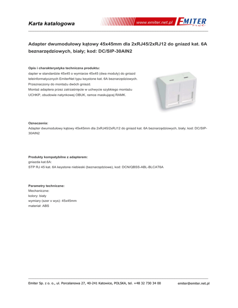 Karta katalogowa ___________________________________________________________________________ Adapter dwumodułowy kątowy 45x45mm dla 2xRJ45/2xRJ12 do gniazd kat. 6A beznarzędziowych, biały; kod: DC/SIP-30AIN2 Opis i charakterystyka techniczna produktu: dapter w standardzie 45x45 o wymiarze 45x45 (dwa moduły) do gniazd teleinformatycznych EmiterNet typu keystone kat. 6A beznarzędziowych. Przeznaczony do montażu dwóch gniazd. Montaż adaptera przez zatrzaśnięcie w uchwycie szybkiego montażu UCHKP, obudowie natynkowej OBUK, ramce maskującej RAMK. Oznaczenia: Adapter dwumodułowy kątowy 45x45mm dla 2xRJ45/2xRJ12 do gniazd kat. 6A beznarzędziowych, biały; kod: DC/SIP30AIN2 Produkty kompatybilne z adapterem: gniazda kat.6A: STP RJ 45 kat. 6A keystone niebieski (beznarzędziowe), kod: DCN/QBSS-ABL-BLCAT6A Parametry techniczne: Mechaniczne: kolory: biały wymiary (szer x wys): 45x45mm materiał: ABS ___________________________________________________________________________ Emiter Sp. z o. o., ul. Porcelanowa 27, 40-241 Katowice, POLSKA, tel. +48 32 730 34 00 [email protected]