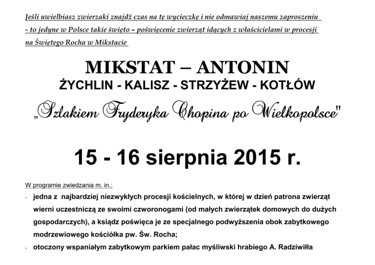 Jeśli uwielbiasz zwierzaki znajdź czas na tę wycieczkę i nie odmawiaj naszemu zaproszeniu - to jedyne w Polsce takie święto – poświęcenie zwierząt idących z właścicielami w procesji na Świętego Rocha w Mikstacie MIKSTAT – ANTONIN ŻYCHLIN - KALISZ - STRZYŻEW - KOTŁÓW „Szlakiem Fryderyka Chopina po Wielkopolsce” 15 - 16 sierpnia 2015 r. W programie zwiedzania m. in.: - jedna z najbardziej niezwykłych procesji kościelnych, w której w dzień patrona zwierząt wierni uczestniczą ze swoimi czworonogami (od małych zwierzątek domowych do dużych gospodarczych), a ksiądz poświęca je ze specjalnego podwyższenia obok zabytkowego modrzewiowego kościółka pw. Św. Rocha; - otoczony wspaniałym zabytkowym parkiem pałac myśliwski hrabiego A. Radziwiłła w Antoninie, w którym dwukrotnie gościł największy polski kompozytor, a obecnie corocznie organizowane są międzynarodowe konkursy pianistyczne „Chopin w barwach jesieni”; - klasycystyczny pałac Bronikowskich w Żychlinie z pomnikiem Fryderyka Chopina upamiętniającym jego pobyt; - pamiątki pobytu kompozytora u matki chrzestnej w Strzyżewie i na balu w Kaliszu; - jeden z najstarszych w Wielkopolsce romański kościół w Kotłowie - Sanktuarium Matki Boskiej – rozbudowany w niezwykle unikalny sposób w XIX wieku; - neobarokowy kościół pw. Św. Trójcy w Mikstacie ze stojącym przed nim zabytkowym wielofiguralnym drewnianym krzyżem, jedno z ostatnich zachowanych wolno stojących dzieł wybitnego wielkopolskiego rzeźbiarza ludowego – Pawła Brylińskiego. Wyjazd w sobotę o 8,00 z Placu Bankowego w Warszawie. Powrót w niedzielę ok. 21,00. Nocleg w luksusowym hotelu „Europa” w centrum Kalisza (pokoje 2-osobowe z pełnym węzłem sanitarnym). Koszt : 250.- zł. – (emeryci, dzieci, młodzież szkolna i studenci: 240.- zł.). Informacje i zapisy: u kierownika wycieczki - Marka Piaseckiego (tel. 603 404 213). Zapisy do wyczerpania miejsc, nie dłużej niż do środy 22 lipca