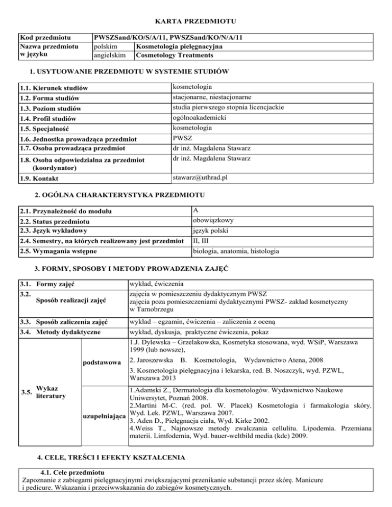 KARTA PRZEDMIOTU Kod przedmiotu Nazwa przedmiotu w języku PWSZSand/KO/S/A/11, PWSZSand/KO/N/A/11 polskim Kosmetologia pielęgnacyjna angielskim Cosmetology Treatments 1. USYTUOWANIE PRZEDMIOTU W SYSTEMIE STUDIÓW 1.1. Kierunek studiów kosmetologia 1.2. Forma studiów stacjonarne, niestacjonarne 1.3. Poziom studiów studia pierwszego stopnia licencjackie 1.4. Profil studiów ogólnoakademicki 1.5. Specjalność kosmetologia 1.6. Jednostka prowadząca przedmiot 1.7. Osoba prowadząca przedmiot PWSZ 1.8. Osoba odpowiedzialna za przedmiot (koordynator) dr inż. Magdalena Stawarz 1.9. Kontakt [email protected] dr inż. Magdalena Stawarz 2. OGÓLNA CHARAKTERYSTYKA PRZEDMIOTU 2.1. Przynależność do modułu A 2.2. Status przedmiotu 2.3. Język wykładowy obowiązkowy 2.4. Semestry, na których realizowany jest przedmiot II, III 2.5. Wymagania wstępne biologia, anatomia, histologia język polski 3. FORMY, SPOSOBY I METODY PROWADZENIA ZAJĘĆ 3.1. Formy zajęć wykład, ćwiczenia 3.2. zajęcia w pomieszczeniu dydaktycznym PWSZ zajęcia poza pomieszczeniami dydaktycznymi PWSZ- zakład kosmetyczny w Tarnobrzegu Sposób realizacji zajęć 3.3. Sposób zaliczenia zajęć wykład – egzamin, ćwiczenia – zaliczenia z oceną 3.4. Metody dydaktyczne wykład, dyskusja, praktyczne ćwiczenia, pokaz 1.J. Dylewska – Grzelakowska, Kosmetyka stosowana, wyd. WSiP, Warszawa 1999 (lub nowsze), podstawowa 2. Jaroszewska B. Kosmetologia, Wydawnictwo Atena, 2008 3. Kosmetologia pielęgnacyjna i lekarska, red. B. Noszczyk, wyd. PZWL, Warszawa 2013 3.5. Wykaz literatury 1.Adamski Z., Dermatologia dla kosmetologów. Wydawnictwo Naukowe Uniwersytet, Poznań 2008. 2.Martini M-C. (red. pol. W. Placek) Kosmetologia i farmakologia skóry, uzupełniająca Wyd. Lek. PZWL, Warszawa 2007. 3. Aden D., Pielęgnacja ciała, Wyd. Kirke 2002. 4.Weiss T., Najnowsze metody zwalczania cellulitu. Lipodemia. Przemiana materii. Limfodemia, Wyd. bauer-weltbild media (kdc) 2009. 4. CELE, TREŚCI I EFEKTY KSZTAŁCENIA 4.1. Cele przedmiotu Zapoznanie z zabiegami pielęgnacyjnymi zwiększającymi przenikanie substancji przez skórę. Manicure i pedicure. Wskazania i przeciwwskazania do zabiegów kosmetycznych. 4.2. Treści programowe 1.Sposoby przenikania substancji przez skórę. 2. Zabiegi pielęgnacyjne zwiększające przenikanie substancji przez skórę. 3.Wskazania i przeciwwskazania, bezpieczeństwo zabiegu w stosowaniu prądów i ultradźwięków, sonoforeza, mikromasaż. 4. Rozpoznawanie rodzajów skóry 5. Stosowanie masek kosmetycznych. 6. Zabiegi nawilżające, oczyszczające i ujędrniające skórę twarzy, szyi i dekoltu 7. Pielęgnacja rąk- masaż, manicure 8. Pielęgnacja stóp - masaż relaksacyjny, pedicure pielęgnacyjny, klamry korygujące. 9. Metody usuwania zbędnego owłosienia. 10. Zabiegi wspomagające redukcję cellulitu. 4.3. Efekty kształcenia Kod W01 Student, który zaliczył przedmiot Odniesienie do efektów kształcenia w zakresie WIEDZY: Zna metody oceny stanu skóry i paznokci wybranych zaburzeń i zmian chorobowych w zakresie niezbędnym do wykonywania zabiegów w gabinecie kosmetycznym. dla kierunku K_W06 dla obszaru M1_W03 W02 Zna mechanizm działania i skutki uboczne zabiegów pielęgnacyjnych wykonywanych w gabinecie kosmetycznym. K_W13 M1_W07 W03 Ma wiedzę w zakresie najważniejszych problemów i zagadnień właściwych dla kosmetologii pielęgnacyjnej oraz zna ich powiązanie z innymi. dyscyplinami naukowymi. K_W15 M1_W09 W04 Ma podstawową wiedzę i zna terminologię właściwą dla kosmetologa również w językach obcych. w zakresie UMIEJĘTNOŚCI: Posiada wystarczające umiejętności techniczne, manualne oraz predyspozycje ruchowe niezbędne do wykonywania zabiegów pielęgnacyjnych jonoforezy, mikrodermobrazji, peelingu kawitacyjnego itp. K_W16 M1_W10 K_U01 M1_U01 U02 Prawidłowo posługuje się podstawowym sprzętem i aparaturą stosowaną w pielęgnacji skóry. K_U02 M1_U02 U03 Identyfikuje problemy klienta podejmując odpowiednie działania diagnostyczne. K_U04, K_U05 M1_U04, M1_U05 U04 Identyfikuje błędy i zaniedbania w pracy z klientem. K_U07 M1_U07 U05 Opracowuje dokumentację dotycząca klienta. K_U09 M1_U09 U06 Planuje i realizacje zabiegi pielęgnacyjne. K_U10 M1_U10 U07 Ocenia przydatność środków, metod, form, niezbędnych w realizacji różnych form zabiegów. oraz procedur K_U11 M1_U08 M1_U10 w zakresie KOMPETENCJI SPOŁECZNYCH: Ma świadomość dynamicznego rozwoju współczesnej kosmetologii – rozumie potrzebę ustawicznego doskonalenia zawodowego. K_K01 U01 K01 K02 K03 K04 K05 Wykazuje aktywność w pracach zespołowych. Określa prawidłowo priorytety. Samodzielnie lub po konsultacjach potrafi rozwiązywać problemy. związane z wykonywaniemswoje zawodu Dba o bezpieczeństwo i kosmetologa pacjentów skutecznie stosuje właściwą ochronę. M1_K01 K_K06 K_K07 K_K08 K_K09 M1_K04 M1_K05 M1_K06 M1_K07 4.4. Metody weryfikacji efektów kształcenia Forma oceny Efekt Egzamin Egzamin kształcenia ustny pisemny W01 W02 W03 W04 U01 U02 U03 U04 U05 U06 U07 K01 K02 K03 K04 K05 Zadania do wykonania Referat Sprawozdanie Dyskusje Inne x x x x x x x x x x x x x x x x 4.5. Efekt kształcenia W01 - W04 U01 - U07 K01 - K05 5. Projekt Kolokwium Kryteria jakościowe uzyskania oceny w danym zakresie efektów kształcenia ocena dostateczny/dostateczny plus dobry/ dobry plus bardzo dobry (3/ 3,5) (4/ 4,5) (5) Zna wybrane terminy zakresu Zna większość Zna wszystkie wymagane terminy kosmetologii pielęgnacyjnej. terminów zakresu kosmetologii zakresu kosmetologii pielęgnacyjnej. pielęgnacyjnej. Potrafi wykonać niektóre Wykonuje poprawnie zabiegi Potrafi wykonać wszystkie zabiegi kosmetyczne z zakresu kosmetyczne z zakresu wymagane zabiegi kosmetyczne kosmetologii pielęgnacyjnej. kosmetologii pielęgnacyjnej. z zakresu kosmetologii pielęgnacyjnej Rozumie , ale nie zna skutków Rozumie i zna skutki Rozumie i zna skutki oraz wykonywanych zabiegów wykonywanych zabiegów pozatechni