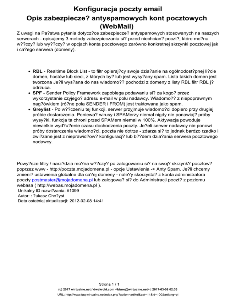 Opis zabezpieczeń antyspamowych kont pocztowych (WebMail)