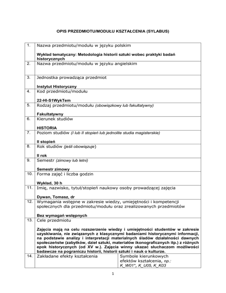 OPIS PRZEDMIOTU/MODUŁU KSZTAŁCENIA (SYLABUS) 1. Nazwa przedmiotu/modułu w języku polskim 2. Wykład tematyczny: Metodologia historii sztuki wobec praktyki badań historycznych Nazwa przedmiotu/modułu w języku angielskim 3. Jednostka prowadząca przedmiot 4. Instytut Historyczny Kod przedmiotu/modułu 5. 22-HI-S1WykTem Rodzaj przedmiotu/modułu (obowiązkowy lub fakultatywny) 6. Fakultatywny Kierunek studiów 7. HISTORIA Poziom studiów (I lub II stopień lub jednolite studia magisterskie) 8. II stopień Rok studiów (jeśli obowiązuje) 9. II rok Semestr (zimowy lub letni) Semestr zimowy 10. Forma zajęć i liczba godzin Wykład, 30 h 11. Imię, nazwisko, tytuł/stopień naukowy osoby prowadzącej zajęcia Dywan, Tomasz, dr 12. Wymagania wstępne w zakresie wiedzy, umiejętności i kompetencji społecznych dla przedmiotu/modułu oraz zrealizowanych przedmiotów Bez wymagań wstępnych 13. Cele przedmiotu Zajęcia mają na celu rozszerzenie wiedzy i umiejętności studentów w zakresie uzyskiwania, nie związanych z klasycznymi badaniami historycznymi informacji, na podstawie analizy i interpretacji materialnych śladów działalności dawnych społeczeństw (zabytków, dzieł sztuki, materiałów ikonograficznych itp.) z różnych epok historycznych (od XV w.). Zajęcia winny ukazać słuchaczom możliwości badawcze na pograniczu historii, historii sztuki i nauk o kulturze. 14. Zakładane efekty kształcenia Symbole kierunkowych efektów kształcenia, np.: K_W01*, K_U05, K_K03 1 WIEDZA Posiada pogłębioną, rozszerzoną i uporządkowaną wiedzę z zakresu historii prowadzącą do specjalizacji w obrębie badań nad zabytkami kultury materialnej. Ma pogłębioną wiedzę o metodach badawczych historii sztuki. Opanował na poziomie rozszerzonym terminologię nauk historycznych, jak też podstawową terminologię nauk o sztuce. Zna zagadnienia historii powszechnej na poziomie zaawansowanym w zakresie kilku epok historycznych w szczególności dotyczącej historii sztuki i kultury. Zna i rozumie diachroniczną strukturę przeszłości. Ma pogłębioną wiedzę o specyfice przedmiotowej i metodologicznej nauk historycznych, zwłaszcza w zakresie historii sztuki Posiada pogłębioną wiedzę pozwalającą na przeprowadzenie krytyki, analizy i interpretacji źródeł w postaci zabytków kultury materialnej i ikonografii w badaniach historycznych. Ma pogłębioną wiedzę o źródłach informacji pozyskiwanych w wyniku analizy i interpretacji zróżnicowanych form zabytków. Rozumie przydatność pozyskanych informacji w badaniach historycznych. Definiuje miejsce historii wśród innych nauk, rozumie cele prowadzenia badań historycznych. Rozumie i objaśnia pozycję i znaczenie nauk historycznych w obszarze nauk humanistycznych i nauk o sztuce Rozumie powiązania interdyscyplinarne historii i historii sztuki. Rozumie zastosowania metod i narzędzi badawczych historii sztuki w pracy historyka UMIEJĘTNOŚCI Samodzielnie zdobywa i pogłębia wiedzę oraz doskonali umiejętności badawcze w sposób uporządkowany i systematyczny, wykorzystując nowoczesne techniki pozyskiwania, klasyfikowania i analizowania informacji. Potrafi scharakteryzować i ocenić wzajemne relacje różnych kierunków badań historycznych takich jak klasyczna metodologia historii, historia kultury oraz historia sztuki Formułuje tematy badawcze; stosuje metody i techniki badań w zakresie wybranych problemów badawczych na pograniczu historii i historii sztuki Posługuje się teoriami i paradygmatami badawczymi dla opracowania wybranych zagadnień i projektów z użyciem metod badawczych historii sztuki Stosuje świadomie w mowie i w piśmie terminologię fachową właściwą dla nauk historycznych i nauk o sztuce, zarówno w pracy badawczej, jak i w popularyzacji nauk historycznych. Analizuje, interpretuje i wykorzystuje dla potrzeb własnych badań materialne pozostałości ludzkiej działalności Potrafi przeprowadzić pogłębioną krytykę źródeł historycznych w postaci zabytków kultury materialnej Systematyzuje informacje dotyczące nauk historycznych i nauk o sztuce, wykorzystując bibliografie, katalogi zabytków, leksykony terminologiczne, materiały inwentaryzacyjne i bazy danych Analizuje, interpretuje i prezentuje zebrane informacje w przejrzystej, usystematyzowanej i przemyślanej formie Wykorzystując zdobyte kompetencje i doświadczenia badawcze formułuje w sposób krytyczny i uzasadnia własne opinie dotyczące ważnych zagadnień z poszczególnych epok historycznych Komunikuje się w języku ojczystym z zastosowaniem profesjonalnej terminologii właściwej dla nauk historycznych i nauk o sztuce Określa i ocenia krytycznie stan swojej wiedzy fachowej. Korzysta z technologii informacyjnej, multimediów i zasobów Internetu. Potrafi oceniać i opracowywać uzyskane tą drogą informacje KOMPETENCJE PERSONALNE I SPOŁECZNE 2 K_W01 K_W02 K_W03 K_W05 K_W08 K_W10 K_W12 K_W13 K_W14 K_W15 K_U01 K_U02 K_U03 K_U04 K_U05 K_U06 K_U09 K_U08 K_U10 K_U13 K_U17 K_U20 K_U21 Dostrzega i formułuje problemy etyczne związane z pracą historyką i popularyzacją wiedzy historycznej. Docenia rolę nauk historycznych i nauk o sztuce tożsamości na poziomie lokalnym, regionalnym i narodowym Ma świadomość zakresu swojej wiedzy historycznej i umiejętności warsztatowych i rozumie potrzebę dalszego, ciągłego rozwoju kompetencji w zakresie historii sztuki. Docenia i szanuje tradycje oraz dziedzictwo historyczne i kulturowe Polski, swojego regionu i Europy. Aktywnie włącza się w ich promocję. Rozwija swoje zainteresowania fachowe, społeczne i kulturalne K_K01 K_K02 K_K03 K_K04 K_K06 15. Treści programowe - Historia sztuki wśród nauk historycznych i nauk o sztuce, kształtowanie się jej metod badawczych. - analiza formalo-genetyczna jako główna metoda badawcza w historii sztuki, omówienie jej zastosowania na konkretnych zabytkach z poszczególnych epok historycznych. - włączanie wyników badań analiz