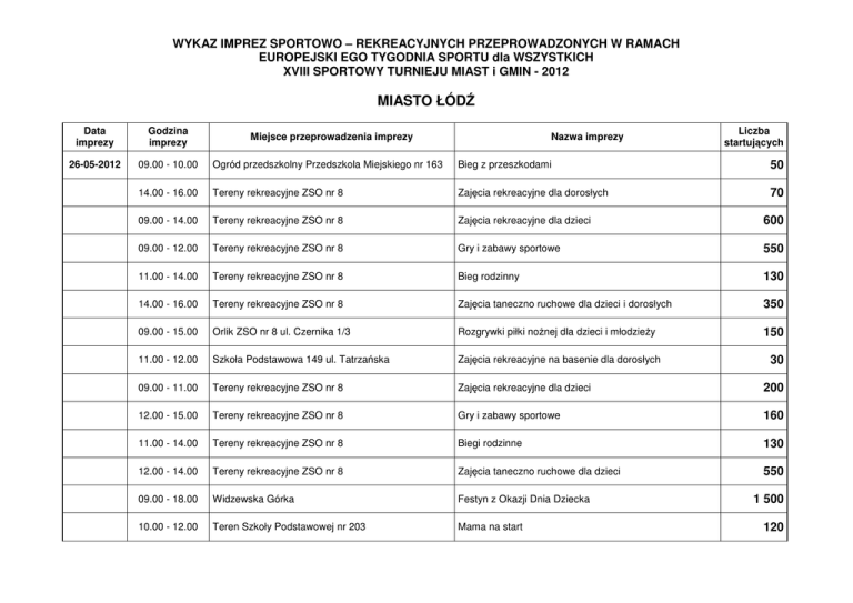 WYKAZ IMPREZ SPORTOWO – REKREACYJNYCH PRZEPROWADZONYCH W RAMACH EUROPEJSKI EGO TYGODNIA SPORTU dla WSZYSTKICH XVIII SPORTOWY TURNIEJU MIAST i GMIN - 2012 MIASTO ŁÓDŹ Data imprezy Godzina imprezy 26-05-2012 09.00 - 10.00 Ogród przedszkolny Przedszkola Miejskiego nr 163 Bieg z przeszkodami 50 14.00 - 16.00 Tereny rekreacyjne ZSO nr 8 Zajęcia rekreacyjne dla dorosłych 70 09.00 - 14.00 Tereny rekreacyjne ZSO nr 8 Zajęcia rekreacyjne dla dzieci 600 09.00 - 12.00 Tereny rekreacyjne ZSO nr 8 Gry i zabawy sportowe 550 11.00 - 14.00 Tereny rekreacyjne ZSO nr 8 Bieg rodzinny 130 14.00 - 16.00 Tereny rekreacyjne ZSO nr 8 Zajęcia taneczno ruchowe dla dzieci i dorosłych 350 09.00 - 15.00 Orlik ZSO nr 8 ul. Czernika 1/3 Rozgrywki piłki nożnej dla dzieci i młodzieży 150 11.00 - 12.00 Szkoła Podstawowa 149 ul. Tatrzańska Zajęcia rekreacyjne na basenie dla dorosłych 09.00 - 11.00 Tereny rekreacyjne ZSO nr 8 Zajęcia rekreacyjne dla dzieci 200 12.00 - 15.00 Tereny rekreacyjne ZSO nr 8 Gry i zabawy sportowe 160 11.00 - 14.00 Tereny rekreacyjne ZSO nr 8 Biegi rodzinne 130 12.00 - 14.00 Tereny rekreacyjne ZSO nr 8 Zajęcia taneczno ruchowe dla dzieci 550 09.00 - 18.00 Widzewska Górka Festyn z Okazji Dnia Dziecka 10.00 - 12.00 Teren Szkoły Podstawowej nr 203 Mama na start Miejsce przeprowadzenia imprezy Nazwa imprezy Liczba startujących 30 1 500 120 27-05-2012 28-05-2012 29-05-2012 10.00 - 16.00 Szkoła Podstawowa nr 205 Turniej Piłki Nożnej Dziewcząt 77 09.00 - 11.00 Okolice Wzniesień Łódzkich Rodzinny Rajd Rowerowy "Ruszamy z miejsc" 35 15.00 - 17.00 Szkoła Podstawowa nr 12 Zajęcia Taneczne dla dzieci 40 17.00 - 19.00 Szkoła Podstawowa nr 12 Zajęcia Taneczne i Ruchowe dla dzieci 70 09.00 - 12.00 Przedszkole Miejskie nr 175 Widzewska Spartakiada Przedszkolna 10.00 - 11.00 Boisko Osiedlowe Przedszkole 163 Mecz Piłki Nożnej 40 10.00 - 16.00 Aquapark Fala Łódź Al. Unii 4 Poznajemy miejsca rekreacji i sportu "Łódź-moje zdrowe miasto " 30 10.00 - 16.00 Orlik Łódż ul. Podhalańska 25 Mini Turniej Piłki nożnej Drużyn mieszanych 16.00 - 20.00 Siłownia TKKF Dzikusy ul. Kmicica Trójbój rekreacyjny na siłowni 15 16.00 - 18.00 Ognisko TKKF Sprawność Milionowa 78 Zajęcia rekreacyjne dla dzieci 30 18.00 - 20.00 Ognisko TKKF Sprawność Zso nr 8 ul. Czernika 1/3 Zajęcia taneczno ruchowe dla dorosłych 40 18.30 - 19.30 Szkoła Podstawowa nr 205 Zajęcia dla osób III Wieku 45 15.00 - 17.00 Szkoła Podstawowa nr 12 Zajęcia ruchowo taneczne dla dzieci 40 09.30 - 11.30 Przedszkole Miejskie nr 206 Widzewska Spartakiada Przedszkolna 75 16.30 - 18.00 Szkoła Podstawowa nr 189 ul. Kossaka 19 Rodzina to najlepsza drużyna Impreza integracyjna 18.00 - 20.00 Ognisko TKKF Sprawność ul. Milionowa Zajęcia rekreacyjne dla dorosłych 11.00 - 12.30 Ogród przedszkolny Przedszkola Miejskiego nr 163 Spartakiada lekkoatletyczna 10.00 - 16.00 Szkoła Podstawowa nr 203 Gry i zabawy na wesoło klasy II i III 120 120 300 40 240 50 30-05-2012 31-05-2012 01-06-2012 16.00 - 20.00 Siłownia TKKF Dzikusy ul. Kmicica Trójbój rekreacyjny na siłowni 15 15.00 - 17.00 Szkoła Podstawowa nr 12 Zajęcia taneczno ruchowe 40 16.00 - 18.00 Ognisko TKKF Sprowność ul. Milionowa 78 Zajęcia rekreacyjne dla dzieci 40 09.00 -11.00 Przedszkole Miejskie nr 175 Sportowy Dzień Dziecka Turniej Piłkarski 55 15.30 - 17.00 Ogród przedszkolny Przedszkola Miejskiego nr 163 Rodzinne Zawodu sportowe i tor z przeszkodami 16.00 - 18.00 Szkoła Podstawowa nr 203 Mistrzostwa szkoły w Bule-pentaque 50 17.00 - 18.30 Ogród przedszkolny Przedszkola Miejskiego nr 163 i Widzewska Górka Biegi rodzinne 90 09.00 - 11.00 Przedszkole Miejskie nr 175 Sportowy Dzień Dziecka - Tor przeszkód 10.00 - 13.00 Park Podolski Poznajemy miejsca rekreacji i sportu "Łódź-moje zdrowe miasto " 17.30 - 19.00 Szkoła Podstawowa nr 189 ul. Kossaka 19 Dzień Dziecka na sportowo - Szkoła Marzeń 18.00 - 19.30 Ognisko TKKF Sprawność ul. Milionowa 78 Zajęcia rekreacyjne dla dorosłych 40 16.00 - 18.00 Szkoła Podstawowa nr 12 Zajęcia taneczno ruchowe dla dzieci 40 18.30 - 19.30 Szkoła Podstawowa nr 205 Zajęcia dla osób III Wieku 35 09.00 - 11.00 Szkoła Podstawowa nr 203 Test Coopera 53 18.30 - 19.30 Szkoła Podstawowa nr 205 Zajęcia dla osób III Wieku 55 09.00 - 14.00 Szkoła Podstawowa nr 205 Spartakiada dla klas VI 75 09.00 - 11.00 Szkoła Podstawowa nr 12 Zajęcia taneczno ruchowe Pokazy 250 08.00 - 11.00 Szkoła Podstawowa nr 189 ul. Kossaka 19 Dzień Dziecka na sportowo - Szkoła Marzeń dla klas I - III 350 120 150 30 250 10.00 - 13.00 Szkoła Podstawowa nr 189 ul. Kossaka 19 Dzień Dziecka na sportowo - Turniej klas V i Vi w piłkę siatkową Turniej w dwa Ognie 12.00 - 14.30 Szkoła Podstawowa nr 91 Turniej Minisiatkówki 10.00 - 12.00 Szkołą Podstawowa nr 91 Wyścigi na wesoło 160 09.30-11.30 Przedszkole Miejskie nr 175 Sportowy dzień Dziecka 150 09.30-11.30 Ogród Przedszkolny Przedszkola Miejskgo nr 163 Sportowy Dzień Dziecka 240 09.00 - 13.00 Szkołą Podstawowa nr 203 Dzień sportu 200 13.00 - 14.00 Przedszkole Miejskie nr 175 Sportowy dzień Dziecka 120 13.00 - 14.00 Ogród Przedszkolny Przedszkola Miejskiego nr 163 Sportowy Dzień Dziecka 240 Razem 120 60 9 025