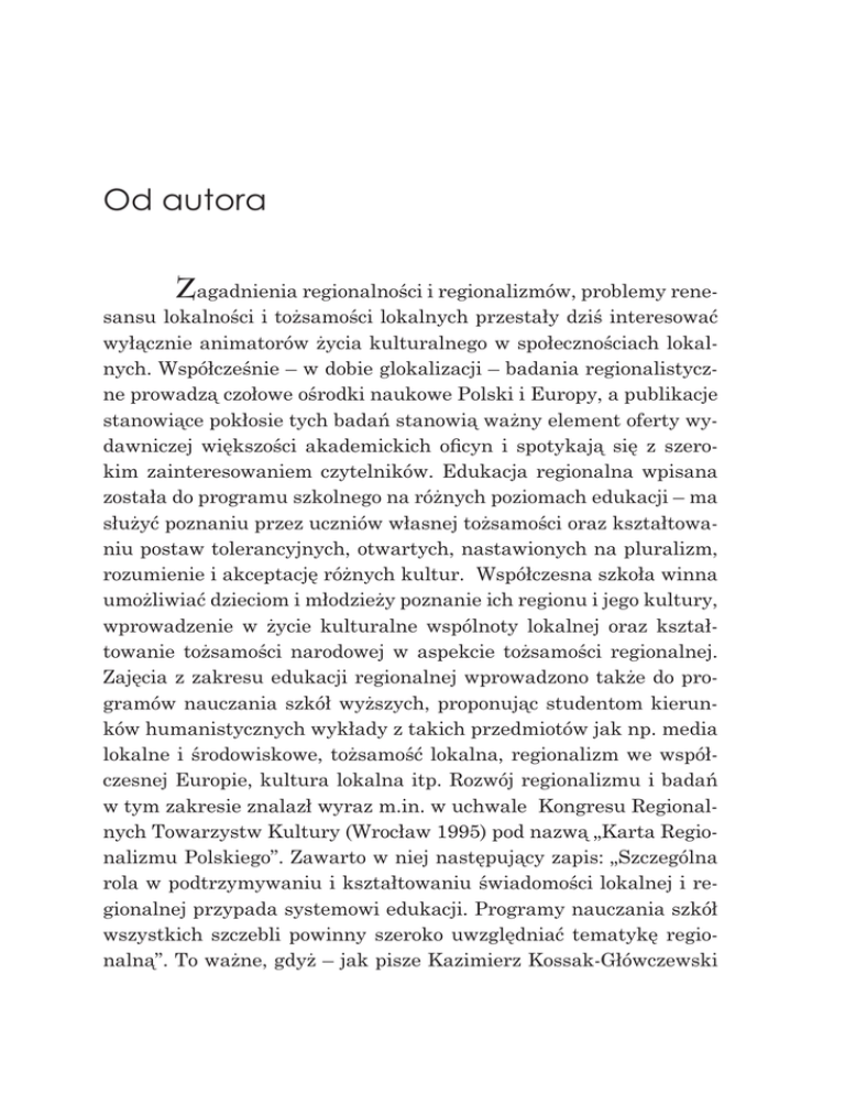 7 Od autora Zagadnienia regionalności i regionalizmów, problemy renesansu lokalności i tożsamości lokalnych przestały dziś interesować wyłącznie animatorów życia kulturalnego w społecznościach lokalnych. Współcześnie – w dobie glokalizacji – badania regionalistyczne prowadzą czołowe ośrodki naukowe Polski i Europy, a publikacje stanowiące pokłosie tych badań stanowią ważny element oferty wydawniczej większości akademickich oficyn i spotykają się z szerokim zainteresowaniem czytelników. Edukacja regionalna wpisana została do programu szkolnego na różnych poziomach edukacji – ma służyć poznaniu przez uczniów własnej tożsamości oraz kształtowaniu postaw tolerancyjnych, otwartych, nastawionych na pluralizm, rozumienie i akceptację różnych kultur. Współczesna szkoła winna umożliwiać dzieciom i młodzieży poznanie ich regionu i jego kultury, wprowadzenie w życie kulturalne wspólnoty lokalnej oraz kształtowanie tożsamości narodowej w aspekcie tożsamości regionalnej. Zajęcia z zakresu edukacji regionalnej wprowadzono także do programów nauczania szkół wyższych, proponując studentom kierunków humanistycznych wykłady z takich przedmiotów jak np. media lokalne i środowiskowe, tożsamość lokalna, regionalizm we współczesnej Europie, kultura lokalna itp. Rozwój regionalizmu i badań w tym zakresie znalazł wyraz m.in. w uchwale Kongresu Regionalnych Towarzystw Kultury (Wrocław 1995) pod nazwą „Karta Regionalizmu Polskiego”. Zawarto w niej następujący zapis: „Szczególna rola w podtrzymywaniu i kształtowaniu świadomości lokalnej i regionalnej przypada systemowi edukacji. Programy nauczania szkół wszystkich szczebli powinny szeroko uwzględniać tematykę regionalną”. To ważne, gdyż – jak pisze Kazimierz Kossak-Główczewski 8 Michał Kaczmarczyk – „istotą edukacji regionalnej jest powrót do domu, do źródeł życia każdego człowieka, do źródeł jego etyki i jego języka, a więc do źródeł kultury domowej, lokalnej, regionalnej, narodowej i ogólnoludzkiej”. Niniejsza książka stanowi pokłosie badań regionalistycznych nad przeszłością i teraźniejszością mediów lokalnych w Zagłębiu Dąbrowskim prowadzonych przez autora w Instytucie Dziennikarstwa i Komunikacji Społecznej Wyższej Szkoły Humanitas w Sosnowcu oraz Zakładzie Dziennikarstwa Uniwersytetu Śląskiego w Katowicach. Praca poświęcona jest zagadnieniom historycznoprasowym oraz współczesnym problemom związanym z funkcjonowaniem systemu komunikowania lokalnego w Zagłębiu. Pomieszczono w niej zarówno artykuły nowe, dotąd niepublikowane, jak i zmienione i rozszerzone wersje szkiców drukowanych w przeszłości w medioznawczych periodykach i pracach zbiorowych, takich jak „Rocznik Prasoznawczy” czy zeszyty serii „Oblicza prasy Śląska i Zagłębia Dąbrowskiego”, pod red. Dariusza Rotta i Michała Kaczmarczyka. Książka przygotowana została z myślą o studentach (dziennikarstwa, historii, kulturoznawstwa), uczniach oraz regionalistach, poszukujących wiedzy o mediach działających w Zagłębiu Dąbrowskim. Należy jednak podkreślić, iż nie ma ona charakteru monografii – intencją autora nie było bowiem dokonanie całościowej, wyczerpującej charakterystyki zagłębiowskich mediów w perspektywie historycznej i współczesnej, ale zaprezentowanie czytelnikowi zbioru szkiców odnoszących się do rozmaitych zjawisk i procesów charakterystycznych dla przestrzeni medialnej regionu. Z tego też powodu książkę traktować należy jako źródło materiałów o charakterze przyczynkarskim, zbiór swoistych sygnałów tematycznych, wymagających dalszych badań i uzupełnień. Autor wyraża nadzieję, że staną się one w przyszłości podstawą opracowania monografii prasy Zagłębia Dąbrowskiego. Michał Kaczmarczyk