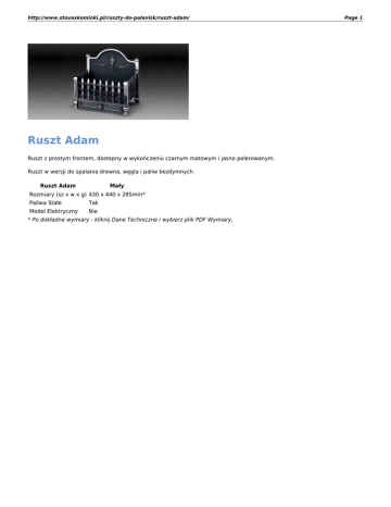 http://www.stovaxkominki.pl/ruszty-do-palenisk/ruszt-adam/ Ruszt Adam Ruszt z prostym frontem, dostepny w wykończeniu czarnym matowym i jasno polerowanym. Ruszt w wersji do spalania drewna, węgla i paliw bezdymnych. Ruszt Adam Mały Rozmiary (sz x w x g) 430 x 440 x 285mm* Paliwa Stałe Tak Model Elektryczny Nie * Po dokładne wymiary - kliknij Dane Techniczne i wybierz plik PDF Wymiary. Page 1