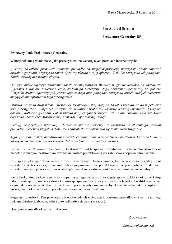 Rawa Mazowiecka, 3 kwietnia 2014 r. Pan Andrzej Seremet Prokurator Generalny RP Szanowny Panie Prokuratorze Generalny, Wstrząsnęła mną wiadomość, jaka przeczytałem na wczorajszych portalach internetowych: „…Dwaj 18-latków próbowało wymusić pieniądze od niepełnosprawnego mężczyzny. Kiedy odmówił, brutalnie go pobili. Mężczyzna zmarł. Sprawcy ukradli swojej ofierze… 7 zł. Już zatrzymali ich policjanci. Zabili inwalidę dla siedmiu złotych. Do tego bulwersującego zdarzenia doszło w miejscowości Bierwce w gminie Jedlińsk na Mazowszu. W jednym z domów znaleziono ciało 48-letniego mężczyzny. Jego obrażenia wskazywały na pobicie. W wyniku działań operacyjnych jeszcze tego samego dnia policjanci zatrzymali dwóch młodych mężczyzn, mogących być sprawcami tego przestępstwa. Okazało się, że to dwaj młodzi mieszkańcy tej okolicy. Obaj mają po 18 lat. Przyznali się do popełnienia tego przestępstwa. – Mężczyźni przyszli do 48-latka i próbowali wymusić od niego pieniądze. Kiedy ten odmówił, dotkliwie go pobili. Potem ukradli mu pieniądze w kwocie 7 zł – mówi Onetowi komisarz Alicja Śledziona, rzeczniczka Mazowieckiej Komendy Wojewódzkiej Policji. Według nieoficjalnych informacji, 18-latkowie już nie pierwszy raz wymuszali od 48-letniego inwalidy pieniądze. Wcześniej ulegał im, tym razem zaprotestował. Skończyło się to dla niego tragicznie. Jego oprawcom zostały przedstawione zarzuty rozboju i pobicia ze skutkiem śmiertelnym. Grozi za to do 12 lat więzienia. Na razie sąd aresztował 18-latków tymczasowo na trzy miesiące. Proszę, by Pan Prokurator Generalny zlecił nadzór nad ta sprawą i dopilnował, by ta okrutna zbrodnia na niepełnosprawnym, bezbronnym człowieku, została potraktowana jak zabójstwo i odpowiednio ukarana. Jeśli sprawcy katują człowieka bez litości i zakatowany człowiek umiera, to przecież sprawcy godzą się na śmiertelny skutek swojego działania. Ich czyn powinien być potraktowany nie jako pobicie ze skutkiem śmiertelnym, lecz jako zabójstwo ze szczególnym okrucieństwem, dokonane w zamiarze ewentualnym. Panie Prokuratorze Generalny – to nie pierwsza tego rodzaju sprawa, gdy sprawcy, którzy okrutnie katują i doprowadzają do śmierci człowieka, unikają sprawiedliwej kary z uwagi na łagodne kwalifikowanie ich czynu jako pobicia ze skutkiem śmiertelnym, podczas gdy powinno to być kwalifikowane jako zabójstwo ze szczególnym okrucieństwem, popełnione w zamiarze ewentualnym. Sugeruję, by udzielił Pan prokuratorom odpowiednich wytycznych odnośnie prawidłowej kwalifikacji tego rodzaju okrutnych zbrodni, żeby sprawiedliwości stawało się zadość. Dość pobłażania dla okrutnych zabójców! Z poważaniem Janusz Wojciechowski
