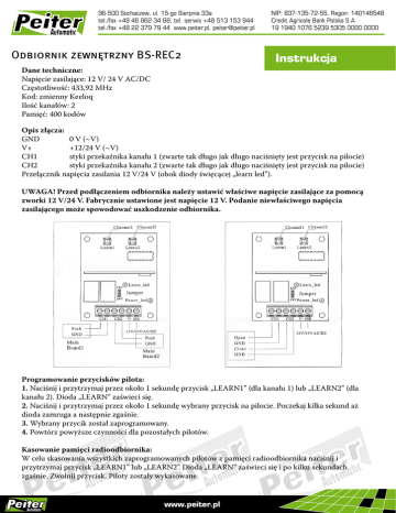 96-500 Sochaczew, ul. 15-go Sierpnia 33a tel./fax +48 46 862 34 88, tel. serwis +48 513 153 944 tel./fax +48 22 379 79 44 www.peiter.pl, [email protected] Odbiornik zewnętrzny BS-REC2 NIP: 837-135-72-55, Regon: 140146548 Credit Agricole Bank Polska S.A. 19 1940 1076 5239 5305 0000 0000 Instrukcja Dane techniczne: Napięcie zasilające: 12 V/ 24 V AC/DC Częstotliwość: 433,92 MHz Kod: zmienny Keeloq Ilość kanałów: 2 Pamięć: 400 kodów Opis złącza: GND 0 V (~V) V+ +12/24 V (~V) CH1 styki przekaźnika kanału 1 (zwarte tak długo jak długo naciśnięty jest przycisk na pilocie) CH2 styki przekaźnika kanału 2 (zwarte tak długo jak długo naciśnięty jest przycisk na pilocie) Przełącznik napięcia zasilania 12 V/24 V (obok diody święcącej „learn led”). UWAGA! Przed podłączeniem odbiornika należy ustawić właściwe napięcie zasilające za pomocą zworki 12 V/24 V. Fabrycznie ustawione jest napięcie 12 V. Podanie niewłaściwego napięcia zasilającego może spowodować uszkodzenie odbiornika. Programowanie przycisków pilota: 1. Naciśnij i przytrzymaj przez około 1 sekundę przycisk „LEARN1” (dla kanału 1) lub „LEARN2” (dla kanału 2). Dioda „LEARN” zaświeci się. 2. Naciśnij i przytrzymaj przez około 1 sekundę wybrany przycisk na pilocie. Poczekaj kilka sekund aż dioda zamruga a następnie zgaśnie. 3. Wybrany przycik został zaprogramowany. 4. Powtórz powyższe czynności dla pozostałych pilotów. Kasowanie pamięci radioodbiornika: W celu skasowania wszystkich zaprogramowanych pilotów z pamięci radioodbiornika naciśnij i przytrzymaj przycisk „LEARN1” lub „LEARN2”. Dioda „LEARN” zaświeci się i po kilku sekundach zgaśnie. Zwolnij przycisk. Piloty zostały wykasowane. www.peiter.pl