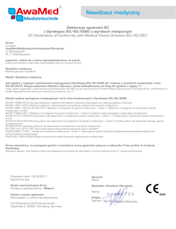 ® Nawilżacz medyczny Deklaracja zgodności EC z Dyrektywą 93/42/EWG o wyrobach medycznych EC Declaration of Conformity with Medical Device Directive 93/42/EEC Firma: Company: AwaMed-Medizintechnik Arkadiusz Warzyński ul. Santocka 44 PL 71-083 Szczecin zapewnia i deklaruje z pełną odpowiedzialnością, że wyrób: ensure and declare under sole responsibility, that our product of kind: Nawilżacz medyczny Medical gas flow regulators Model: Nawilżacz medyczny jest zgodny z mającymi zastosowanie wymaganiami Dyrektywy 93/42/EWG jak i Ustawy o wyrobach medycznych z dnia 20.05.2010, Rozporządzeniami Ministra Zdrowia i został sklasyfikowany do klasy IIb zgodnie z regułą 11. meet, where applicable, requirements of Directive 93/42/EEC so as requirements of Polish Medical Devices Act of 20 May 2010, and Ministry of Health Regulations and belong to class IIb according to rule 11. Wyrób spełnia wymagania następujących norm zharmonizowanych z Dyrektywą 93/42/EWG: EN ISO 13485:2012 Wyroby Medyczne. Systemy Zarządzania Jakością.Wymagania do celów przepisów prawnych EN ISO 14971:2012 Wyroby medyczne - Zastosowanie zarządzania ryzykiem do wyrobów medycznych EN ISO 7396-1:2010/A3:2013-07 Systemy rurociągowe do gazów medycznych -- Część 1: Systemy rurociągowe do sprężonych gazów medycznych i próżni EN ISO 7396-2:2011 Systemy rurociągowe do gazów medycznych -- Część 2: Systemy odprowadzające zużyte gazy anestetyczne. EN ISO 9170-1:2009 Punkty poboru dla systemów rurociągowych gazów medycznych -- Część 1: Punkty poboru sprężonych gazów medycznych i próżni EN ISO 9170-2:2010 Punkty poboru dla systemów rurociągowych do gazów medycznych -- Część 2: Punkty poboru do systemów odciągu gazów anestetycznych EN 980:2010 Symbole graficzne do stosowania w oznakowaniu wyrobów medycznych EN 1041+A1:2013-12P Informacja dostarczana przez producenta wraz z wyrobem PN-EN 60601-1:2011 Medyczne Urządzenia Elektryczne. Część 1: Wymagania ogólne dotyczące bezpieczeństwa podstawowego oraz funkcjonowania zasadniczego PN-EN ISO 19054:2006 Systemy szynowe do podtrzymywania wyposażenia medycznego Firma zaświadcza, że postępuje zgodnie z procedurą oceny zgodności opisaną w załączniku II bez punktu 4 niniejszej Dyrektywy. Company depose, that follows conformity assessment procedures described in Annex II without point 4 mentioned Directive. Podpisano dnia: 19.09.2011 Signed this day: Szczecin Place: Osoba reprezentująca firmę: Company represented by: Miejsce: Nazwisko: Arkadiusz Warzyński Name: Udział w ocenie zgodności: Participation in conformity assesment: TUV Rheinland LGA Products GmbH Tillystraße 2, 90431 Nürnberg, Germany 0197 Podpis: Signature: