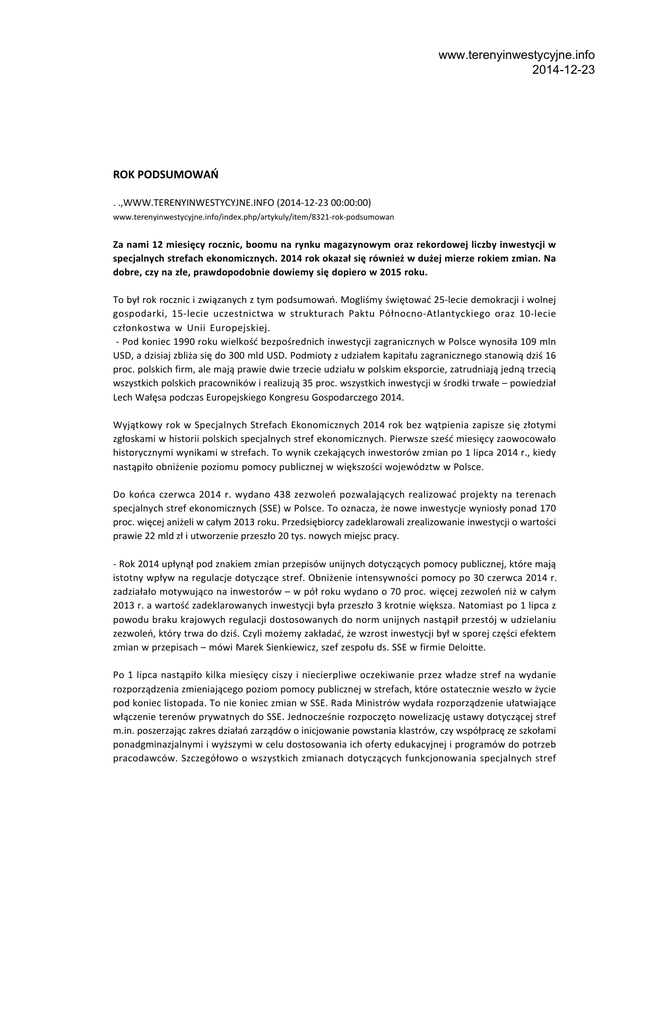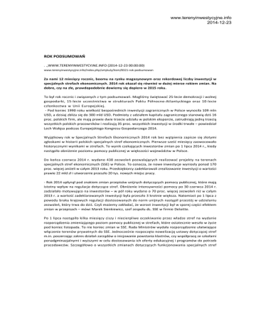 www.terenyinwestycyjne.info 2014-12-23 ROK PODSUMOWAŃ . .,WWW.TERENYINWESTYCYJNE.INFO (2014-12-23 00:00:00) www.terenyinwestycyjne.info/index.php/artykuly/item/8321-rok-podsumowan Za nami 12 miesięcy rocznic, boomu na rynku magazynowym oraz rekordowej liczby inwestycji w specjalnych strefach ekonomicznych. 2014 rok okazał się również w dużej mierze rokiem zmian. Na dobre, czy na złe, prawdopodobnie dowiemy się dopiero w 2015 roku. To był rok rocznic i związanych z tym podsumowań. Mogliśmy świętować 25-lecie demokracji i wolnej gospodarki, 15-lecie uczestnictwa w strukturach Paktu Północno-Atlantyckiego oraz 10-lecie członkostwa w Unii Europejskiej. - Pod koniec 1990 roku wielkość bezpośrednich inwestycji zagranicznych w Polsce wynosiła 109 mln USD, a dzisiaj zbliża się do 300 mld USD. Podmioty z udziałem kapitału zagranicznego stanowią dziś 16 proc. polskich firm, ale mają prawie dwie trzecie udziału w polskim eksporcie, zatrudniają jedną trzecią wszystkich polskich pracowników i realizują 35 proc. wszystkich inwestycji w środki trwałe – powiedział Lech Wałęsa podczas Europejskiego Kongresu Gospodarczego 2014. Wyjątkowy rok w Specjalnych Strefach Ekonomicznych 2014 rok bez wątpienia zapisze się złotymi zgłoskami w historii polskich specjalnych stref ekonomicznych. Pierwsze sześć miesięcy zaowocowało historycznymi wynikami w strefach. To wynik czekających inwestorów zmian po 1 lipca 2014 r., kiedy nastąpiło obniżenie poziomu pomocy publicznej w większości województw w Polsce. Do końca czerwca 2014 r. wydano 438 zezwoleń pozwalających realizować projekty na terenach specjalnych stref ekonomicznych (SSE) w Polsce. To oznacza, że nowe inwestycje wyniosły ponad 170 proc. więcej aniżeli w całym 2013 roku. Przedsiębiorcy zadeklarowali zrealizowanie inwestycji o wartości prawie 22 mld zł i utworzenie przeszło 20 tys. nowych miejsc pracy. - Rok 2014 upłynął pod znakiem zmian przepisów unijnych dotyczących pomocy publicznej, które mają istotny wpływ na regulacje dotyczące stref. Obniżenie intensywności pomocy po 30 czerwca 2014 r. zadziałało motywująco na inwestorów – w pół roku wydano o 70 proc. więcej zezwoleń niż w całym 2013 r. a wartość zadeklarowanych inwestycji była przeszło 3 krotnie większa. Natomiast po 1 lipca z powodu braku krajowych regulacji dostosowanych do norm unijnych nastąpił przestój w udzielaniu zezwoleń, który trwa do dziś. Czyli możemy zakładać, że wzrost inwestycji był w sporej części efektem zmian w przepisach – mówi Marek Sienkiewicz, szef zespołu ds. SSE w firmie Deloitte. Po 1 lipca nastąpiło kilka miesięcy ciszy i niecierpliwe oczekiwanie przez władze stref na wydanie rozporządzenia zmieniającego poziom pomocy publicznej w strefach, które ostatecznie weszło w życie pod koniec listopada. To nie koniec zmian w SSE. Rada Ministrów wydała rozporządzenie ułatwiające włączenie terenów prywatnych do SSE. Jednocześnie rozpoczęto nowelizację ustawy dotyczącej stref m.in. poszerzając zakres działań zarządów o inicjowanie powstania klastrów, czy współpracę ze szkołami ponadgminazjalnymi i wyższymi w celu dostosowania ich oferty edukacyjnej i programów do potrzeb pracodawców. Szczegółowo o wszystkich zmianach dotyczących funkcjonowania specjalnych stref www.terenyinwestycyjne.info 2014-12-23 ekonomicznych można przeczytać w tekście „Czas zmian dla specjalnych stref ekonomicznych”. Tereny Inwestycyjne: Dobry rok dla kupujących 2014 rok okazał się szczęśliwy dla rynku gruntów pod projekty komercyjne i mieszkaniowe. Jak wynika z prognoz firmy Colliers International, jest szansa, że w 2014 roku wartość transakcji przekroczy tę z 2013 roku. Wśród gruntów inwestycyjnych szczególnym zainteresowaniem cieszyły się działki pod projekty mieszkaniowe, a wśród nieruchomości komercyjnych – w szczególności pod projekty biurowe i handlowe. - Inwestorzy najczęściej analizowali i kupowali grunty pod projekty mieszkaniowe. Na takie inwestycje wydali 70 proc. środków, 25 proc. przeznaczyli na działki pod zabudowę biurowo-handlową, a 5 proc. pod magazyny. Ilość oraz wartość zawartych transakcji w 2014 r. pokazują, że był to bardzo dobry czas dla rynku gruntów inwestycyjnych. Nie oznacza to jednak powrotu do tendencji wzrostowej sprzed 2009 roku, a jedynie systematyczną stabilizację. Silne i zdrowe kapitałowo firmy deweloperskie oraz fundusze inwestycyjne to główne motory napędzające ten segment rynku nieruchomości – uważa Emil Domeracki, starszy specjalista, Grupa Usług Inwestycyjnych, Colliers International. Firmy miały również ułatwiony dostęp do finansowania tych zakupów, co wynikało m.in. z pojawienia się nowych podmiotów finansujących na polskim rynku. - Zmiany na rynkach kapitałowych oraz zainteresowanie Polską nowych funduszy spowodowało, że wielu z graczy na rynku nieruchomości komercyjnych z większą swobodą patrzyło na wydatki zabezpieczające nowe lokalizacje i projekty przemysłowo-magazynowe. Tym samym skierowali swoją uwagę tam, gdzie rynki są mniej nasycone, a klienci potencjalnie zainteresowani nowymi lokalizacjami – mówi Michał Sikora, konsultant ds. Gruntów, Spraw Technicznych i Specjalnych Stref Ekonomicznych, dział powierzchni przemysłowych i magazynowych, Cushman & Wakefield. Kolejną szansą dla kupujących było pojawienie się również gruntów firm mających problemy z kredytami, zwłaszcza hiszpańskich inwestorów m.in. terenów po dawnych zakładach Polleny na warszawskiej Pradze, które trafiły do firmy Okam Capital. - W 2014 r. na sprzedaż trafiła znaczna liczba projektów, których właściciele mają trudności w spłacie wielomilionowych kredytów. W takich przypadkach transakcje mogą przyjąć formę prostej sprzedaży, można się też spodziewać budowania konsorcjów oraz przejmowania kredytów – uzupełnia Emil Domeracki