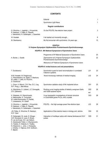Contents / Synchrotron Radiation in Natural Science Vol. 8, No. 1-2 (2009) CONTENTS Editorial I Synchrotron Light News 1 Regular contributions G. Wrochna, J. Jagielski, J. Krzywiński, R. Nietubyć, J. Pełka, E. Pławski, J. Sekutowicz, R. Sobierajski, J. Szewiński On the POLFEL free electron laser project 3 W. Kwiatek It all started out innocently enough… 8 M. Stankiewicz My first encounter with synchrotron. 34 years ago 15 KSUPS-8 8. Krajowe Sympozjum Użytkowników Promieniowania Synchrotronowego KSUPS-8 - 8th National Symposium of Synchrotron Users A. Burian, J. Szade Programme of 8th National Symposium of Synchrotron Users 20 Zaproszenie na 8. Krajowe Sympozjum Użytkowników Promieniowania Synchrotronowego 22 Welcome to 8th National Symposium of Synchrotron Users KSUPS-8: invited lectures and oral presentations T. Durakiewicz Synchrotron quest for band renormalization in correlated f-electron systems L01 23 W.M. Kwiatek, M. Podgórczyk, C. Paluszkiewicz, M. Gajda, Z. Stachura, M. Lekka, J. Lekki, M. Piccinini, D. Grolimund Novel microscopy methods of medical imaging L02 24 L. Chow, A. Misiuk, C.W. Pao, D.C. Ling, W.F. Pong, J. Bak-Misiuk Synchrotron radiation study of Mn implanted silicon O01 25 A. Wierzbicka, D. Lübbert, J.Z. Domagała, Z.R. Żytkiewicz Rocking curve imaging studies of latelarly overgrown GaAs and GaSb epitaxial layers O02 26 K. Wieteska, W. Wierzchowski, A. Malinowska, S. Turczyński, M. Lefeld-Sosnowska, D. Pawlak, T. Łukasiewicz, W. Graeff X-ray topographic investigations of domain structure in Czochralski grown PrxLa1-xAlO3 crystals O03 28 G. Wrochna, J. Jagielski, J. Krzywiński, R. Nietubyć, J. Pełka, E. Pławski, J. Sekutowicz, R. Sobierajski, J. Szewiński POLFEL – the high average power free electron laser L03 29 J.B. Pełka, G. Wrochna, R. Nietubyć, K.R. Tybor Applications of free electron lasers in biology and edicine O04 30 R. Sobierajski, M. Jurek, D. Klinger, A.R. Khorsand, E. Louis, S. Bruijn, R. van de Kruijs, E.D. van Hattum, K. Sokolowski-Tinten, U. Shymanovich, S. Toleikis, H. Wabnitz, K. Tiedtke, N. Stojanovic, L. Juha, J. Chalupsky, J. Cihelka, V. Hajkova, E.M. Gullikson, F. Bijkerk Interaction of multilayer optics with intense femtosecond XUV pulses O05 31 II ext Contents / Synchrotron Radiation in Natural Science Vol. 8, No. 1-2 (2009) P. Zajdel, I. Kruk, P.-Y. Hsieh, W. van Beek, M.A. Green Local and long range orders in transition metal oxides and selenides and metal organic frameworks studied using combined techniques (XRD and in-situ Raman) L04 32 M. Sikora Study of magnetism with XMCD and XES L05 33 K. Lawniczak-Jablonska, A. Wolska, M.T. Klepka, J. Sadowski, A. Barcz, A. Hallen, D. Arvanitis Charakteryzacja nano-wydzieleń w matrycach na bazie GaSb L06 34 Characterisation of nanoinclusions in GaSb-based matrices ext M. Kozak Small angle scattering of synchrotron radiation studies of biomembranes L07 36 S. Krzywda, W. Białek, A. Szczepaniak, M. Jaskólski Atomic-resolution structure of cyanobactrial cytochrome c6 with an unusual sequence insertion L08 37 H. Drozdowski, A. Romaniuk, Z. Błaszczak Short−range ordering in ortho−chloroanisole at 293 K by x−ray diffraction O06 38 K. Mazur, W. Wierzchowski, K. Wieteska, W. Hofman, K. Kościewicz, W. Strupiński, W. Graeff X-ray reflectometric investigation of surface roughnes of SiC substrate wafers and its influence on the structural perfection of the deposited SiC epitaxial layers O07 39 R. Przeniosło Badania struktury tlenków metali przejściowych metodą dyfrakcji neutronów i promieniowania synchrotronowego L09 40 Studies of structure of transition metal oxides with the methods of neutron diffraction and synchrotron radiation E.A. Görlich, K. Królas, M. Młynarczyk, M.J. Stankiewicz, K. Tomala 41 Informacja na temat rozwiązań technicznych i stanu przygotowań do budowy synchrotronu w Polsce Information on technical solutions and preparations to synchrotoron construction in Poland J. Szade, B. Orłowski, B. Kowalski, E.A. Görlich, K. Tomala, P. Starowicz 42 Pierwsza linia na polskim synchrotronie – spektroskopie miękkiego promieniowania rentgenowskiego First beamline at the Polish synchrotron: Spectroscopies of soft X-rays KSUPS-8: poster presentations M. Kowalik, R. Zalecki, A. Kołodziejczyk Electronic states of collosal magnetoresistive manganites La0.67Pb0.33Mn1-xFexO3 from photoemission spectroscopy P01 43 A. Malinowska, E. Wierzbicka, M. Lefeld-Sosnowska, K. Wieteska, W. Wierzchowski, T. Łukasiewicz, M. Świrkowicz, W. Graeff Defect structure formed at different stages of growth process in erbium, calcium and holmium doped YVO4 crystals P02 44 M. Szczerbowska-Boruchowska, M. Lankosz, A. Smykla, D. Adamek Synchrotron radiation as a tool of biochemical analysis in brain cancers P03 45 J. Wolny, M. Duda, B. Kozakowski Complex structure of Mg2Al3 β and β’ phases P04 46 E. Dynowska, W. Szuszkiewicz, C. Ziereis, J. Geurts, S. Müller, C. Ronning, J. Domagala, P. Romanowski, W. Caliebe Structural studies of heavily transition metal implanted ZnO P05 47 H. Grigoriew, L. Wiegert, A. Boczkowska Dynamic SAXS correlation as method of structural research P06 48 M.T. Klepka, K. Lawniczak-Jablonska, A. Wolska Badania absorpcyjne zmodyfikowanych chemicznie chitozanów z żelazem P07 49 Absorption studies of chemically modified Fecontaining chitosans III Contents / Synchrotron Radiation in Natural Science Vol. 8, No. 1-2 (2009) A. Wolska, K. Lawniczak-Jablonska, M.T. Klepka, A. Barcz, A. Hallen, D. Arvanitis Lokalne otoczenie jonów manganu implantowanych w kryształach GaSb A. Wolska, K. Lawniczak-Jablonska, M.T. Klepka, J. Sadowski Wytrącenia MnSb w matrycy GaSb wytwarzane przy pomocy metody MBE P08 50 ext Local environment of manganese ions implanted into GaSb crystals P09 52 ext MnSb precipitates in GaSb matrix, produced using the MBE methhod J. Bak-Misiuk, P. Romanowski, E. Dynowska, J.Z. Domagala, J. Sadowski,T. Wojciechowski, R. Jakiela, W. Wierzchowski, K. W
