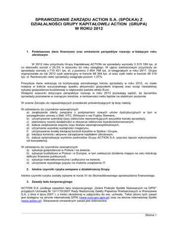 SPRAWOZDANIE ZARZĄDU ACTION S.A. (SPÓŁKA) Z DZIAŁALNOŚCI GRUPY KAPITAŁOWEJ ACTION (GRUPA) W ROKU 2012 1. Podstawowe dane finansowe oraz omówienie perspektyw rozwoju w bieżącym roku obrotowym W 2012 roku przychody Grupy Kapitałowej ACTION ze sprzedaży wyniosły 3 515 189 tys. zł co stanowiło wzrost o 25,3% w stosunku do roku ubiegłego. W ujęciu wartościowym przychody ze sprzedaży wzrosły o 710 421 tys. zł, z poziomu 2 804 768 tys. zł osiągniętych w roku 2011. Grupa wypracowała za rok 2012 zysk operacyjny w kwocie 68 264 tys. zł oraz zysk netto w kwocie 48 319 tys. zł. Rentowność netto sprzedaży osiągnęła poziom 1,37%. Powyższe dane wskazują na kontynuację wzrostowego trendu sprzedaży w roku 2012, co miało miejsce w trakcie wyczuwalnego spadku aktywności gospodarki krajowej oraz wciąż niestabilnej sytuacji gospodarczo-budżetowej w większości państw strefy Euro. Wstępne szacunki dotyczące perspektyw rozwoju w roku 2013 pozwalają sądzić, że dynamika sprzedaży pozostanie w rosnącym trendzie, a rentowności netto będzie na stabilnym poziomie. W ocenie Zarządu do najważniejszych przesłanek potwierdzających tę tezę należą: W odniesieniu do czynników wewnętrznych a) zwiększenie oferty związane z podpisaniem nowych umów dystrybucyjnych w tym w szczególności umowy z Dell, HTC, Whirpool o raz Fujitsu Siemens, b) utrzymywanie szerokiej bazy odbiorców reprezentujących wszystkie kanały sprzedaży, c) planowany rozwój działalności w obszarze odbiorców wysokowolumenowych, d) dalsze zwiększenie exportu oraz dostaw wewnątrzwspólnotowych, e) utrzymanie wysokiej wydajności magazynu, f) utrzymywanie ścisłej bieżącej kontroli kosztów w Spółce i Grupie, g) bieżąca kontrola i aktywne zarządzanie kapitałem obrotowym, h) dalsza optymalizacja wyników podmiotów Grupy ACTION S.A. poprzez lepsze wykorzystanie ich kompetencji. W odniesieniu do czynników zewnętrznych a) sytuacja gospodarcza w Polsce i na świecie, b) sytuacja budżetowa w Polsce i w Europie, w tym zwłaszcza działania mające na celu redukcję deficytu finansów publicznych, c) sytuacja makroekonomiczna i polityczna na świecie, d) utrzymanie wysokiego popytu na mobilne urządzenia IT. 2. Istotne czynniki ryzyka związane z działalnością Grupy Istotne czynniki ryzyka zostały opisane w nocie 31 do Skonsolidowanego sprawozdania finansowego. 3. Zasady ładu korporacyjnego ACTION S.A. podlega zasadom ładu korporacyjnego „Dobre Praktyki Spółek Notowanych na GPW” przyjętych Uchwałą Nr 12/1170/2007 Rady Nadzorczej Giełdy Papierów Wartościowych w Warszawie S.A. z dnia 4 lipca 2007 r. o treści określonej w załączniku do ww. uchwały. Tekst zbioru tych zasad jest dostępny na stronie internetowej GPW (www.corp-gov.gpw.pl) oraz na stronie internetowej Spółki (www.action.pl). Stosowanie omawianych zasad jest dobrowolne. __________________________________________________________________________________________ Strona 1 Sprawozdanie Zarządu ACTION S.A. za rok 2012 GRUPA KAPITAŁOWA ACTION S.A. (wszystkie kwoty wyrażone są w tys. złotych, o ile nie podano inaczej) Oświadczenie dotyczące stosowania zasad ładu korporacyjnego przez ACTION S.A. w roku 2012, stanowiące załącznik do niniejszego sprawozdania zostanie opublikowane jako oddzielny element raportu rocznego. 4. Informacje o podstawowych grupach towarowych oferowanych przez Grupę oraz ich udziale w sprzedaży ogółem Podstawowym przedmiotem działalności Grupy Kapitałowej ACTION S.A. jest dystrybucja sprzętu komputerowego oraz oprogramowania. Sprzedaż odzwierciedla sytuację rynkową oraz zapotrzebowanie odbiorców. Na podstawie wieloletniego doświadczenia rynkowego, Grupa elastycznie reaguje na zmiany zachodzące w strukturze popytu tak, aby sprostać stale rosnącym wymaganiom klientów. Poniżej struktura sprzedaży w 2012 wraz z danymi porównawczymi. Lp. Nazwa grupy towarowej Wartość sprzedaży w 2012 Wartość sprzedaży w 2011 % % 1 Rozwiązania gotowe 1 387 585 39,47% 1 304 675 46,52% 2 Elektronika użytkowa 1 143 695 32,54% 513 005 18,29% 3 Komponenty 499 135 14,20% 511 986 18,25% 4 Peryferia Materiały biurowe i 4 eksploatacyjne 180 651 5,14% 183 615 6,55% 200 692 5,71% 150 487 5,37% 5 Oprogramowanie 81 810 2,33% 85 694 3,06% 6 Pozostałe Suma przychodów ze sprzedaży produktów, towarów i materiałów 21 621 0,61% 55 306 1,96% 3 515 189 100,00% 2 804 768 100,00% 5. Informacje o rynkach zbytu Podstawowym rynkiem zbytu jest krajowy rynek dystrybucyjny sprzętu komputerowego oraz oprogramowania. W 2012 roku pochodziło z niego 69,91% przychodów netto ze sprzedaży towarów i materiałów. Struktura terytorialna sprzedaży w poszczególnych latach przedstawiała się następująco: Przychody netto ze sprzedaży towarów i materiałów (struktura terytorialna) a) kraj - sprzedaż towarów b) eksport - sprzedaż towarów c) reeksport - sprzedaż towarów d) dostawy UE Suma przychodów netto ze sprzedaży towarów i materiałów Zmiana 2012 2011 15,54% 109,98% 0% 53,71% 2 394 457 223 768 0 806 621 2 072 323 106 568 0 524 770 26,67% 3 424 846 2 703 661 Struktura zarówno odbiorców jak i dostawców Spółki wykazuje duże rozproszenie. Głównymi dostawcami Spółki są światowi producenci sprzętu IT, FOTO oraz RTV/AGD. Największymi kontrahentami Spółki, których udziały w przychodach ze sprzedaży ogółem osiągnęły co najmniej 10% są firmy Samsung Electronics Polska Sp. z o.o. oraz Hewlett Packard. Nie występują powiązania formalne pomiędzy Spółką a wymienionymi firmami inne niż wynikające z zawartych umów handlowych. 6. Informacje o zawartych umowach znaczących dla działalności Grupy 1) Umowa Faktoringu nr SEB/CF 412/12 z dnia 6 luty 2012 r. zawarta pomiędzy ACTION S.A. a SEB Commercial Finance Sp. z o.o. z siedzibą w Warszawie (dalej: SEB CF). Na podstawie powyższej ________________________________________________________________________________