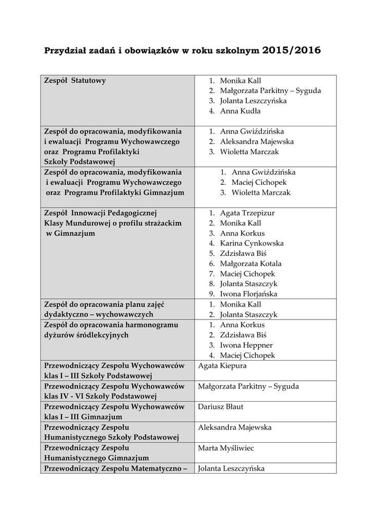 Przydział zadań i obowiązków w roku szkolnym 2015/2016 Zespół Statutowy 1. 2. 3. 4. Zespół do opracowania, modyfikowania i ewaluacji Programu Wychowawczego oraz Programu Profilaktyki Szkoły Podstawowej Zespół do opracowania, modyfikowania i ewaluacji Programu Wychowawczego oraz Programu Profilaktyki Gimnazjum 1. Anna Gwiździńska 2. Aleksandra Majewska 3. Wioletta Marczak Zespół Innowacji Pedagogicznej Klasy Mundurowej o profilu strażackim w Gimnazjum Zespół do opracowania planu zajęć dydaktyczno – wychowawczych Zespół do opracowania harmonogramu dyżurów śródlekcyjnych Przewodniczący Zespołu Wychowawców klas I – III Szkoły Podstawowej Przewodniczący Zespołu Wychowawców klas IV - VI Szkoły Podstawowej Przewodniczący Zespołu Wychowawców klas I – III Gimnazjum Przewodniczący Zespołu Humanistycznego Szkoły Podstawowej Przewodniczący Zespołu Humanistycznego Gimnazjum Przewodniczący Zespołu Matematyczno – Monika Kall Małgorzata Parkitny – Syguda Jolanta Leszczyńska Anna Kudła 1. Anna Gwiździńska 2. Maciej Cichopek 3. Wioletta Marczak 1. Agata Trzepizur 2. Monika Kall 3. Anna Korkus 4. Karina Cynkowska 5. Zdzisława Biś 6. Małgorzata Kotala 7. Maciej Cichopek 8. Jolanta Staszczyk 9. Iwona Florjańska 1. Monika Kall 2. Jolanta Staszczyk 1. Anna Korkus 2. Zdzisława Biś 3. Iwona Heppner 4. Maciej Cichopek Agata Kiepura Małgorzata Parkitny – Syguda Dariusz Błaut Aleksandra Majewska Marta Myśliwiec Jolanta Leszczyńska Przyrodniczego Szkoły Podstawowej Przewodniczący Zespołu Matematyczno – Przyrodniczego Gimnazjum Zespół ds. Promocji Szkoły Maciej Cichopek 1.Dariusz Błaut 2. Anna Korkus 3. Aleksandra Majewska 4. Jolanta Leszczyńska 5. Małgorzata Parkitny – Syguda 6. Kinga Raczyńska 7. Jolanta Staszczyk Opiekuj Samorządu Uczniowskiego Szkoły Podstawowej Opiekuj Samorządu Uczniowskiego Gimnazjum Rzecznik Praw Ucznia Szkoły Podstawowej Rzecznik Praw Ucznia Gimnazjum Dokumentacja wydarzeń szkolnych – kronika Dokumentacja fotograficzna Aleksandra Majewska Dokumentacja filmowa Administrator sieci Mariusz Pisula Dariusz Błaut Protokolant Barbara Błaut Zdzisława Biś Dariusz Błaut Aleksandra Majewska Kinga Raczyńska Justyna Wilk 1. Agnieszka Omazda 2. Iwona Heppner 3. Dariusz Błaut