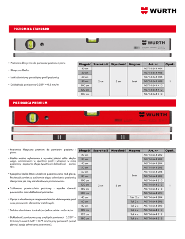 POZIOMICA STANDARD • Poziomica klasyczna do pomiarów poziomu i pionu • Klasyczna libelka • Lekki aluminiowy prostokątny profil poziomicy Długość Szerokość Wysokość Magnes 40 cm A0714 644 404 50 cm A0714 644 405 60 cm A0714 644 406 80 cm • Dokładność pomiarowa 0.029º = 0.5 mm/m Art. nr 2 cm 5 cm brak A0714 644 408 100 cm A0714 644 410 120 cm A0714 644 412 180 cm A0714 644 418 Opak. 1 POZIOMICA PREMIUM • Poziomica klasyczna premium do pomiarów poziomu i pionu. • Libelka wodna wykonanna z wysokiej jakości szkła akrylowego, wmontowana w specjlany profil i wklejona w ramę poziomicy - zapewnia długą żywotność i dokładność pomiarów. • Specjalna libelka która umożliwia poziomowanie nad głową. Pęcherzyk powietrza zachowuje się po odwróceniu poziomicy identycznie jak przy standardowym poziomowaniu. Długość Szerokość Wysokość Magnes 20 cm A0714 644 202 30 cm A0714 644 203 40 cm A0714 644 204 50 cm A0714 644 205 60 cm • Opcja z wbudowanym magnesem bardzo ułatwia pracę podczas pionowania elementów metalowych. • Solidna aluminiowa konstrukcja - jednocześnie mały ciężar. • Dokładność pomiarowa przy zwykłych pomiarach 0.029º = 0.5 mm/m oraz 0.043º = 0.75 mm/m przy pomiarach ponad głową ( opcja odwrócona poziomica ). Opak. A0714 644 206 brak 80 cm 100 cm 120 cm • Szlifowana powierzchnia podstawy - wysoka równość powierzchni oraz dokładność pomiarów. Art. nr A0714 644 208 A0714 644 210 2 cm A0714 644 212 5 cm 180 cm A0714 644 218 200 cm A0714 644 220 40 cm Tak 2 x A0714 644 304 60 cm Tak 2 x A0714 644 306 80 cm Tak 2 x A0714 644 308 100 cm Tak 4 x A0714 644 310 120 cm Tak 4 x A0714 644 312 180 cm Tak 6 x A0714 644 318 1