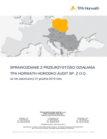 SPRAWOZDANIE Z PRZEJRZYSTOŚCI DZIAŁANIA TPA HORWATH HORODKO AUDIT SP. Z O.O. za rok zakończony 31 grudnia 2015 roku TPA Horwath Horodko Audit Sp. z o.o. Audyt i doradztwo biznesowe Członek Crowe Horwath International ul. Murawa 12-18 61-655 Poznań Tel.: +48 61 63 00 500 Fax: +48 61 63 00 532 ul. Przyokopowa 33 01-208 Warszawa Tel.: +48 22 647 97 00 Fax: +48 22 647 97 01 al. Korfantego 141 B 40-154 Katowice Tel: +48 32 73 20 000 Fax: +48 32 73 20 002 [email protected], www.tpa-horwath.pl Sąd Rejonowy w Poznaniu, Nowe Miasto i Wilda w Poznaniu, VIII Wydział Gospodarczy, KRS 0000245198 NIP: 778-143-20-33, REGON: 300184858, Kapitał zakładowy: 225 000,00 zł Albania | Austria | Bułgaria | Chorwacja | Czechy | Polska | Rumunia | Serbia | Słowacja | Słowenia | W ęgry Sukces to kwestia właściwego Partnera ZAANGAŻOWANIE TPA Horwath to godny zaufania partner prowadzący działalność w zakresie audytu, strategicznego doradztwa podatkowego, doradztwa biznesowego oraz outsourcingu księgowego. TPA Horwath w Polsce funkcjonuje od 2005 roku, a w biurach w Poznaniu, Warszawie i Katowicach zatrudnionych jest ponad 150 osób. Naszą misją jest zapewnienie klientom odpowiedniego poziomu bezpieczeństwa i efektywności gospodarowania oraz ich funkcjonalne odciążenie w tych obszarach, które mogą nam powierzyć, dzięki czemu mogą koncentrować się na własnych celach strategicznych. WSPÓŁPRACA ROZWÓJ Oferujemy kompleksowe rozwiązania biznesowe z zakresu: audytu finansowego strategicznego doradztwa podatkowego doradztwa transakcyjnego outsourcingu księgowego i administracji płacowej corporate finance oraz doradztwa personalnego. Specjalizujemy się w doradztwie dla przedsiębiorstw z branż: WZROST Nieruchomości i budownictwo Energetyka Handel i dystrybucja Hotelarstwo i turystyka. Staramy się być jak najbliżej naszych klientów, pozyskując wszelką dostępną wiedzę na temat ich przedsiębiorstwa i zwiększając kompetencję branżową w wybranych specjalizacjach. Każde działanie inicjujemy rzetelnym rozpoznaniem potrzeb klienta. Koncentrujemy się na sprawach istotnych i zawsze poszukujemy wartości dodanej, jaką musi nieść ze sobą nasz udział w projekcie. Wyznawane przez nas wartości to kluczowy element realizacji zadań Tworzymy trwałe relacje na szczeblu lokalnym jak i międzynarodowym dzięki czemu możemy specjalizować się w wybranych sektorach gospodarki. Wierzymy, że razem zdecydowanie lepiej zrealizujemy nasze cele, a także efektywniej zaspokoimy potrzeby klientów. Systematyczny rozwój pozwoli nam na poszerzanie wiedzy i doświadczenia oraz na zgłębienie otoczenia biznesowego naszych klientów i na szybką adaptację do nowych okoliczności. Mamy świadomość, że nieustanny wzrost jakości naszych usług, zarówno w lokalnych biurach, jak i w globalnej strukturze, to główny czynnik warunkujący rozwój firmy i kształtujący naszą przyszłość. element realizacji zadań. Poznań, dnia 31 marca 2016 roku Szanowni Państwo, Uważnie obserwujemy dynamicznie zmieniające się otoczenie prawne i biznesowe. Gospodarka stawia coraz większe wymagania co do wiarygodności, bezstronności, profesjonalizmu oraz zaufania do informacji prezentowanych na rynkach publicznych. Obowiązujące przepisy prawne dążą do tego, aby efektywnie wspierać system zaufania publicznego, który stanowi podstawę rozwoju rynków kapitałowych oraz ekonomicznych. Mając za cel etyczne, należyte i bezstronne działanie pragniemy, aby nadzór publiczny, a także wszystkie podmioty uprawnione do wykonywania czynności rewizji finansowej służyły zapewnieniu przejrzystości informacji dla wszystkich podmiotów działających na rynku. Zgodnie z Dyrektywą Unii Europejskiej nr 43 w sprawie ustawowych badań rocznych sprawozdań finansowych i skonsolidowanych sprawozdań finansowych (Dyrektywa UE w sprawie audytu) oraz art. 88 Ustawy z dnia 7 maja 2009 roku o biegłych rewidentach, ich samorządzie, podmiotach uprawnionych do badania sprawozdań finansowych oraz o nadzorze publicznym (Dz. U. 2009, nr 77, poz. 649), (Ustawa i biegłych rewidentach) nałożony został obowiązek sporządzania i publikowania sprawozdania z przejrzystości działania przez podmioty uprawnione do wykonywania czynności rewizji finansowej w jednostkach zainteresowania publicznego. Niniejsze sprawozdanie z przejrzystości działania TPA Horwath Horodko Audit Sp. z o.o. sporządzone za rok zakończony 31 grudnia 2015 roku spełnia wymogi określone powyższymi przepisami. Osobą odpowiedzialną za sporządzenie niniejszego sprawozdania jest Krzysztof Horodko, biegły rewident nr 10229. Sprawozdanie z przejrzystości działania TPA Horwath Horodko Audit Sp. z o.o. zawiera opis formalnych aspektów działalności Spółki jak również funkcjonujący system wewnętrznej kontroli jakości, w tym politykę niezależności, politykę w zakresie szkolenia zawodowego. Ponadto załączono informacje finansowe oraz wskazanie jednostki zainteresowania publicznego, w której TPA Horwath Horodko Audit Sp. z o.o. wykonuje czynności rewizji finansowej. Wierzymy, że za pośrednictwem niniejszego sprawozdania wzmocnimy wiarygodność świadczonych przez nas usług oraz zbudujemy pozytywne relacje oparte na zaufaniu i ścisłej współpracy, która w przyszłości wpłynie na wytworzenie prawdziwej wartości dodanej. Krzysztof Horodko Prezes Zarządu TPA Horwath Horodko Audit Sp. z o.o. Partner, Biegły rewident nr 10229 SPIS TREŚCI Informacje dotyczące formy organizacyjno - prawnej oraz struktury własnościowej 6 Wewnętrzny system kontroli jakości 8 Niezależność pracowników 13 Polityka doskonalenia zawodowego biegłych rewidentów 14 Wynagrodzenie kluczowych biegłych rewidentów i członków zarządu 14 Informacje finansowe 15 Ostatnia kontrola w zakresie systemu zapewnienia jakości 16 Wykaz jednostek zainteresowania publicznego, dla których TPA Horwath Horodko Audit sp. z o.o. wykonywała czynno