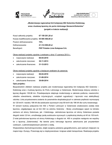 „Modernizacja regionalnej linii kolejowej 402 Goleniów-Kołobrzeg wraz z budową łącznicy do portu lotniczego Szczecin/Goleniów” (projekt w trakcie realizacji) Koszt całkowity projektu: 67 159 261,20 zł Koszty kwalifikowalne projektu: 55 085 460,00 zł Poziom dofinansowania: 75% Dofinansowanie: 41 314 095,00 zł Beneficjent: PKP Polskie Linie Kolejowe S.A. Okres realizacji projektu zgodnie z aneksem z dnia 17 czerwca 2013 r.: rozpoczęcie realizacji: 06-04-2010 zakończenie rzeczowe: 30-11-2013 zakończenie finansowe: 31-12-2013 Okres realizacji projektu zgodnie z bieżącym aneksem do zawarcia: rozpoczęcie realizacji: 06-04-2010 zakończenie rzeczowe: 31-08-2014 zakończenie finansowe: 30-09-2014 Opis projektu: Bezpośrednim efektem realizacji projektu jest modernizacja regionalnej linii kolejowej 402 Goleniów – Kołobrzeg wraz z budową łącznicy do Portu Lotniczego w Goleniowie. Modernizacja dotyczy odcinka o łącznej długości 100,96 km. Przedsięwzięcie obejmuje modernizację w zakresie podtorza, nawierzchni, układów odwodnienia, obiektów inżynieryjnych, urządzeń sygnalizacji i łączności oraz elektryfikacji odcinka. Linia przystosowana zostanie do parametrów eksploatacyjnych w zakresie prędkości wynoszącej do 120 km/h i nacisku 196 kN dla autobusów szynowych oraz 80 km/h dla 196 kN dla ruchu towarowego. W ramach budowy połączenia linii 402 z Portem Lotniczym w Goleniowie zrealizowane zostały dwie łącznice, odgałęziające się od linii 402 na odcinku Goleniów - Mosty umożliwiające wjazd na lotnisko zarówno od strony Goleniowa, jak i Kołobrzegu. Jednotorowa łącznica od strony Goleniowa posiada długość około 3,9 km, umożliwiając jazdę autobusów szynowych z prędkością lokalną od 40 do 100 km/h. Z kolei jednotorowa łącznica od strony Kołobrzegu o długości ok. 400 m przejdzie następnie we wspólny tor z łącznicą „Goleniowską”. Na terenie portu lotniczego łącznica zakończona jest przystankiem czołowym, z jednokrawędziowym peronem z wiatą. Województwo Zachodniopomorskie, dzięki swojemu położeniu geograficznemu, jest ważnym miejscem na mapie kraju i Europy. Przecinają się tu międzynarodowe i krajowe szlaki transportowe. Realizacja projektu pozwoli w pełni wykorzystać ten potencjał i w przyszłości przyniesie wymierne efekty dla społeczeństwa i regionu. W wyniku modernizacji ulegnie zmniejszeniu liczba ograniczeń szybkości biegu pociągów, skróci się czas przejazdu, poprawi się stan infrastruktury kolejowej oraz bezpieczeństwo prowadzenia ruchu kolejowego. W dniu 10 lipca 2013 roku w Zarząd Województwa wyraził zgodę na rozszerzenie zakresu rzeczowego projektu o budowę światłowodu na linii kolejowej nr 402 Koszalin – Goleniów na odcinku Gryfice – Nowogard – Goleniów, całkowity koszt zmiany zostanie pokryty z oszczędności powstałych w trakcie realizacji projektu i wyniesie ok. 2 000 000,00 PLN. Kolejne rozszerzenie zakresu projektu oraz zmiana terminu realizacji projektu 16 września 2013 r. PKP Polskie Linie Kolejowe Spółka Akcyjna zwróciła się z kolejną prośbą o wyrażenie zgody na rozszerzenie zakresu rzeczowego projektu o modernizację peronów, zabudowę wiat przystankowych, oświetlenia oraz elementów małej infrastruktury na przystankach osobowych w Osinie i Żabowie (w przypadku peronu w Żabowie przewidziano również zmianę jego lokalizacji). Powyższy zakres ma być wykonany w ramach zadań Dokumentacja techniczna oraz Roboty budowlane. Do wniosku o rozszerzenie zakresu została dołączona korespondencja Urzędu Gminy w Nowogardzie oraz wniosek radnego powiatu Goleniowskiego do Beneficjenta z prośbą o wykonanie wnioskowanego zakresu prac uzasadniające, iż powyższe zmiany wpłyną na poprawę dostępności mieszkańców do transportu kolejowego. Dodatkowo pismem z dnia 17 września 2013 r. Wydział Infrastruktury i Transportu UMWZ, jako organizator kolejowych przewozów pasażerskich poparł wniosek Beneficjenta uzasadniając, że potrzeba wykonania wymienionych robót była wielokrotnie podnoszona zarówno przez mieszkańców jak i władze wymienionych miejscowości. Przewidziany koszt robót w wysokości ok. 1 000 000,00 PLN zostanie pokryty z oszczędności powstałych w trakcie postepowania przetargowego na wykonanie prac projektowych i budowlanych dla wykonania światłowodów na linii kolejowej nr 402 Koszalin – Goleniów na odcinku Gryfice – Nowogard – Goleniów. W związku z faktem, że przed rozpoczęciem prac konieczne jest sporządzenie przez Beneficjenta projektu budowalnego oraz uzyskanie pozwolenia na budowę, konieczne jest wydłużenie okresu realizacji projektu o kolejne 9 miesięcy. Zarząd Województwa na posiedzeniu w dniu 22 października 2013 roku przychylił się do wniosku Beneficjenta. Projekt realizowany jest w ramach osi 2 Rozwój infrastruktury transportowej i energetycznej, Działanie 2.1 Zintegrowany system transportowy województwa, Poddziałanie 2.1.7 Regionalny transport kolejowy – Schemat A Infrastruktura kolejowa Regionalnego Programu Operacyjnego Województwa Zachodniopomorskiego na lata 2007 - 2013. Oprac. Wydział Wdrażania RPO Listopad 2013 r. 2