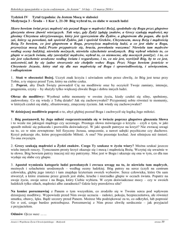 Rekolekcje ignacjańskie w życiu codziennym „Ja Jestem” 14 luty – 13 marca 2016 r Tydzień IV Tytuł tygodnia: Ja Jestem Mocą w słabości Medytacja 3 - Środa – 1 Kor 1, 21-30 Bóg wybrał to, co słabe w oczach ludzi Skoro bowiem świat przez mądrość nie poznał Boga w mądrości Bożej, spodobało się Bogu przez głupstwo głoszenia słowa zbawić wierzących. Tak więc, gdy Żydzi żądają znaków, a Grecy szukają mądrości, my głosimy Chrystusa ukrzyżowanego, który jest zgorszeniem dla Żydów, a głupstwem dla pogan, dla tych zaś, którzy są powołani, tak spośród Żydów, jak i spośród Greków, Chrystusem, mocą Bożą i mądrością Bożą. To bowiem, co jest głupstwem u Boga, przewyższa mądrością ludzi, a co jest słabe u Boga, przewyższa mocą ludzi. Przeto przypatrzcie się, bracia, powołaniu waszemu! Niewielu tam mędrców według oceny ludzkiej, niewielu możnych, niewielu szlachetnie urodzonych. Bóg wybrał właśnie to, co głupie w oczach świata, aby zawstydzić mędrców, wybrał to, co niemocne, aby mocnych poniżyć; i to, co nie jest szlachetnie urodzone według świata i wzgardzone, i to, co nie jest, wyróżnił Bóg, by to co jest, unicestwić, tak by się żadne stworzenie nie chełpiło wobec Boga. Przez Niego bowiem jesteście w Chrystusie Jezusie, który stał się dla nas mądrością od Boga i sprawiedliwością, i uświęceniem, i odkupieniem 1. Stań w obecności Bożej. Uczyń znak krzyża i uświadom sobie przez chwilę, że Bóg jest teraz przy Tobie, a ty stajesz przed Tym, który na ciebie czeka. 2. Poproś, aby Duch Święty prowadził Cię na modlitwie oraz by oczyścił Twoje zamiary, intencje, pragnienia, czyny – by służyły tylko większej chwale Boga i dobru innych ludzi. Obraz do modlitwy: Wyobraź sobie momenty w swoim życiu, kiedy czułeś się silny, spełniony, zadowolony. Co się wtedy z Tobą działo? Jak się zachowywałeś? Przypomnij sobie również te momenty, w których czułeś się słaby, sfrustrowany, zmęczony życiem. Jak wtedy się zachowywałeś? W dzisiejszej modlitwie poproś o to, abyś głębiej poznał Boga i zachwycił się logiką Jego miłości. 1. Bóg postanowił, by Jego miłość rozprzestrzeniała się w świecie poprzez głupstwo głoszenia Słowa i to wcale nie jakiegoś mądrego czy uczonego. Prostego słowa mówiącego o krzyżu – czyli o tym, w jaki sposób miłość się pokazała i pozwoliła doświadczyć. W jaki sposób patrzysz na krzyż? Nie zwracaj uwagi na to, co w nim zewnętrzne: ból fizyczny Jezusa, umęczenie, a nawet udręki psychiczne czy duchowe. Krzyż pokazuje zło, które przygwoździło Miłość. A ona? Nie przestaje kochać. Jest silniejsza niż śmierć. To ona zwycięża. 2. Grecy szukają mądrości a Żydzi znaków. Czego Ty szukasz w życiu wiary? Można szukać jeszcze wielu innych rzeczy. Tymczasem prosty krzyż okazuje się i mocą i mądrością Bożą. Wczytaj się uważnie w te słowa. Bóg bowiem patrzy inaczej niż my patrzymy. Moc jest w Bogu i ukazuje się ona w tym, co dla nas wydaje się słabe czy głupie. 3. Apostoł wymienia kategorie ludzi powołanych i zwraca uwagę na to, że niewielu tam mądrych, możnych i szlachetnie urodzonych – według oceny ludzkiej. Bóg patrzy na serce (czyli na centrum człowieka, głębię jego istoty) i tam znajduje kryterium swoich wyborów. Serce człowieka, które On sam stworzył, a które zranione przez grzech jest słabe, kruche i nierzadko głupie w oczach świata. Popatrz na swoje życie, swoje serce i na Boga, który Ciebie wybiera. W czym doświadczasz mocy – czy w swoich ludzkich tylko siłach, mądrości albo zaradności? Gdzie leży prawdziwa siła? Na koniec porozmawiaj z Panem o tym wszystkim, co zrodziło się w Twoim sercu pod wpływem dzisiejszej modlitwy. Wypowiedz przed Nim swoje uczucia – radości, pokoju, bezpieczeństwa, ale również smutku, obawy, lęku. Bądź szczery przed Panem. Możesz Mu podziękować za to, co odkryłeś, lub poprosić Go o coś, czego bardzo potrzebujesz. Porozmawiaj z Nim przez chwilę serdecznie – jak przyjaciel z przyjacielem. Odmów Ojcze nasz …… Jezuici i Wspólnota Życia Chrześcijańskiego – Białystok strona 30 Rekolekcje ignacjańskie w życiu codziennym „Ja Jestem” 14 luty – 13 marca 2016 r Zaraz po zakończeniu medytacji lub później zapisz sobie ważniejsze owoce tej modlitwy np. poruszenia lub myśli. Te zapiski mogą Ci pomóc zobaczyć otrzymane dary i drogę, po której Pan Cię prowadzi. Jezuici i Wspólnota Życia Chrześcijańskiego – Białystok strona 31